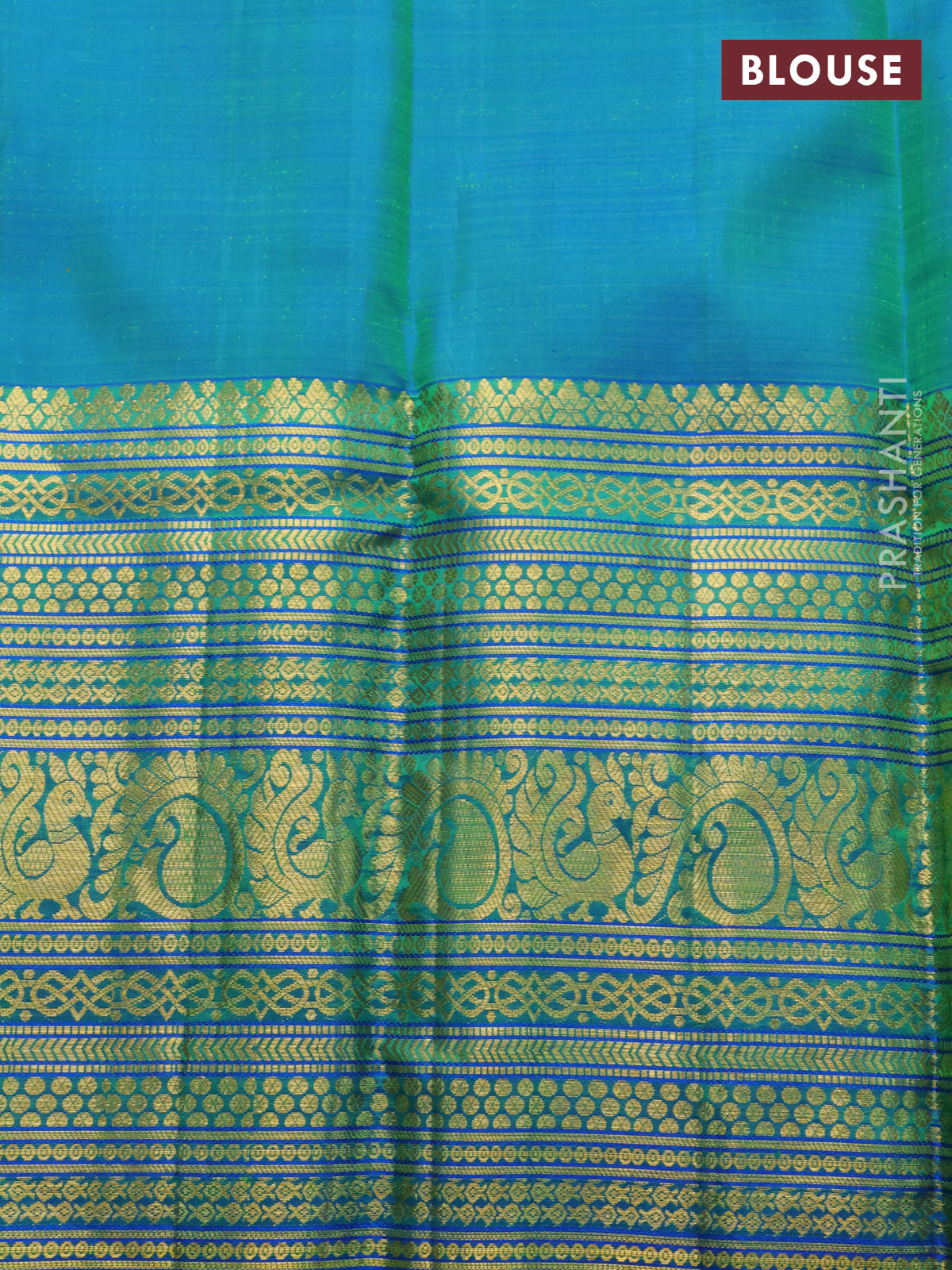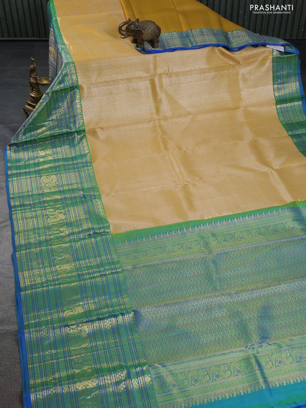 Pure kanchipuram silk saree yellow and blue with allover silver zari woven brocade weaves and long zari woven border