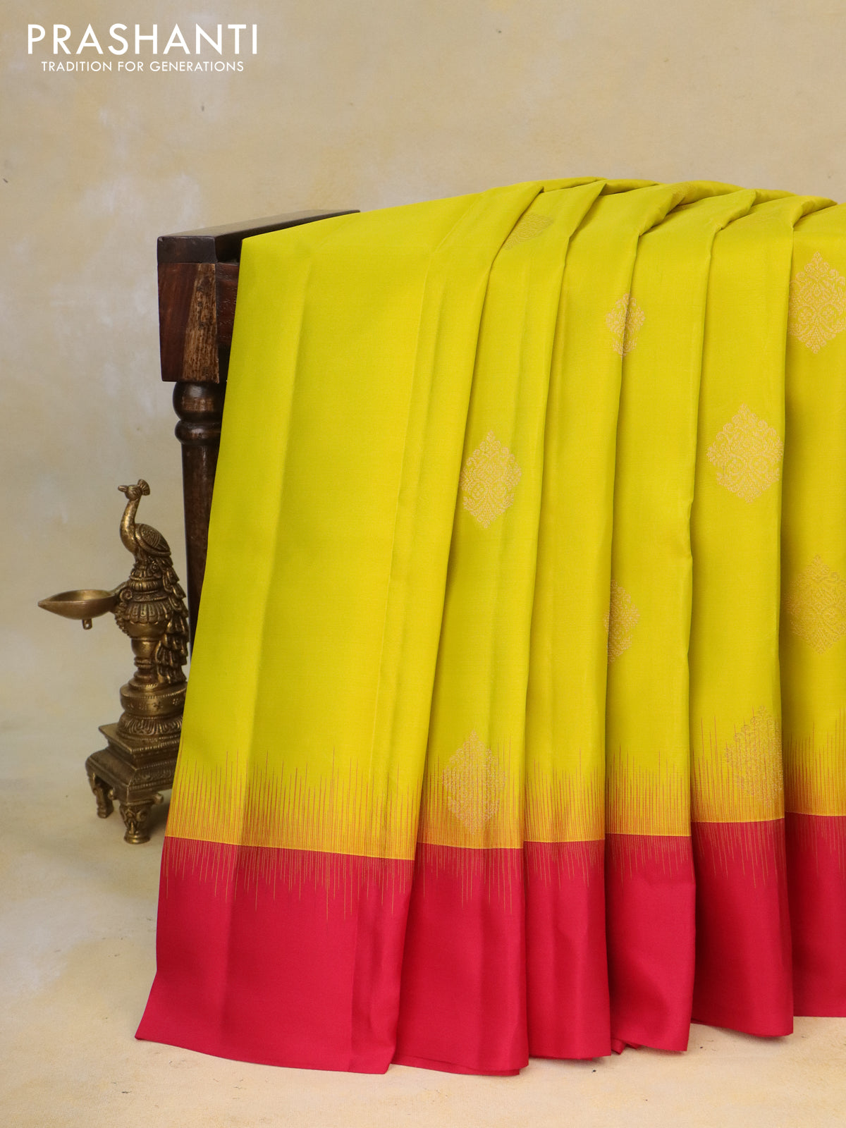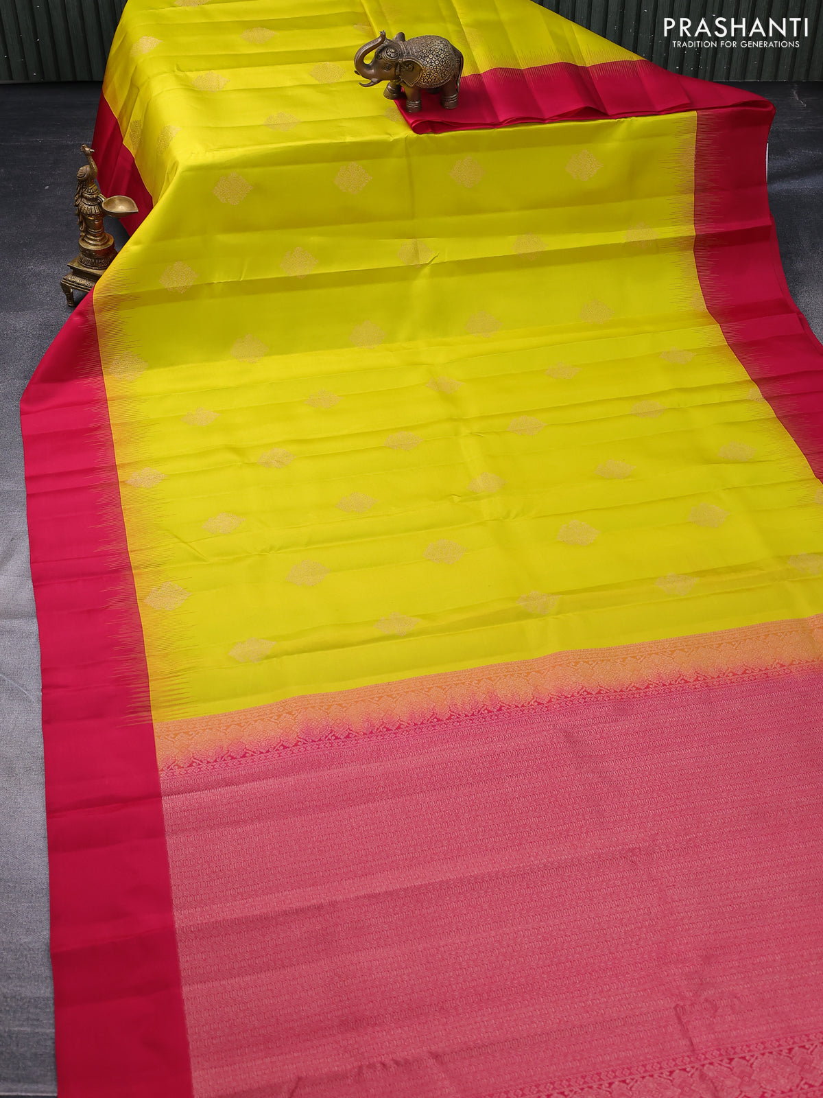 Pure kanchipuram silk saree yellow and dark pink with zari woven buttas and simple border