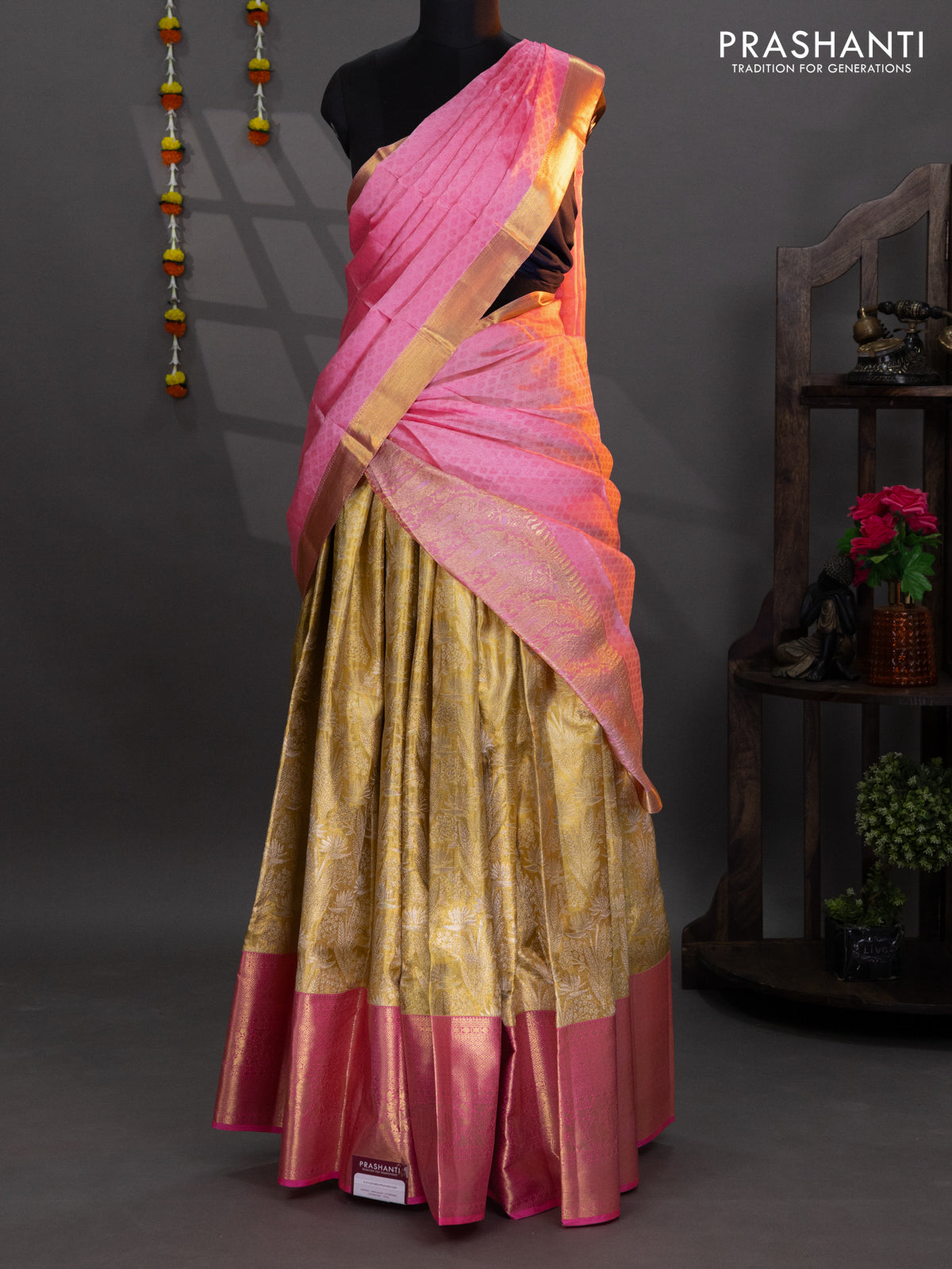 Pure kanchipuram tissue silk lehenga gold and pink with allover brocade weaves and long annam zari woven border