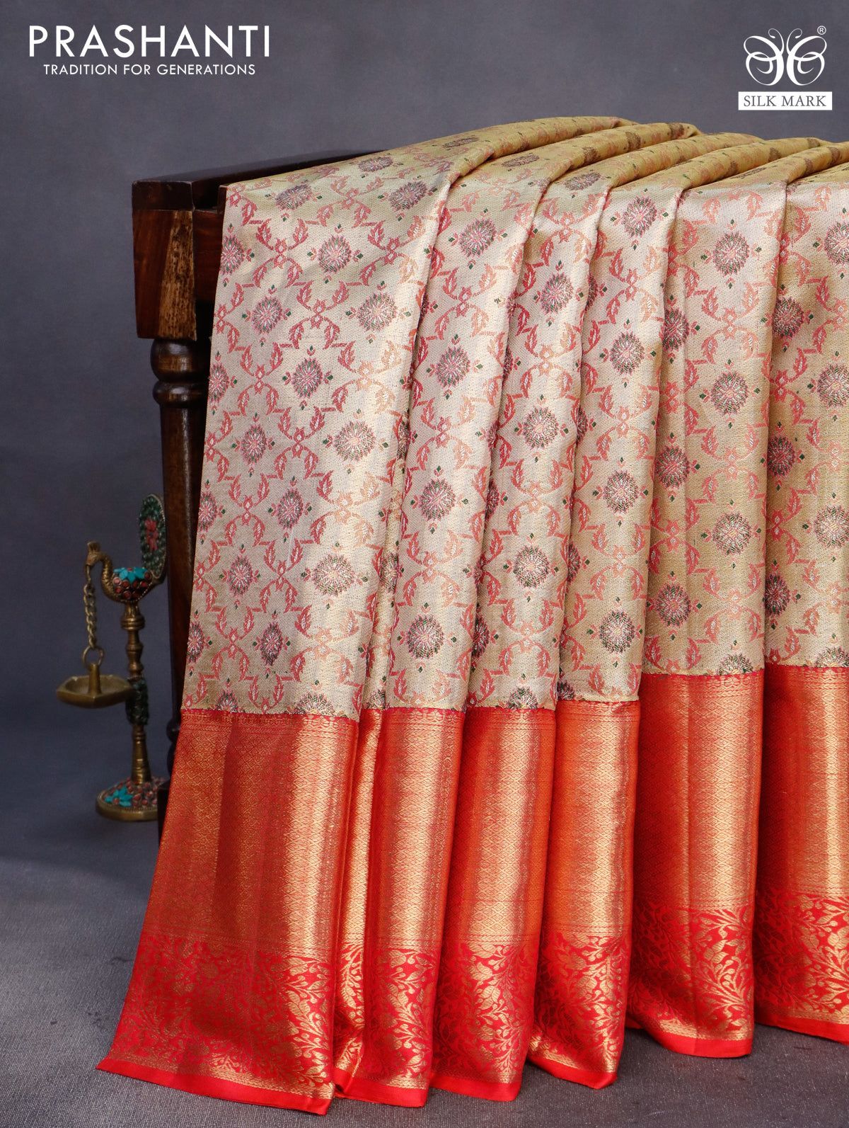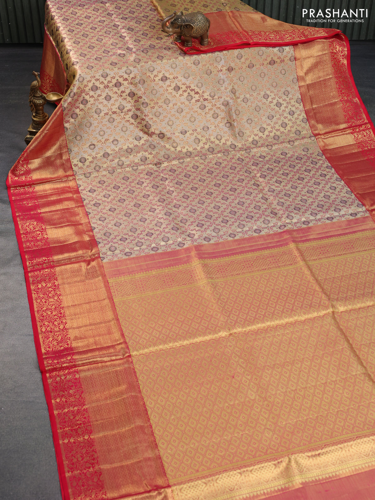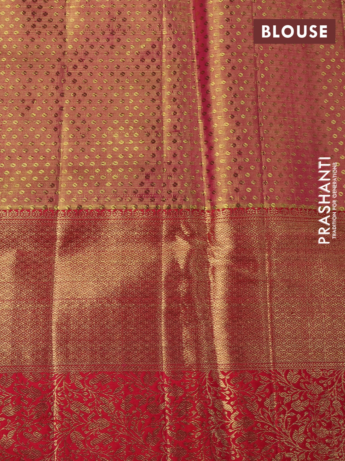 Pure kanchipuram tissue silk saree gold and dual shade of pink with allover zari woven brocade weaves and long rich zari woven border
