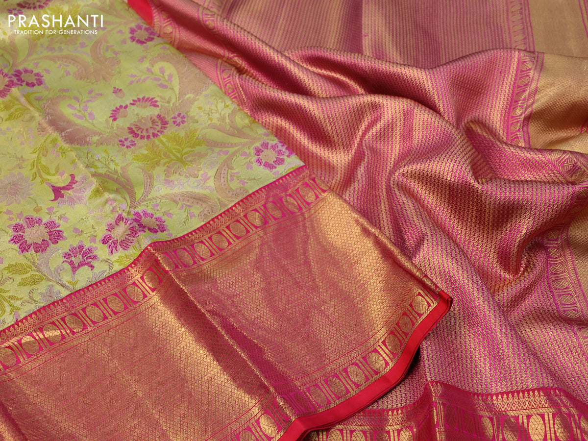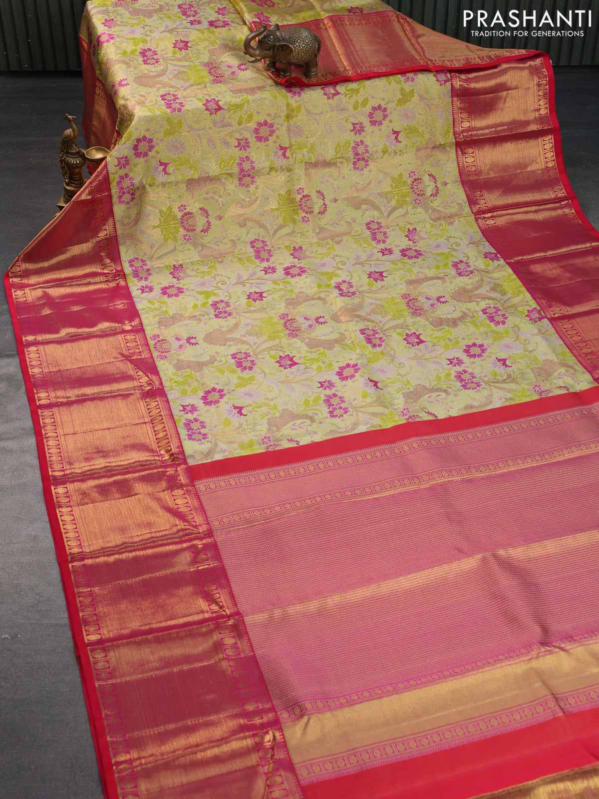 Pure kanchipuram tissue silk saree pista green and dual shade of pinkish red with allover thread & zari woven brocade weaves and long zari woven korvai border