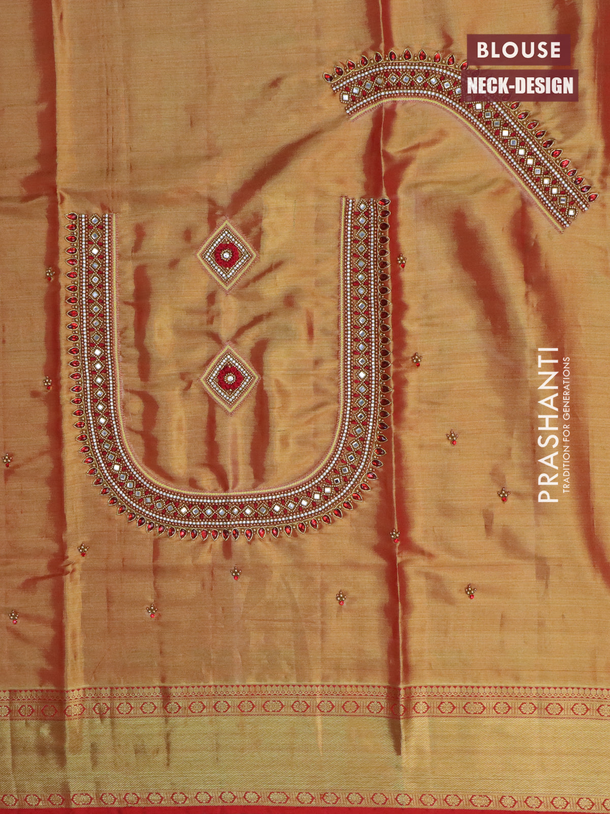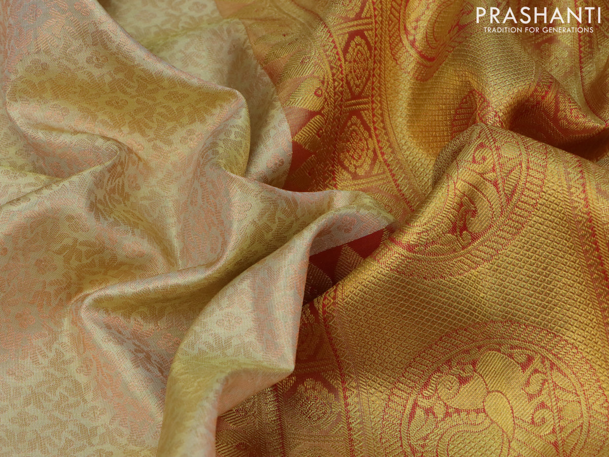 Pure kanchipuram tissue silk saree pista green and red with allover copper zari woven brocade weaves and long zari woven border & aari work blouse