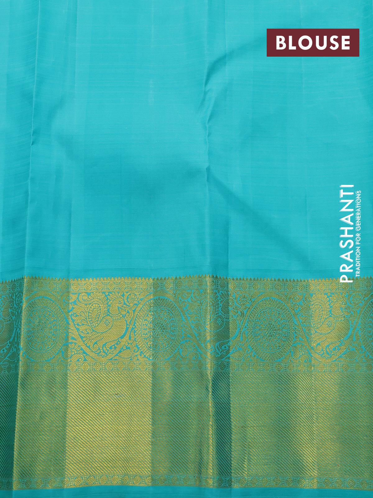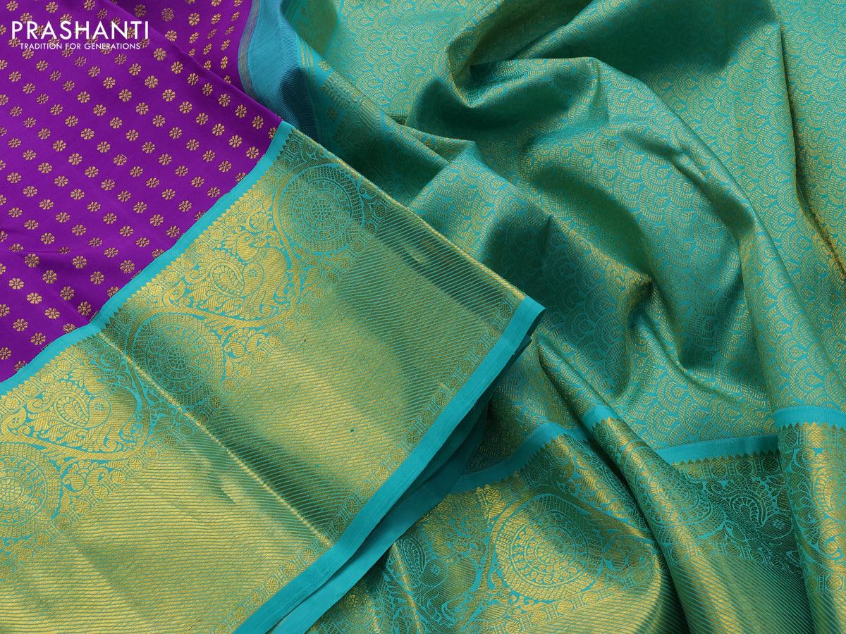 Pure kanjivaram silk saree violet and teal blue with allover zari woven butta weaves and long annam & rudhraksha zari woven border