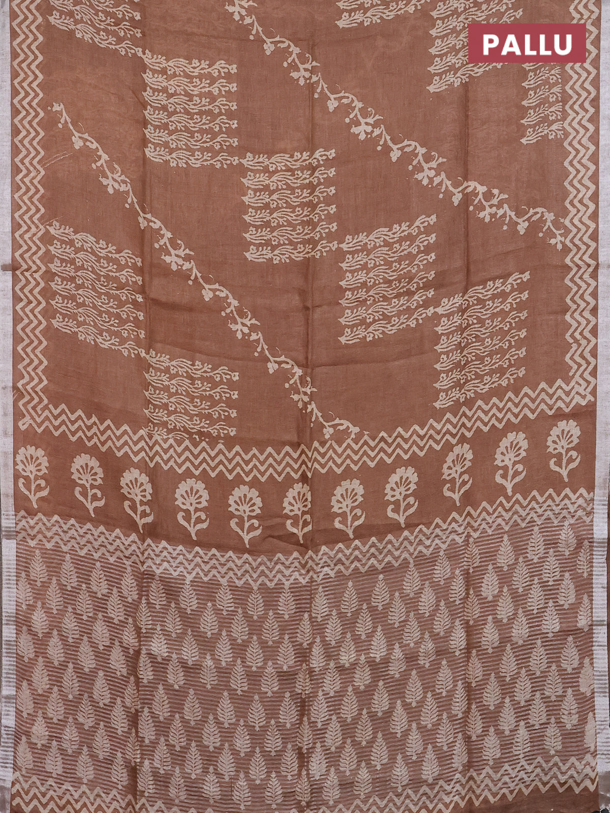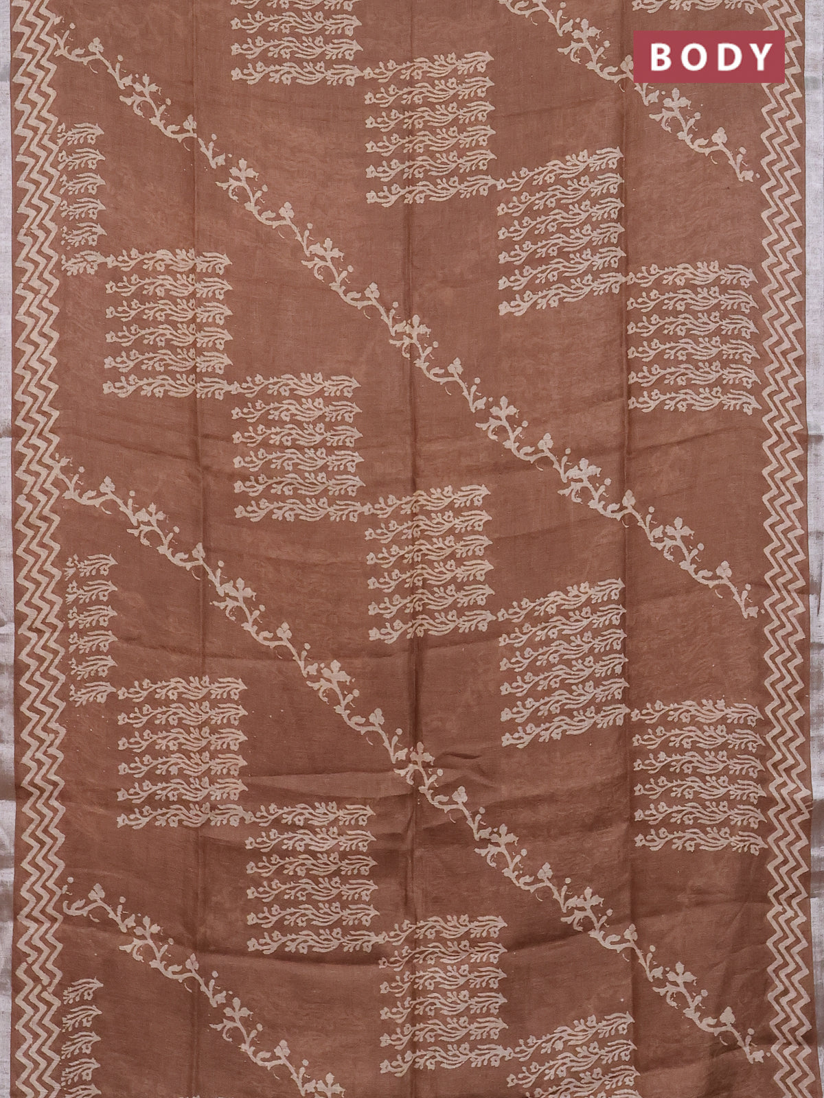Pure linen saree brown with allover butta prints and silver zari woven border