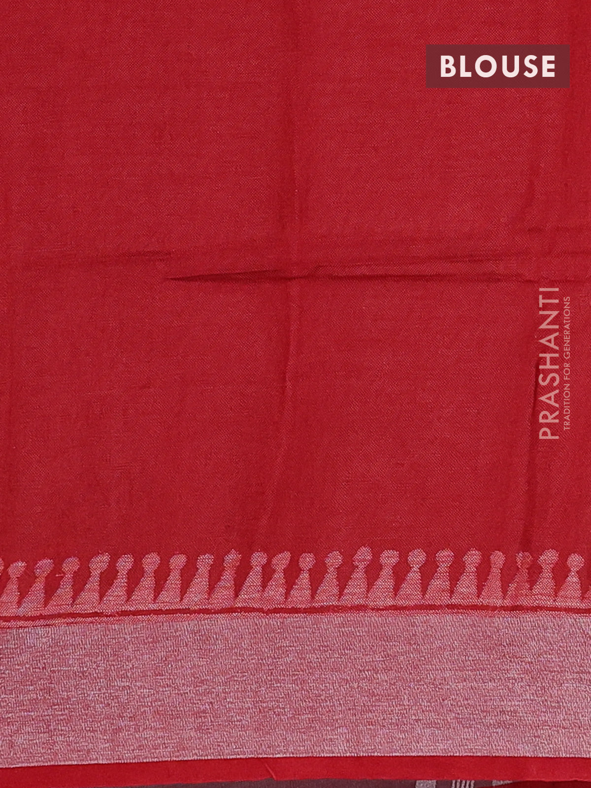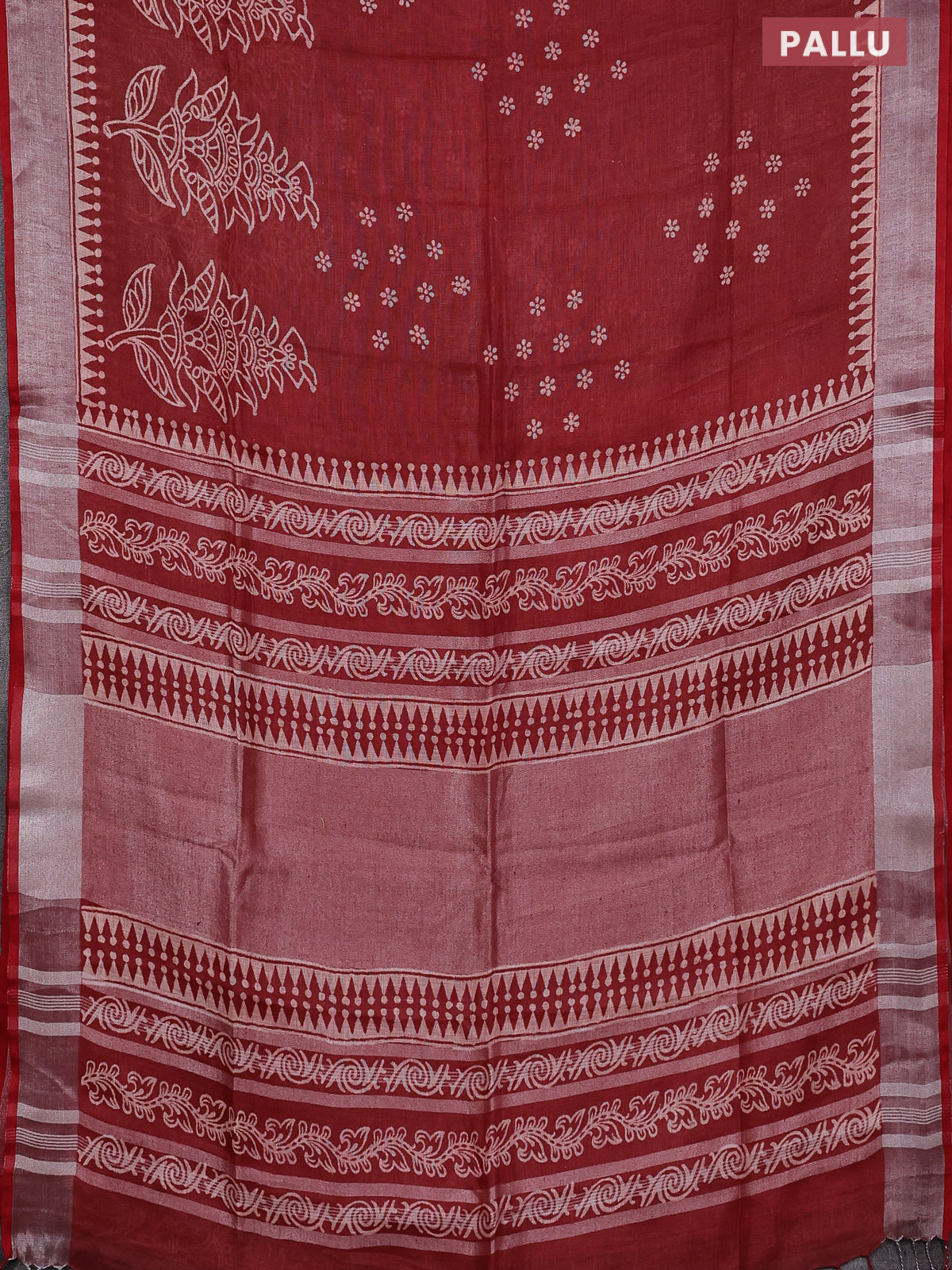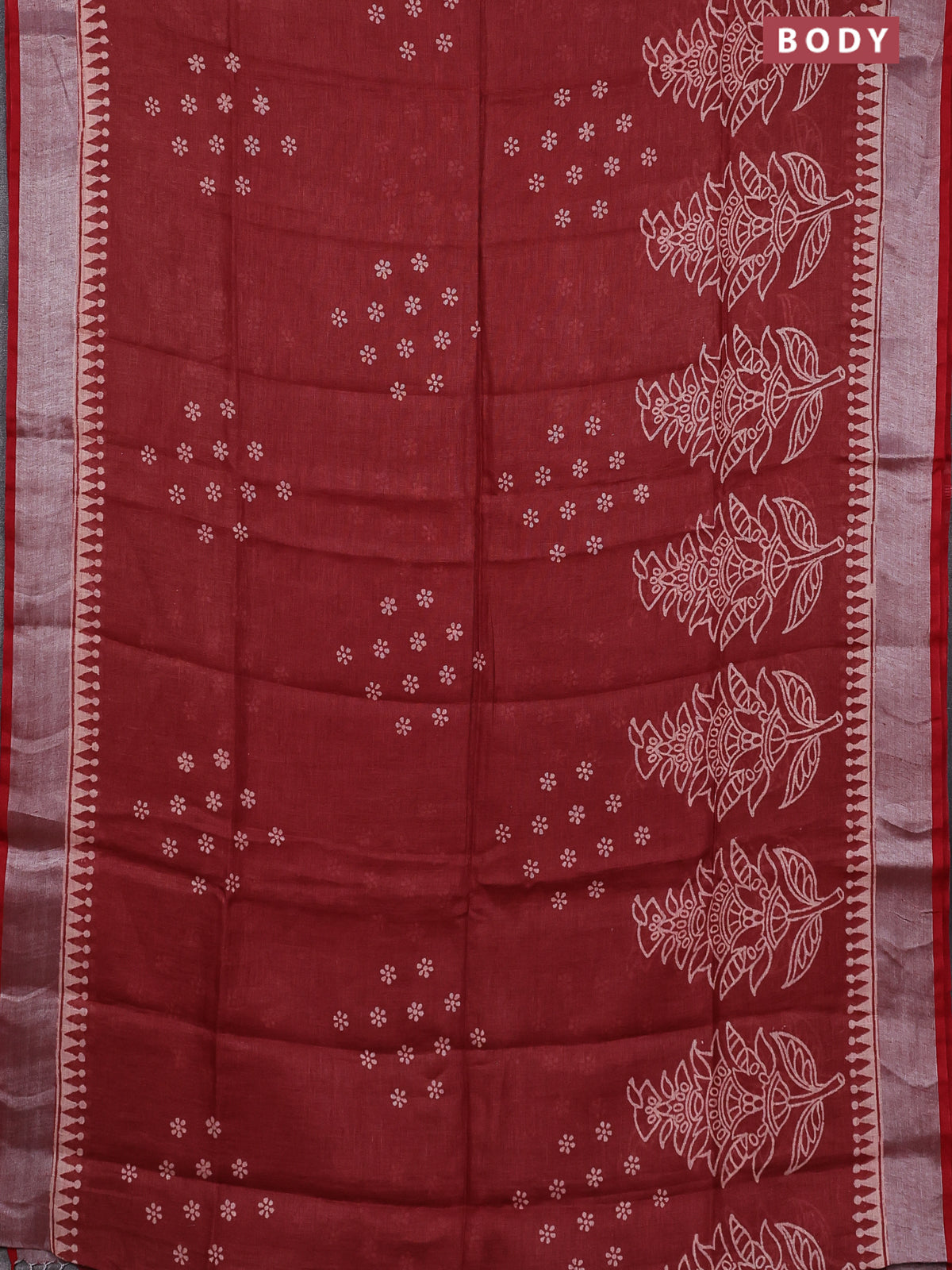 Pure linen saree maroon shade and red with batik butta prints and silver zari woven border