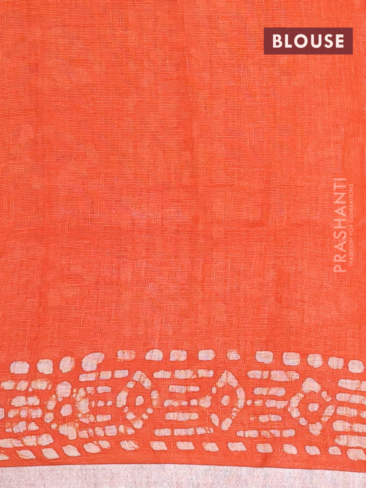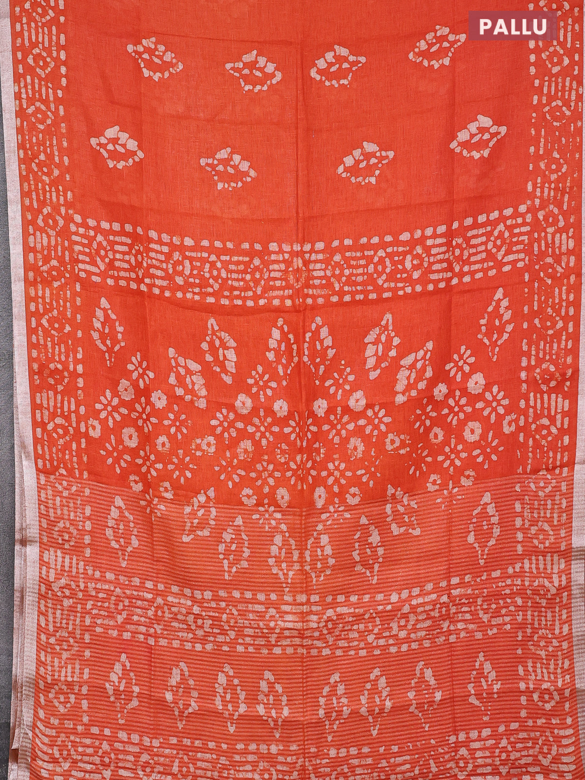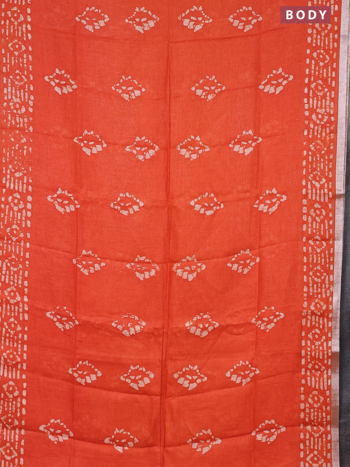 Pure linen saree orange with allover batik prints and silver zari woven border