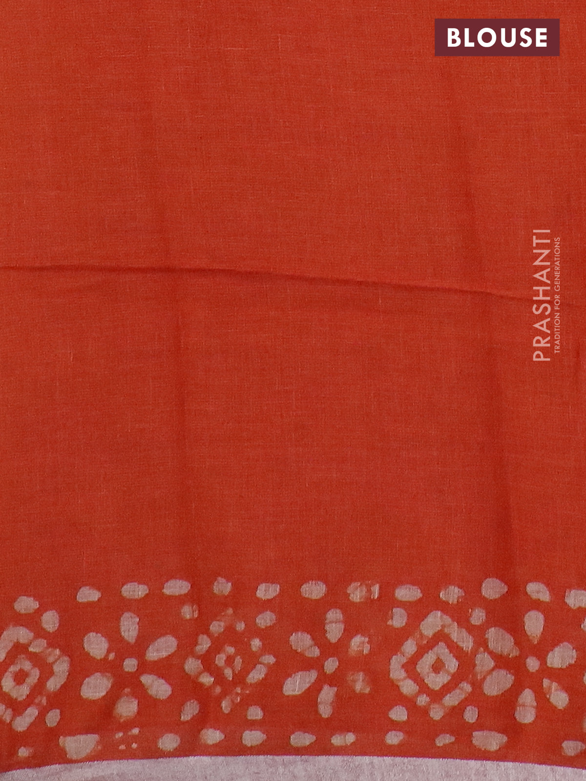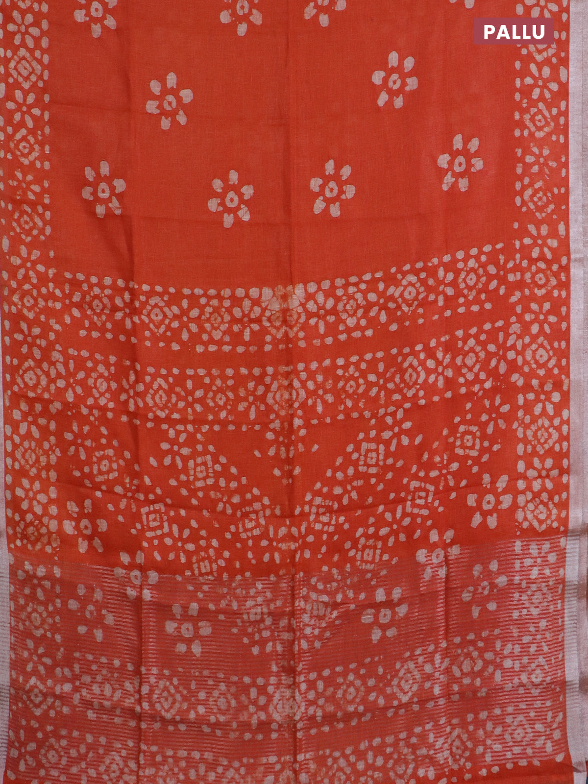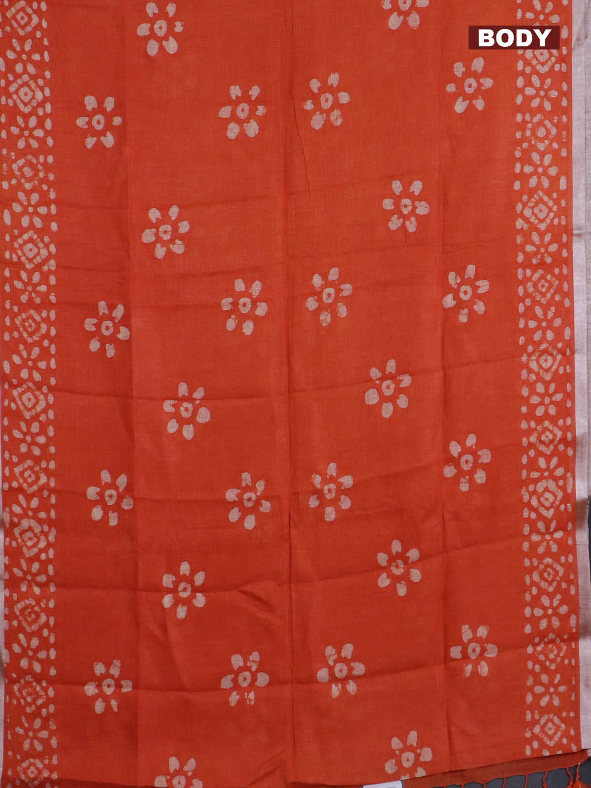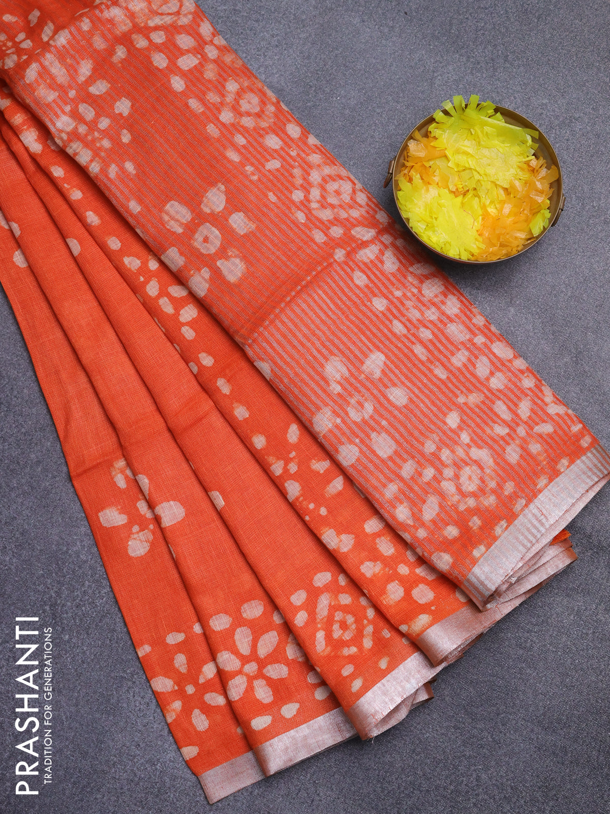 Pure linen saree orange with batik butta prints and silver zari woven border