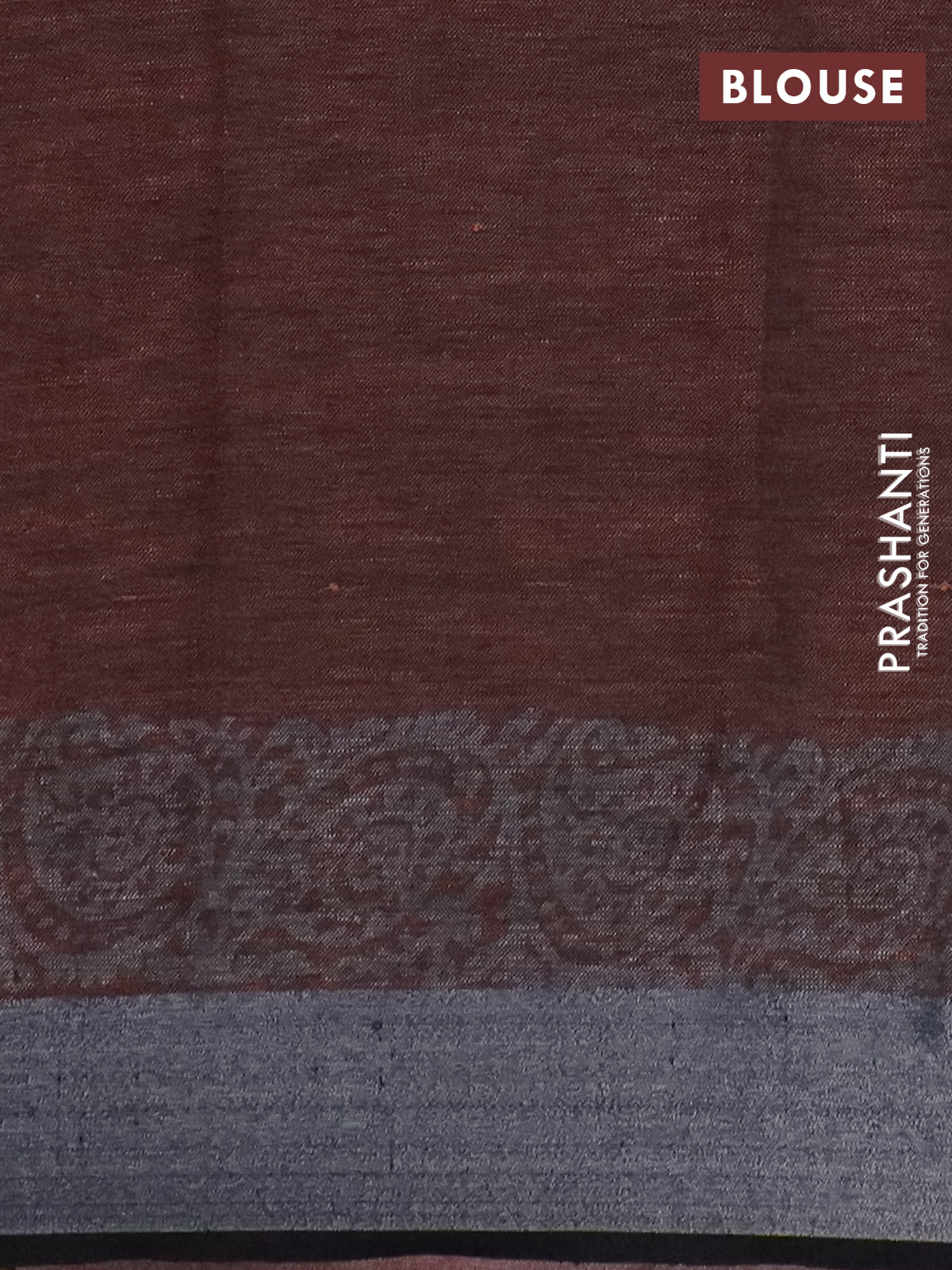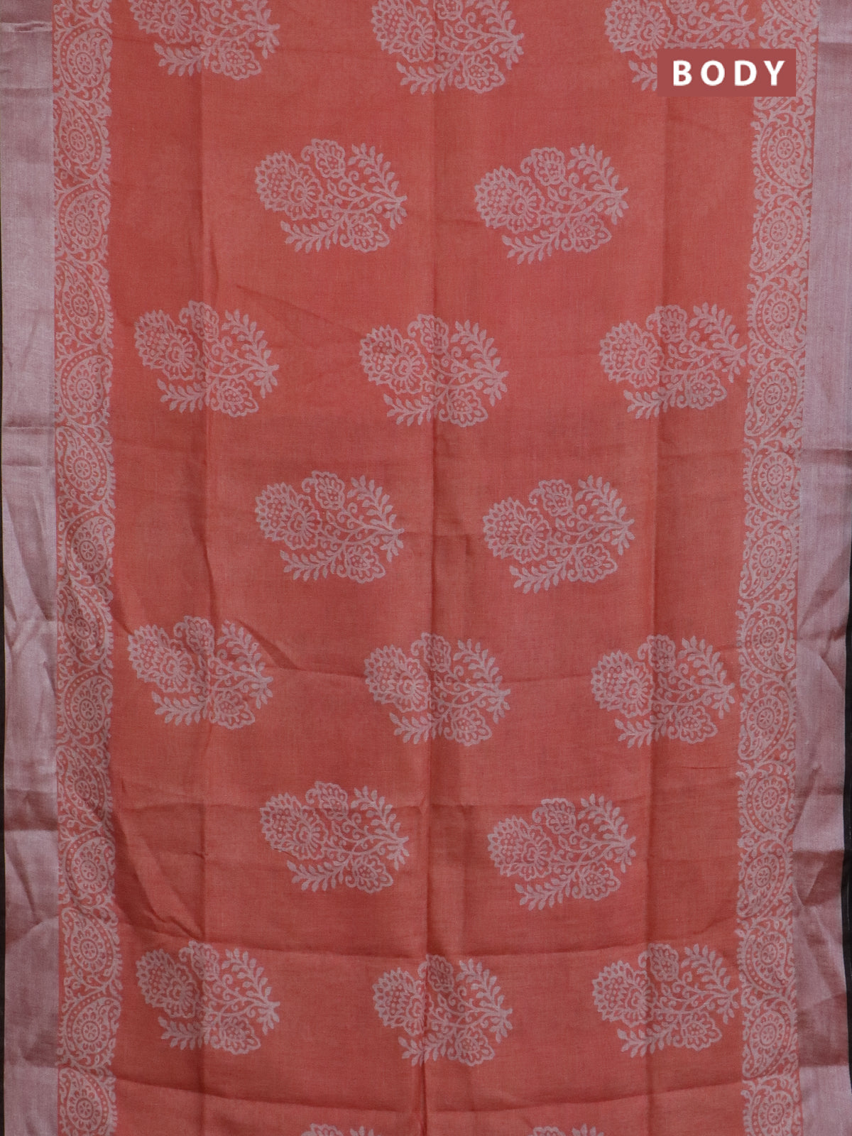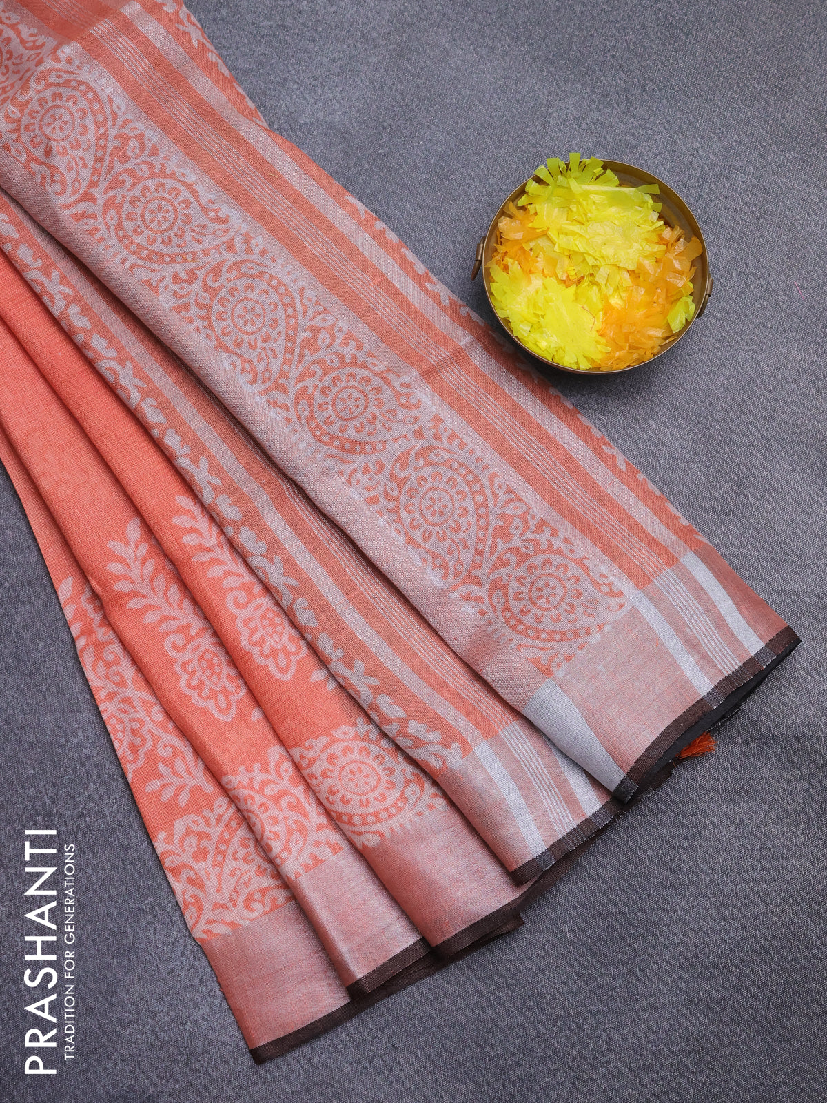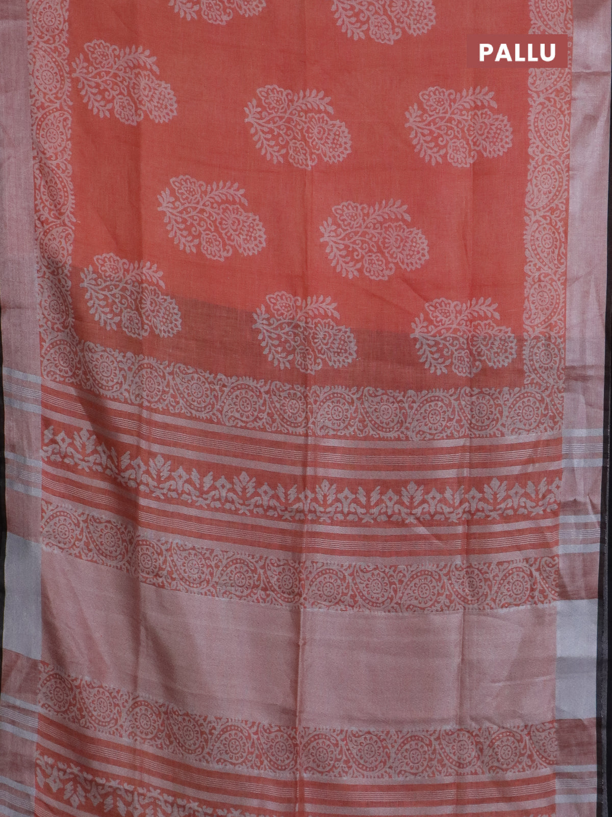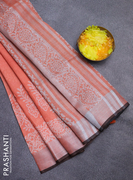 Pure linen saree peach orange and black with butta prints and silver zari woven border