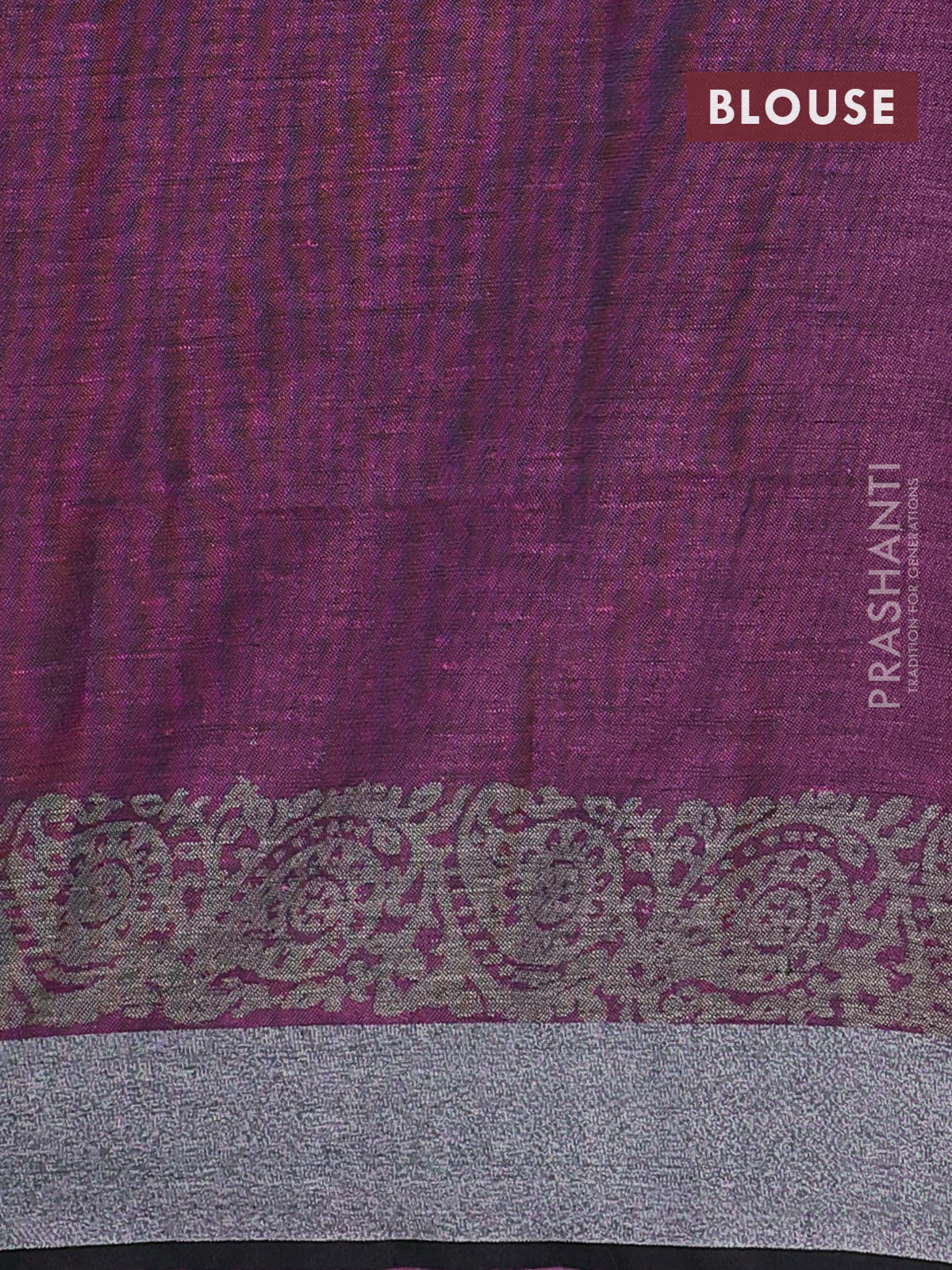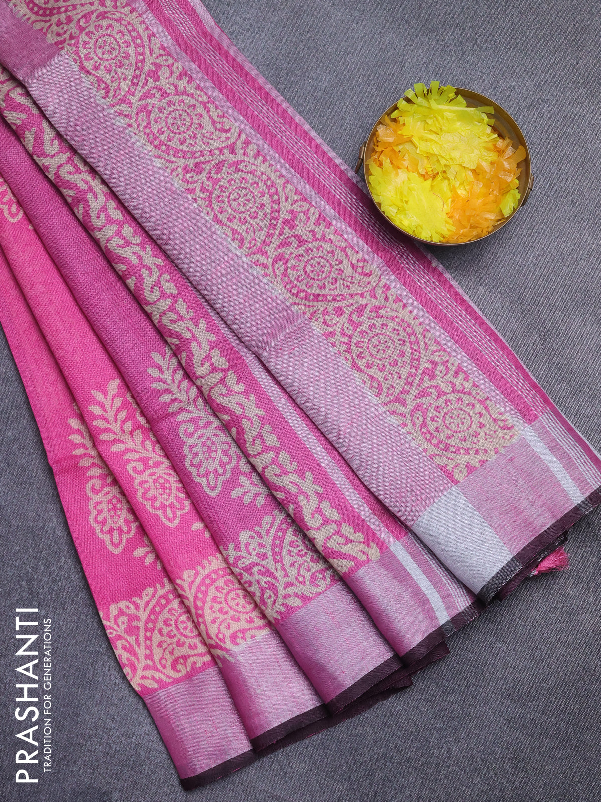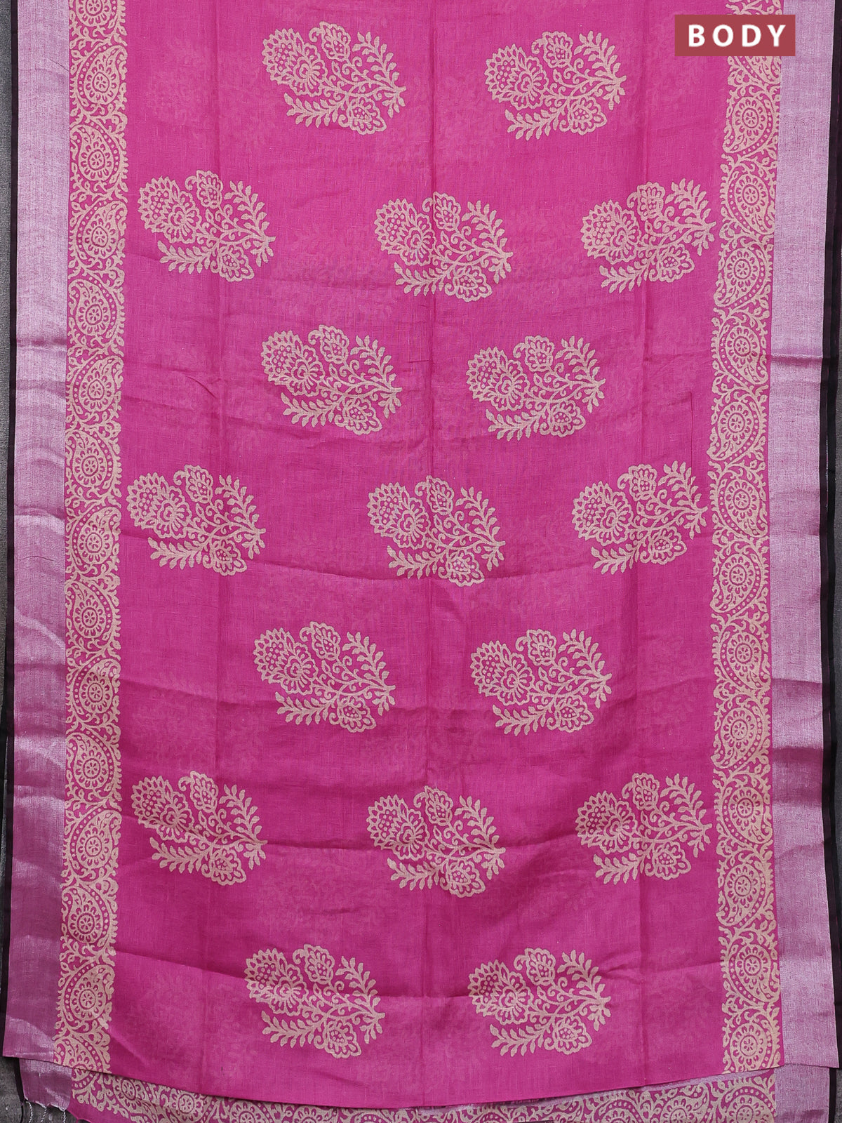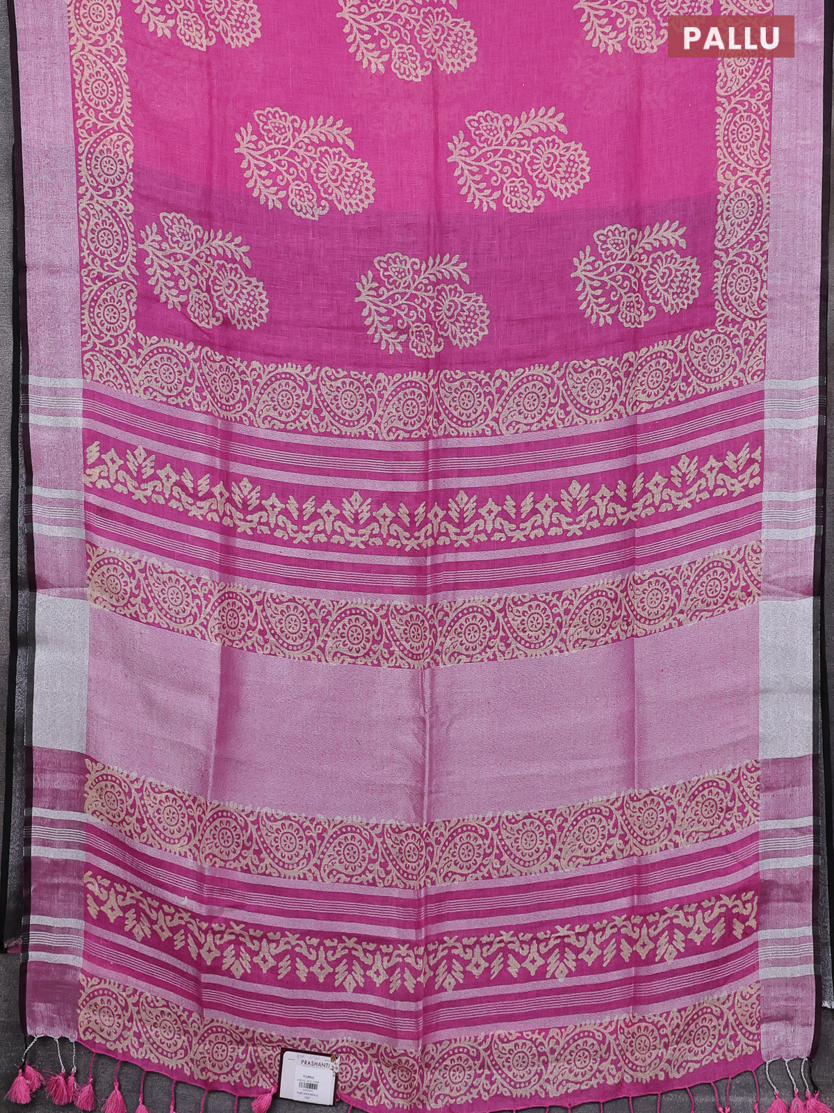 Pure linen saree pink and black with butta prints and silver zari woven border