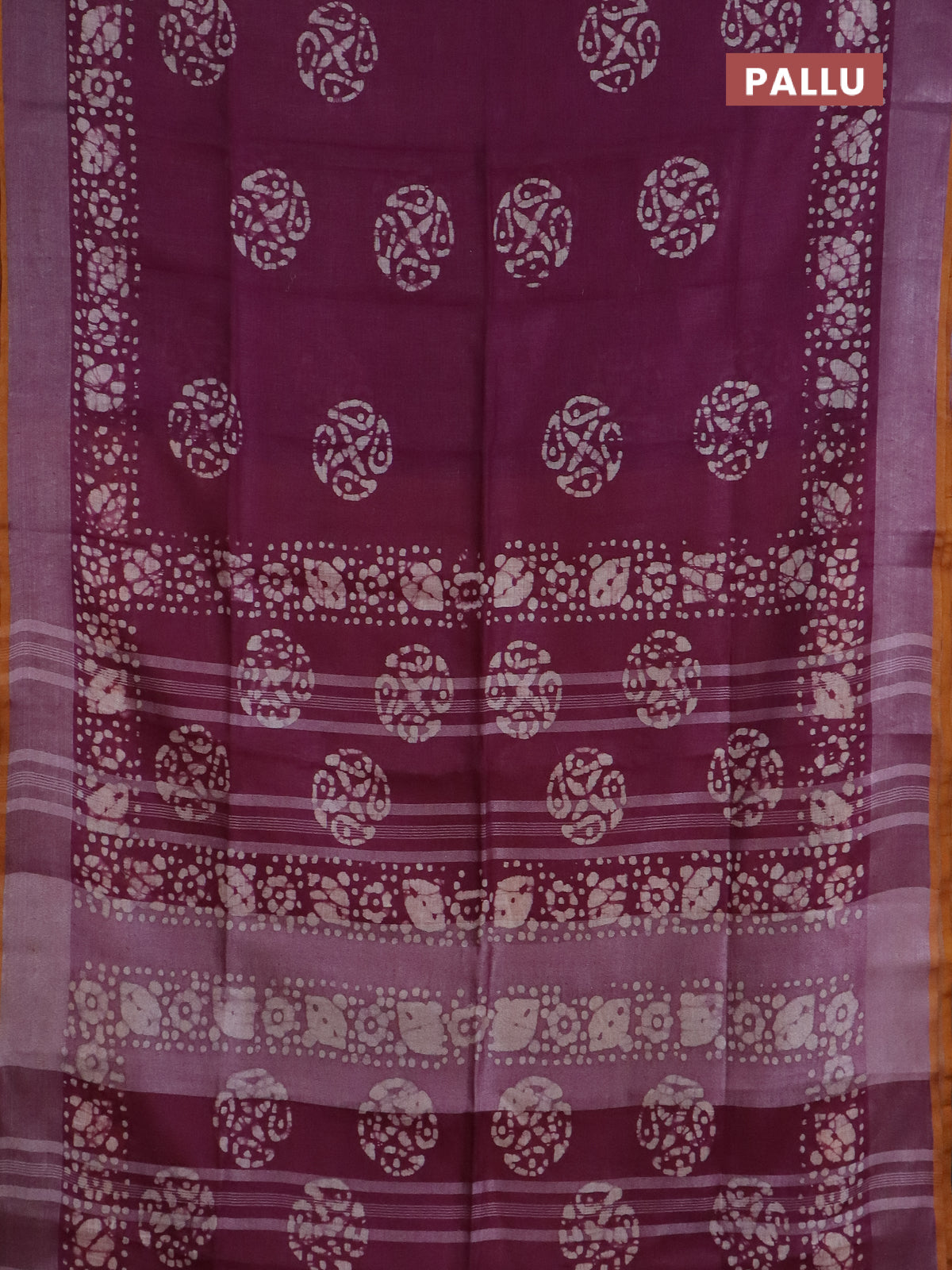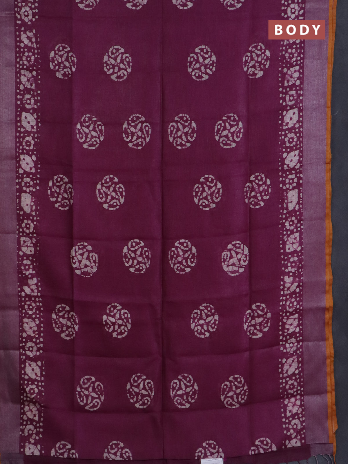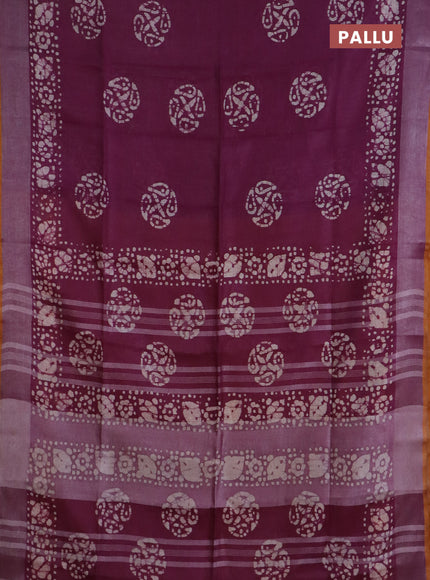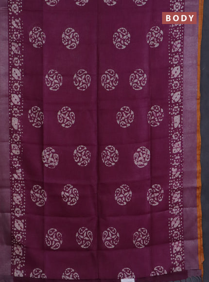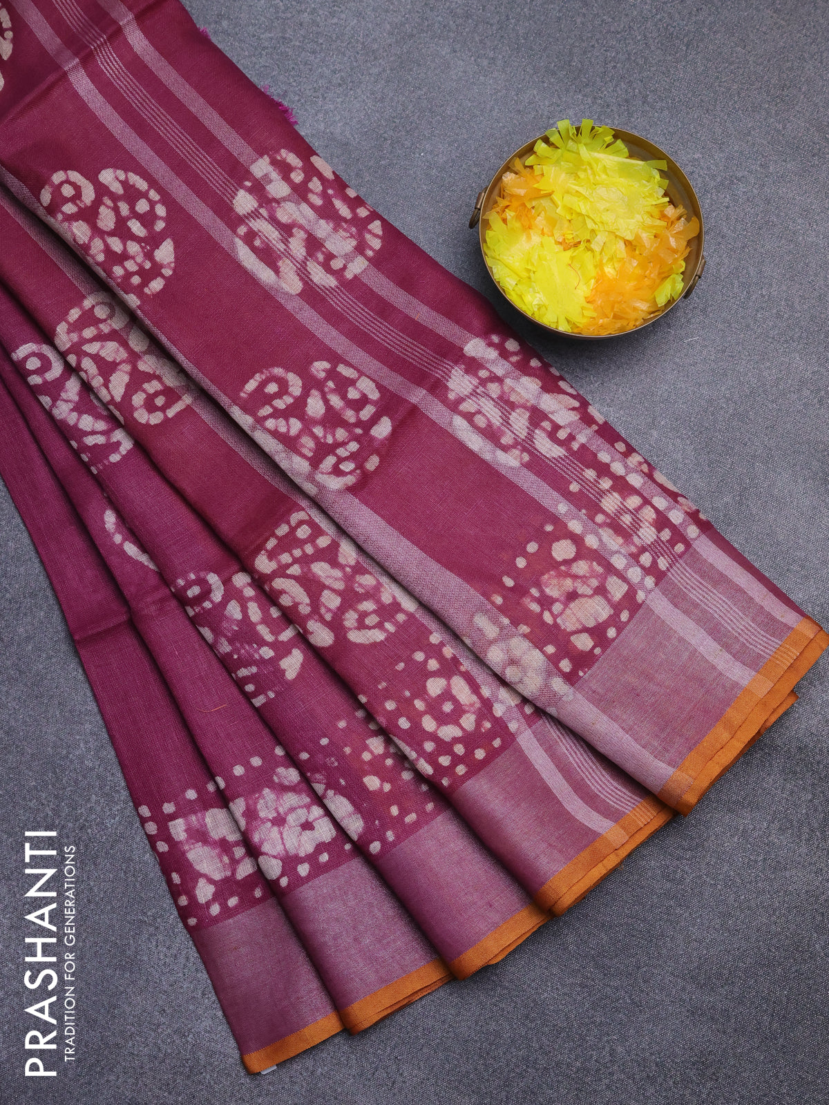 Pure linen saree purple and mustard yellow with batik butta prints and silver zari woven border