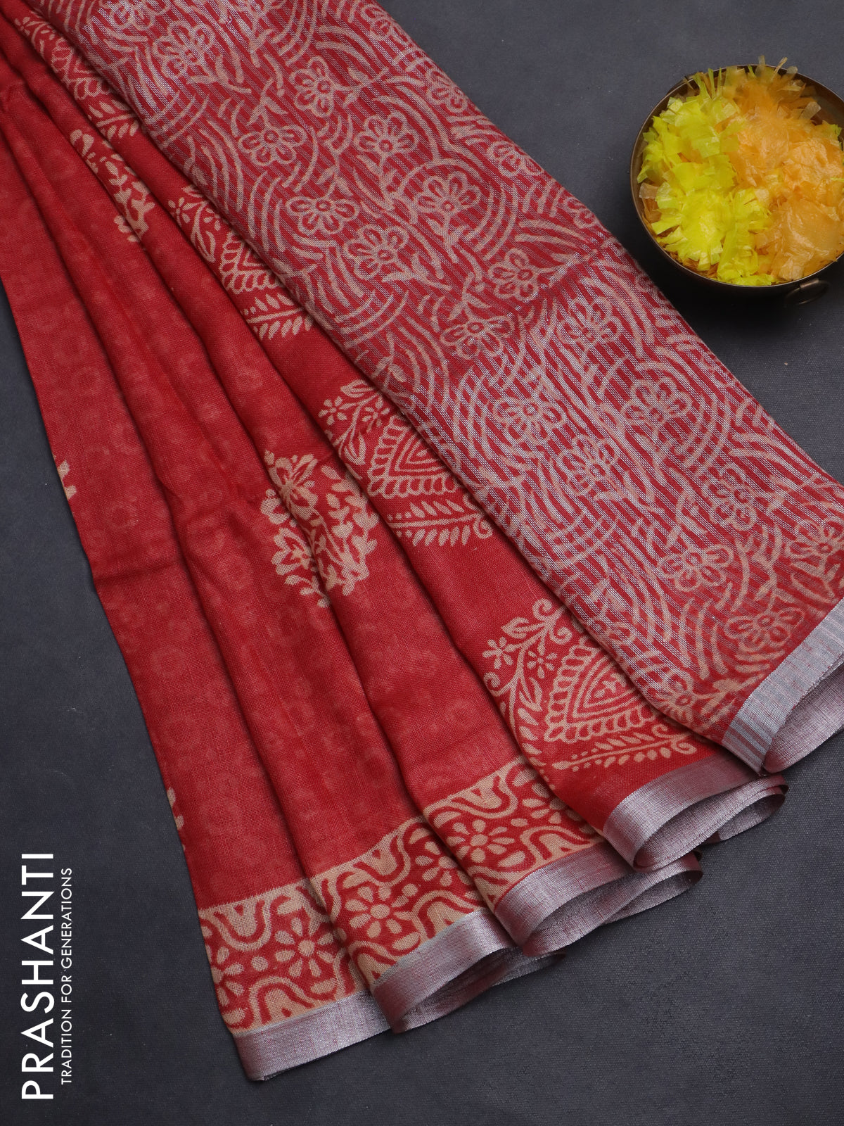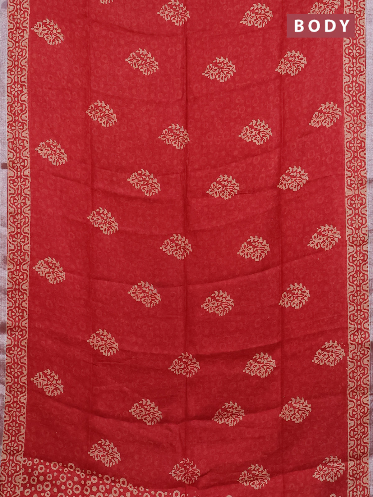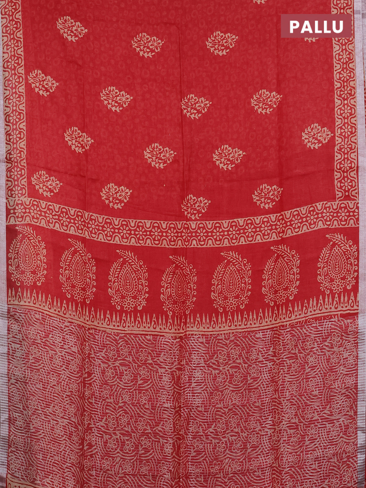 Pure linen saree red with allover butta prints and silver zari woven border