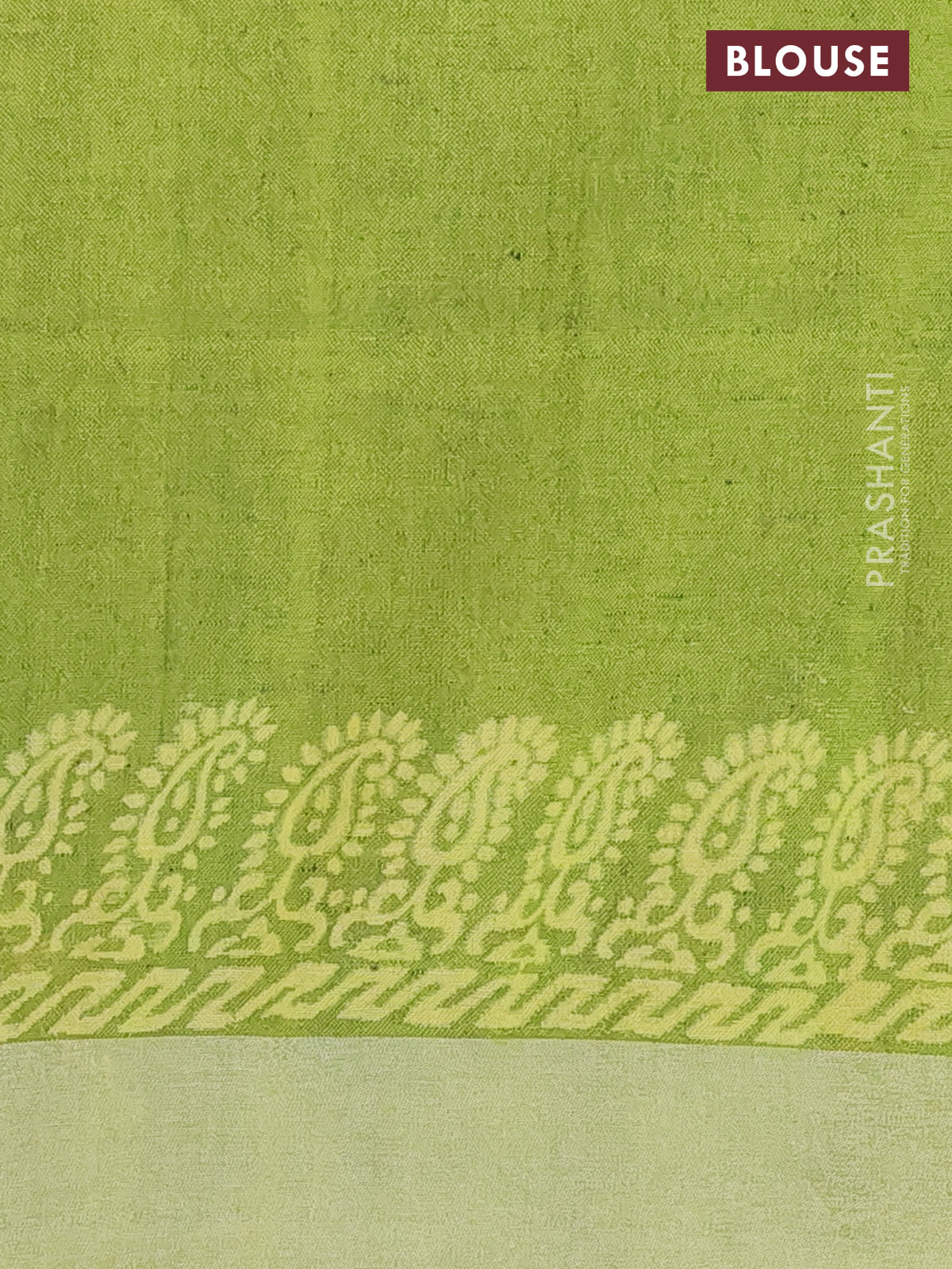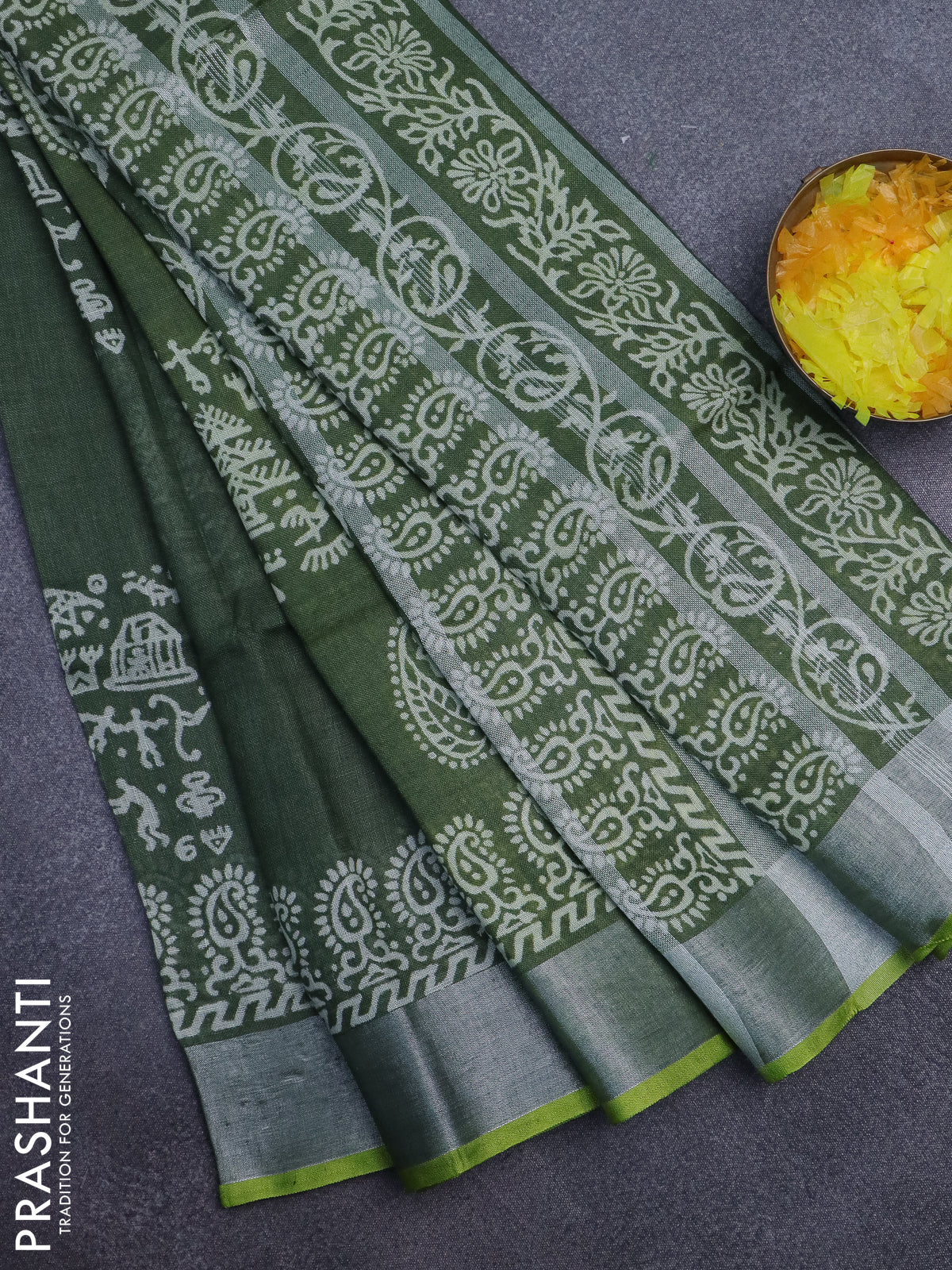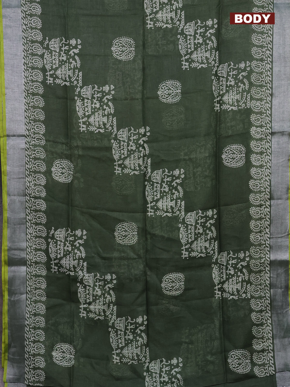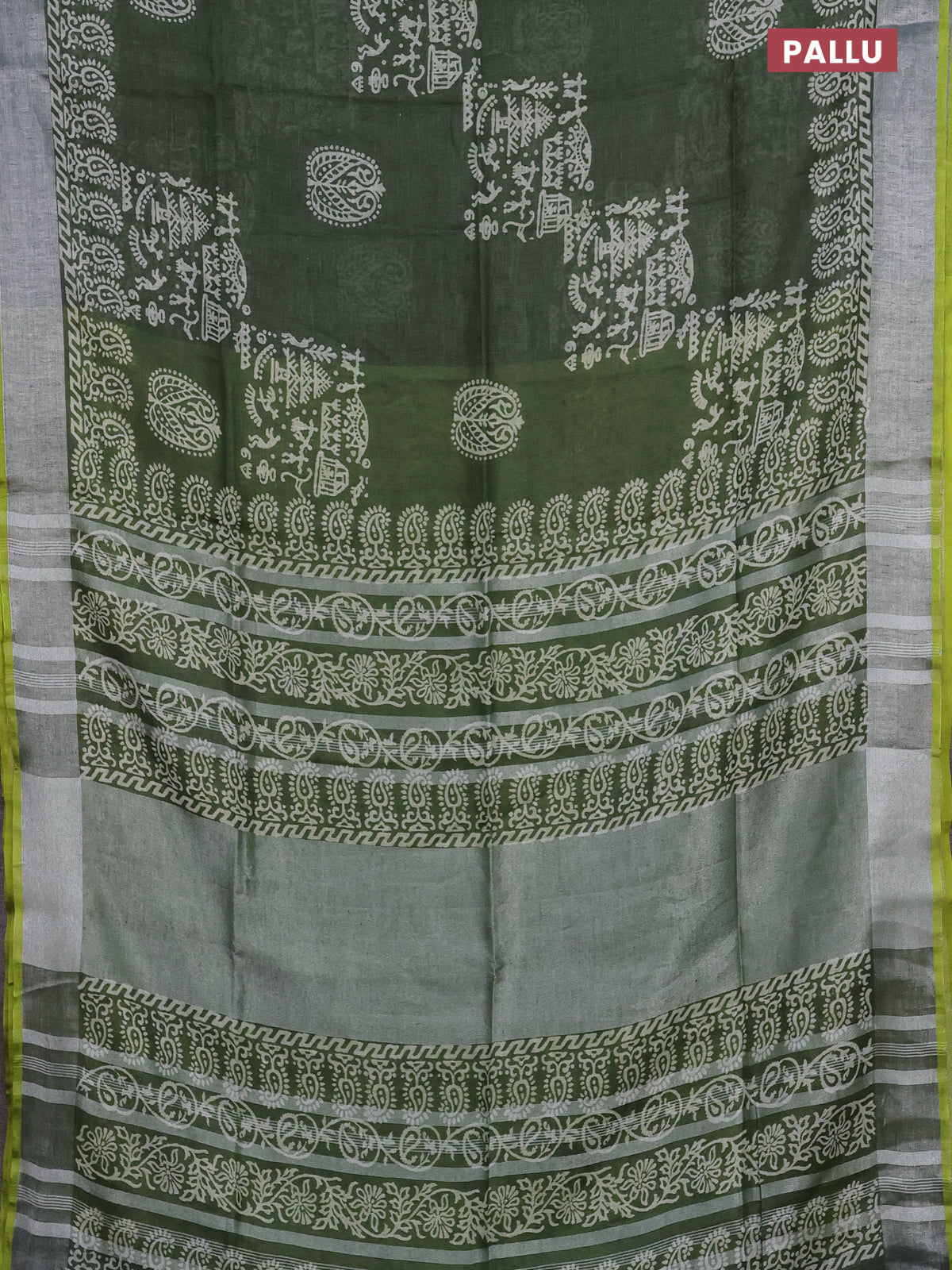 Pure linen saree sap green and yellow with allover prints and silver zari woven border