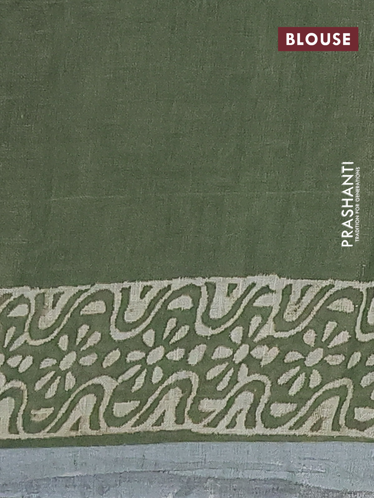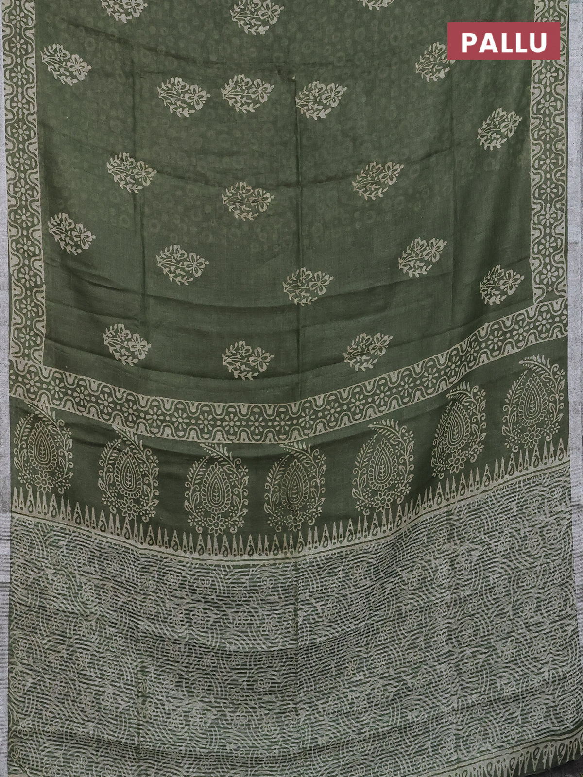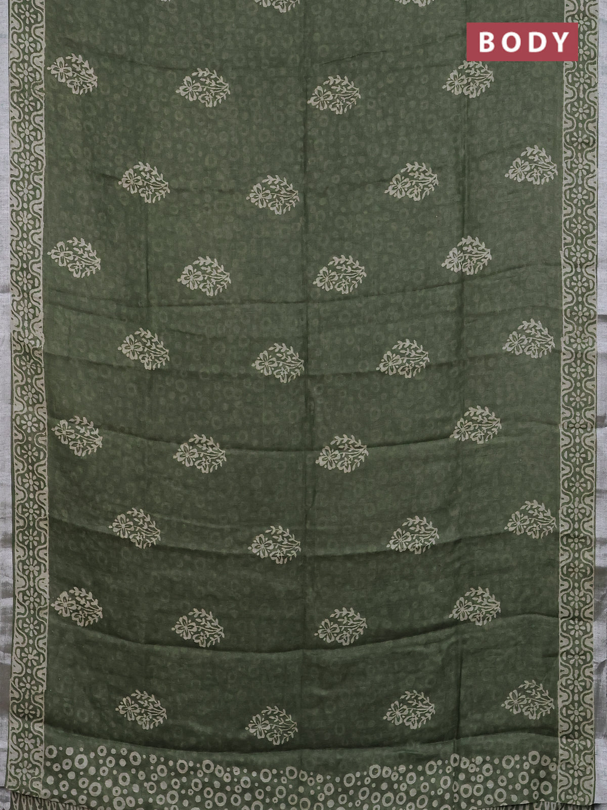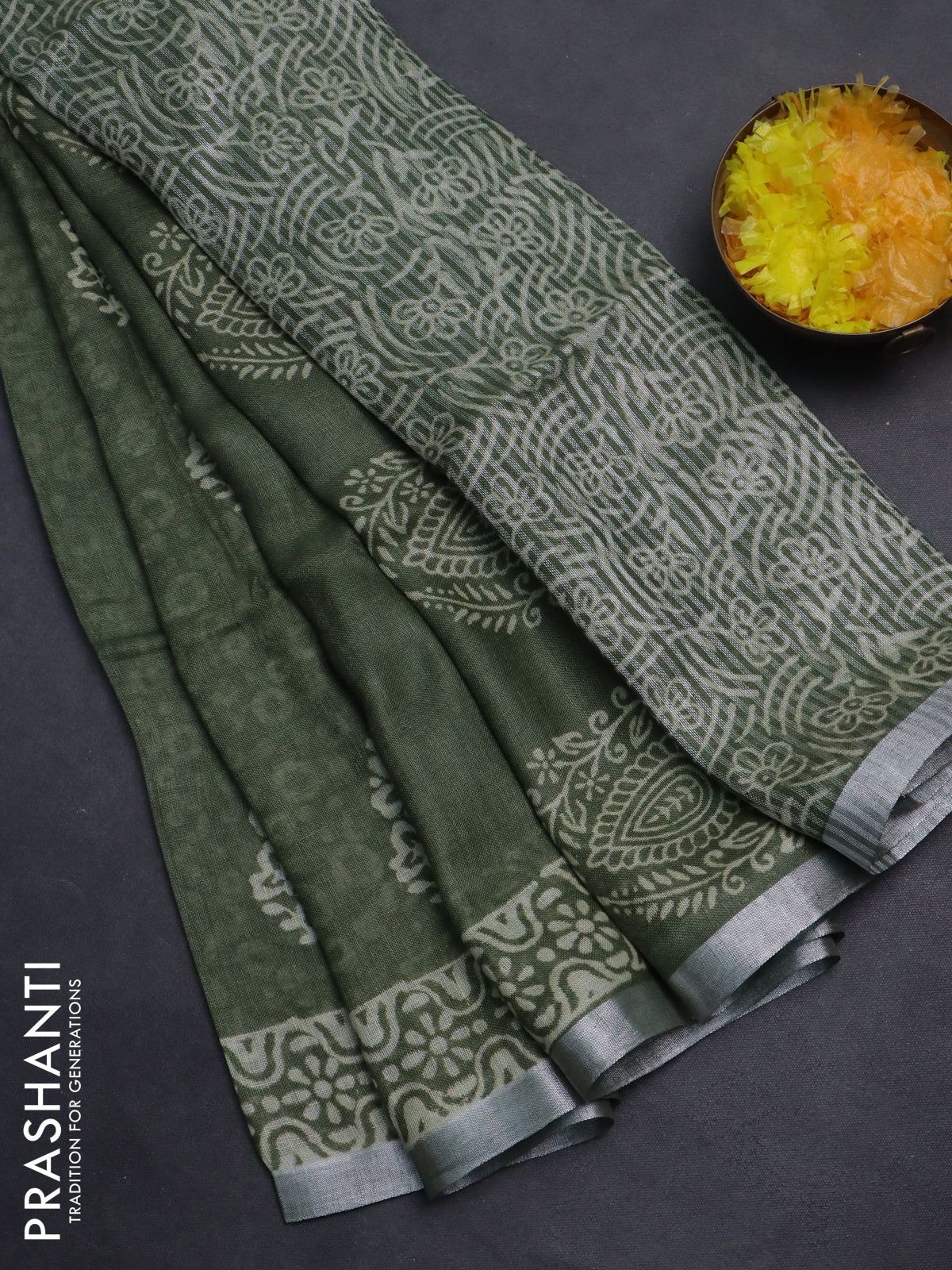 Pure linen saree sap green with allover butta prints and silver zari woven border