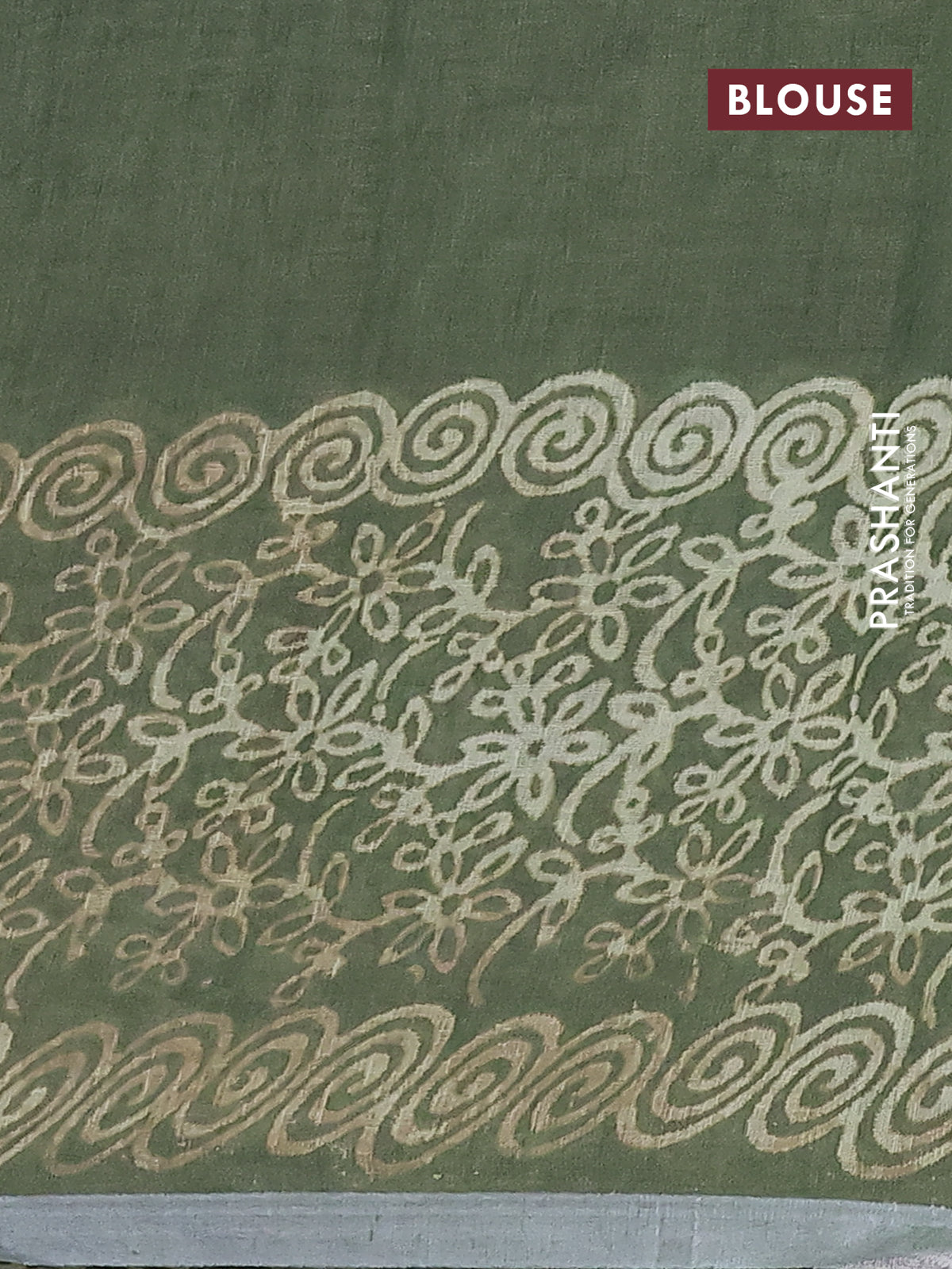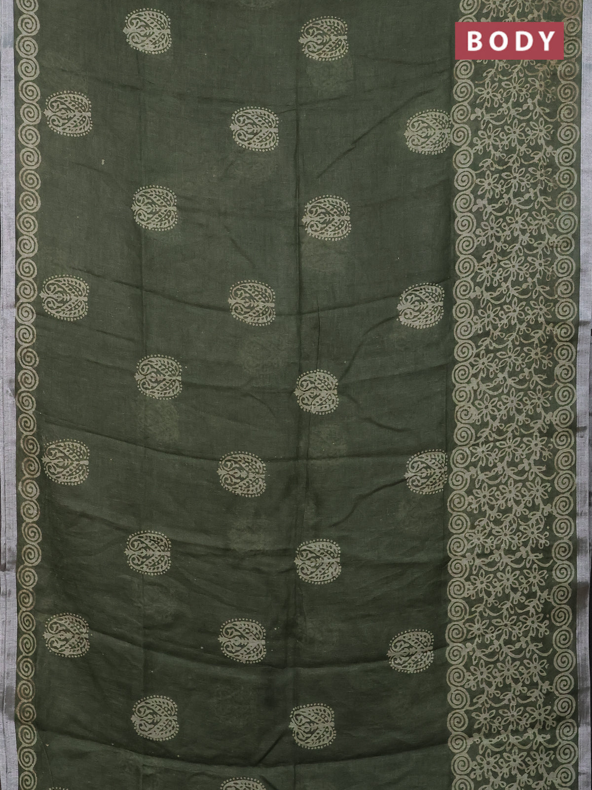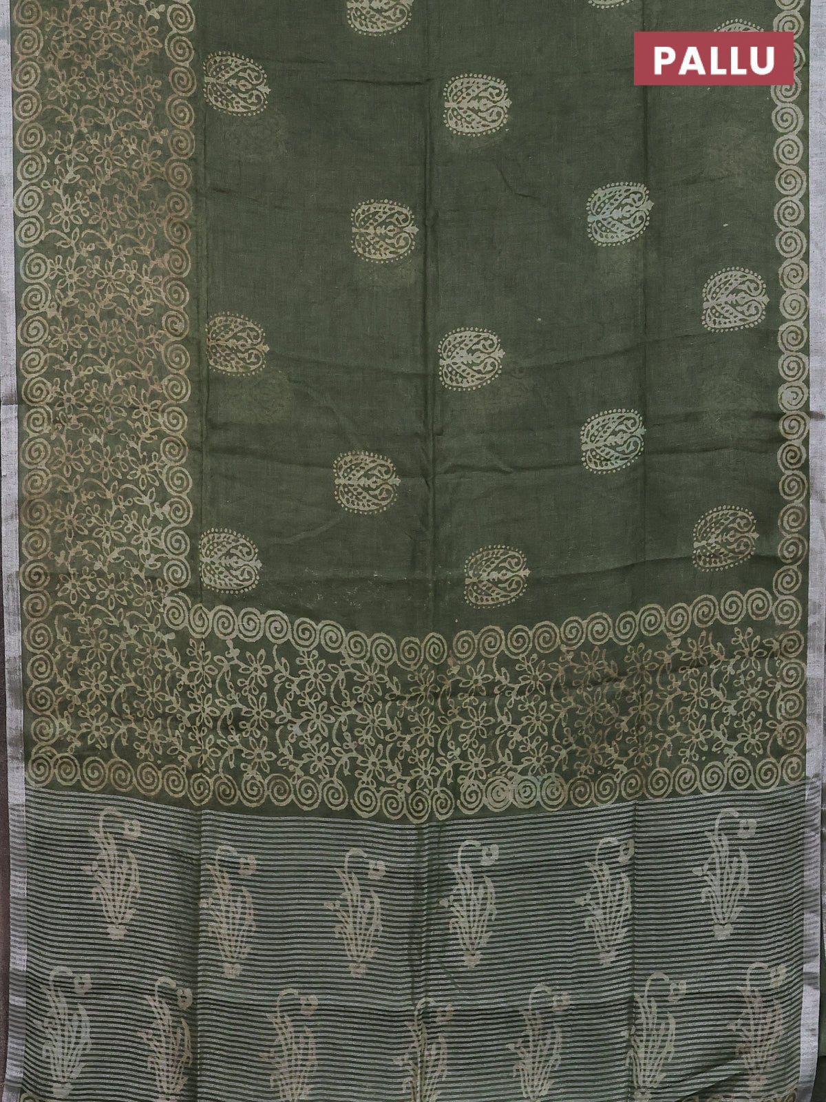Pure linen saree sap green with allover butta prints and silver zari woven border