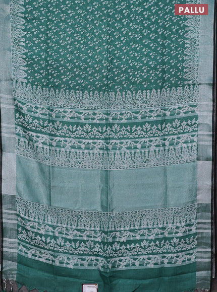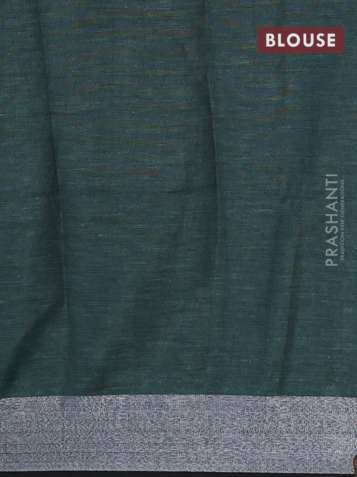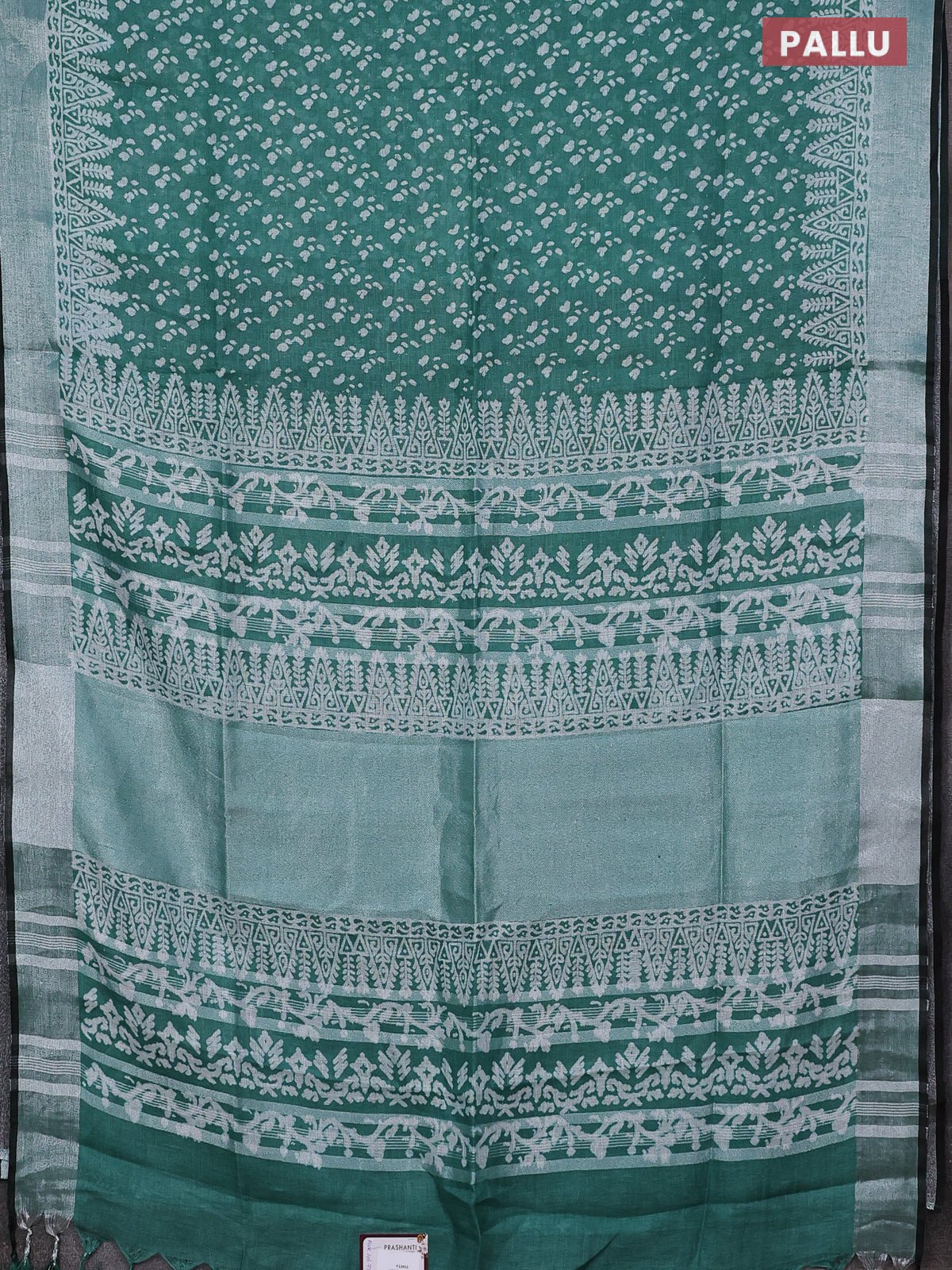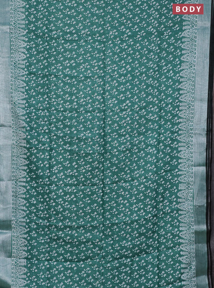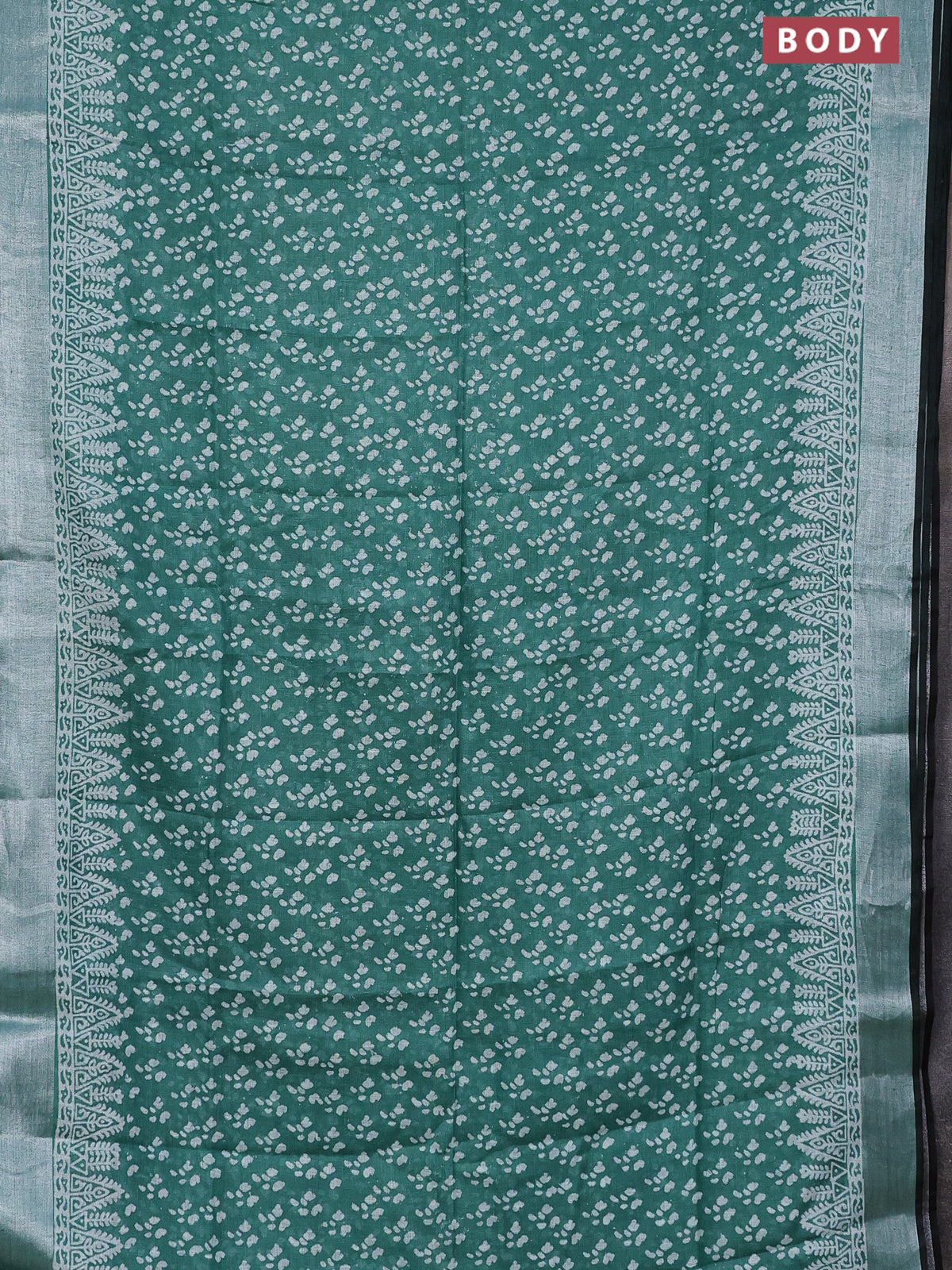 Pure linen saree teal green and black with allover prints and silver zari woven border