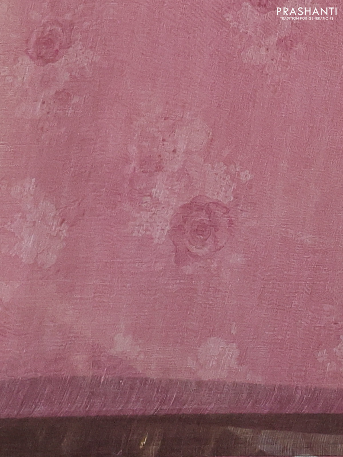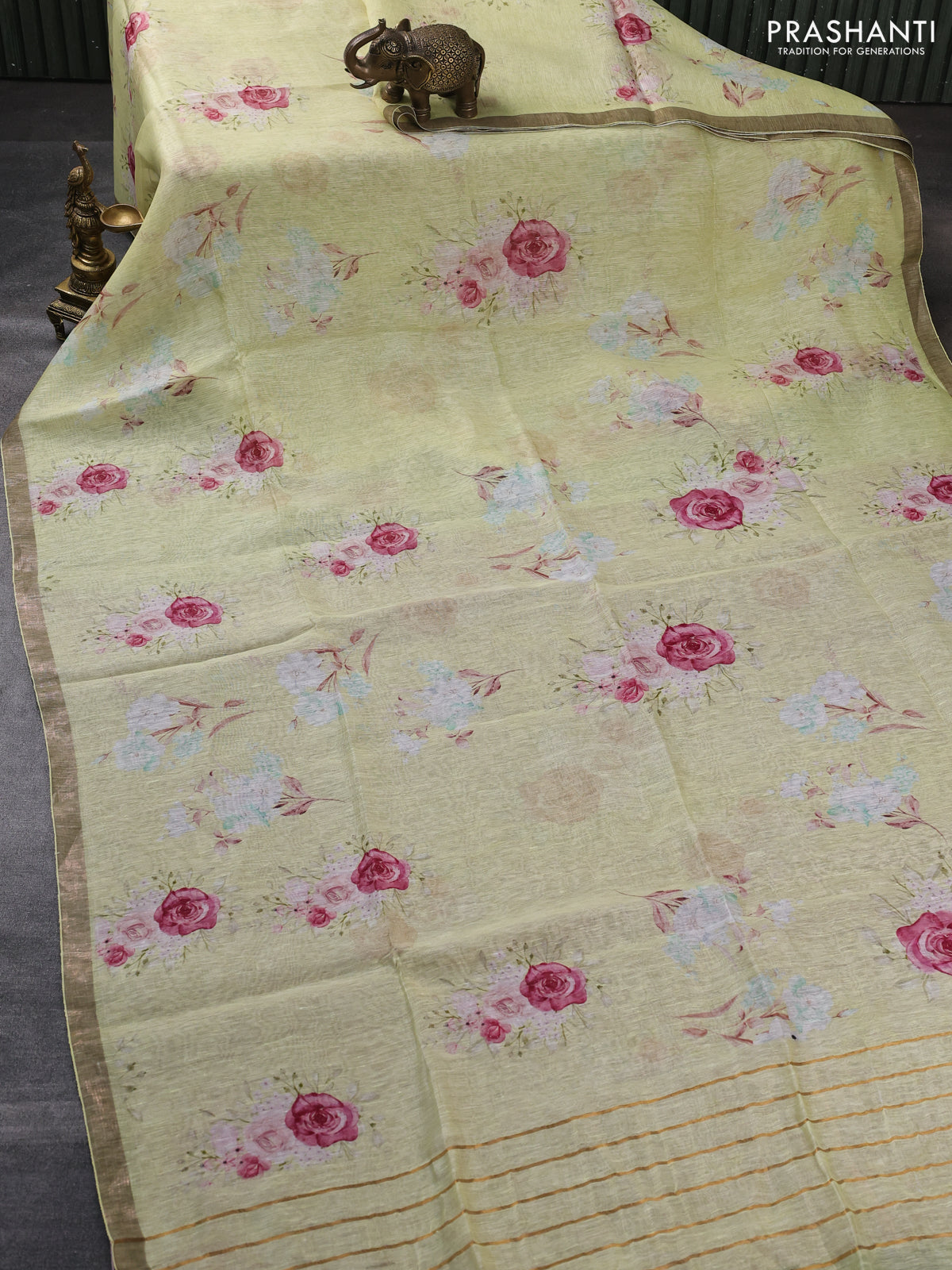 Pure linen silk saree pale yellow and pastel pink with floral butta prints and small zari woven border
