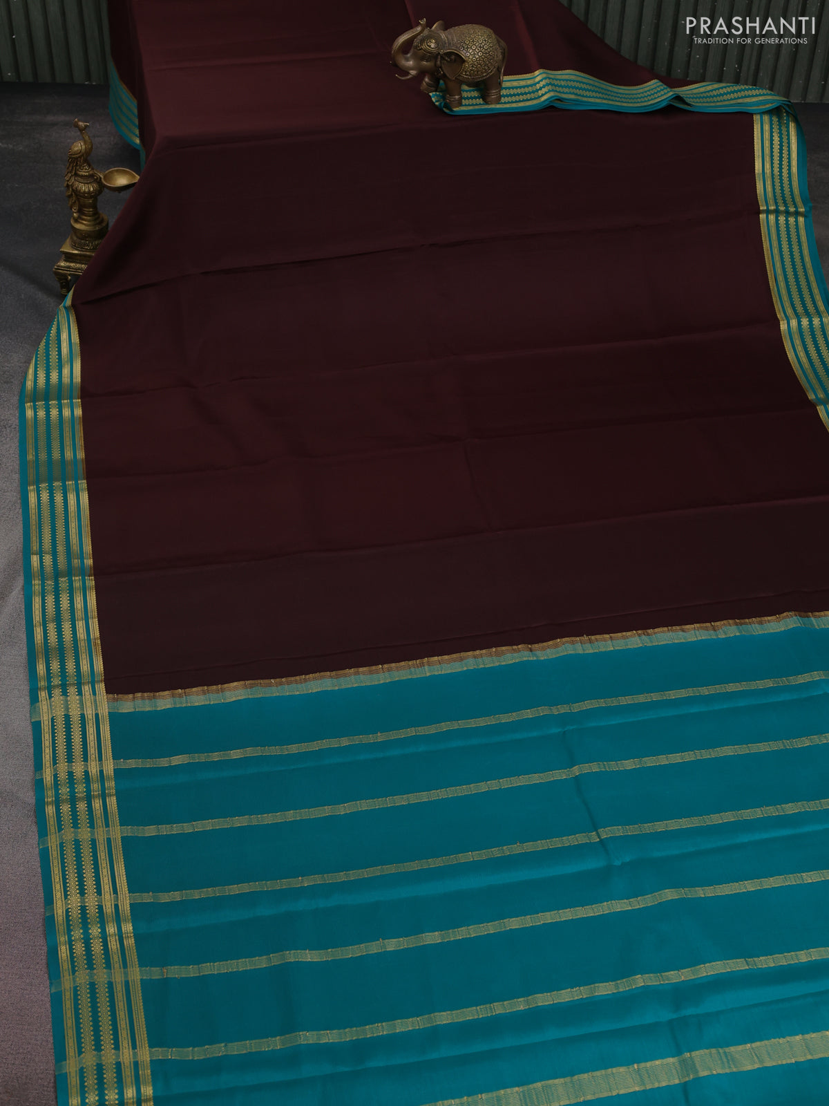 Pure mysore silk saree brown and teal green with plain body and zari woven border