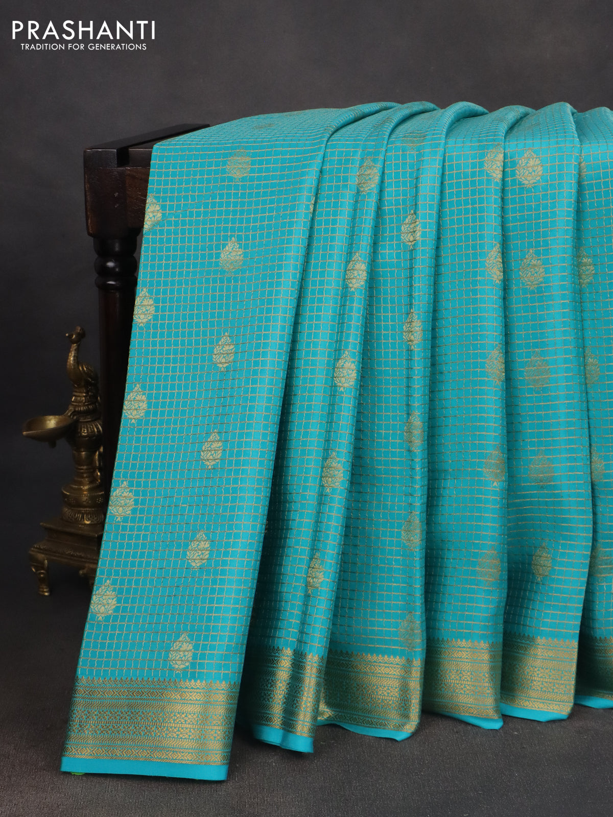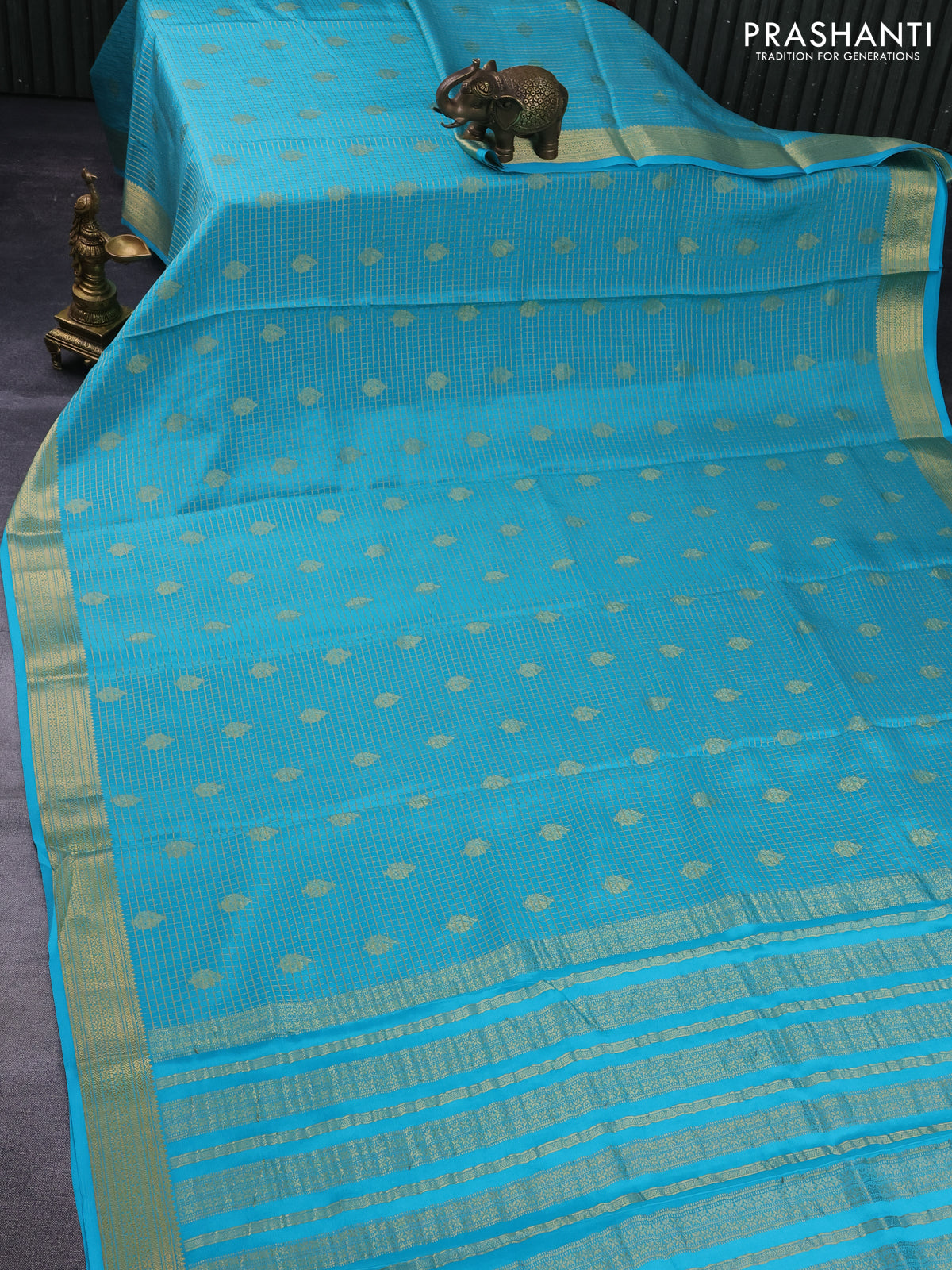Pure mysore silk saree light blue with allover small zari checks & buttas and zari woven border