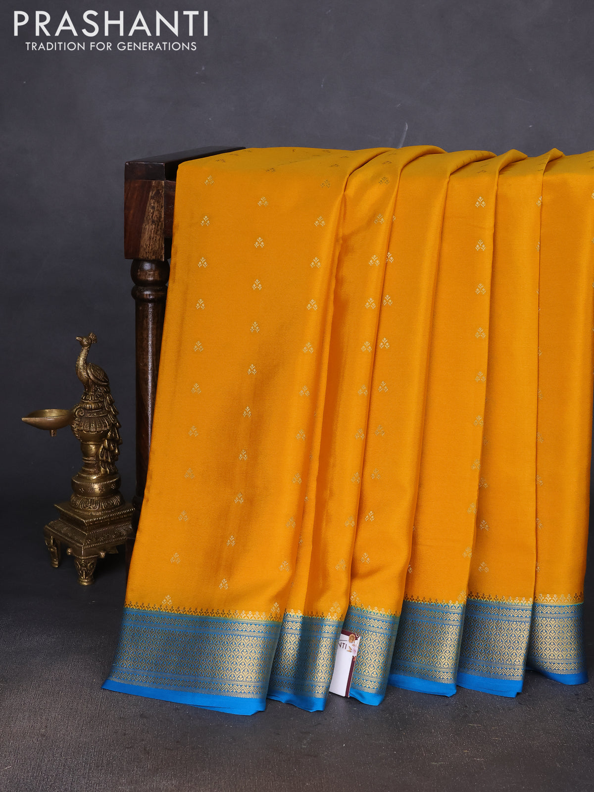 Pure mysore silk saree mango yellow and cs blue with zari woven buttas and zari woven border