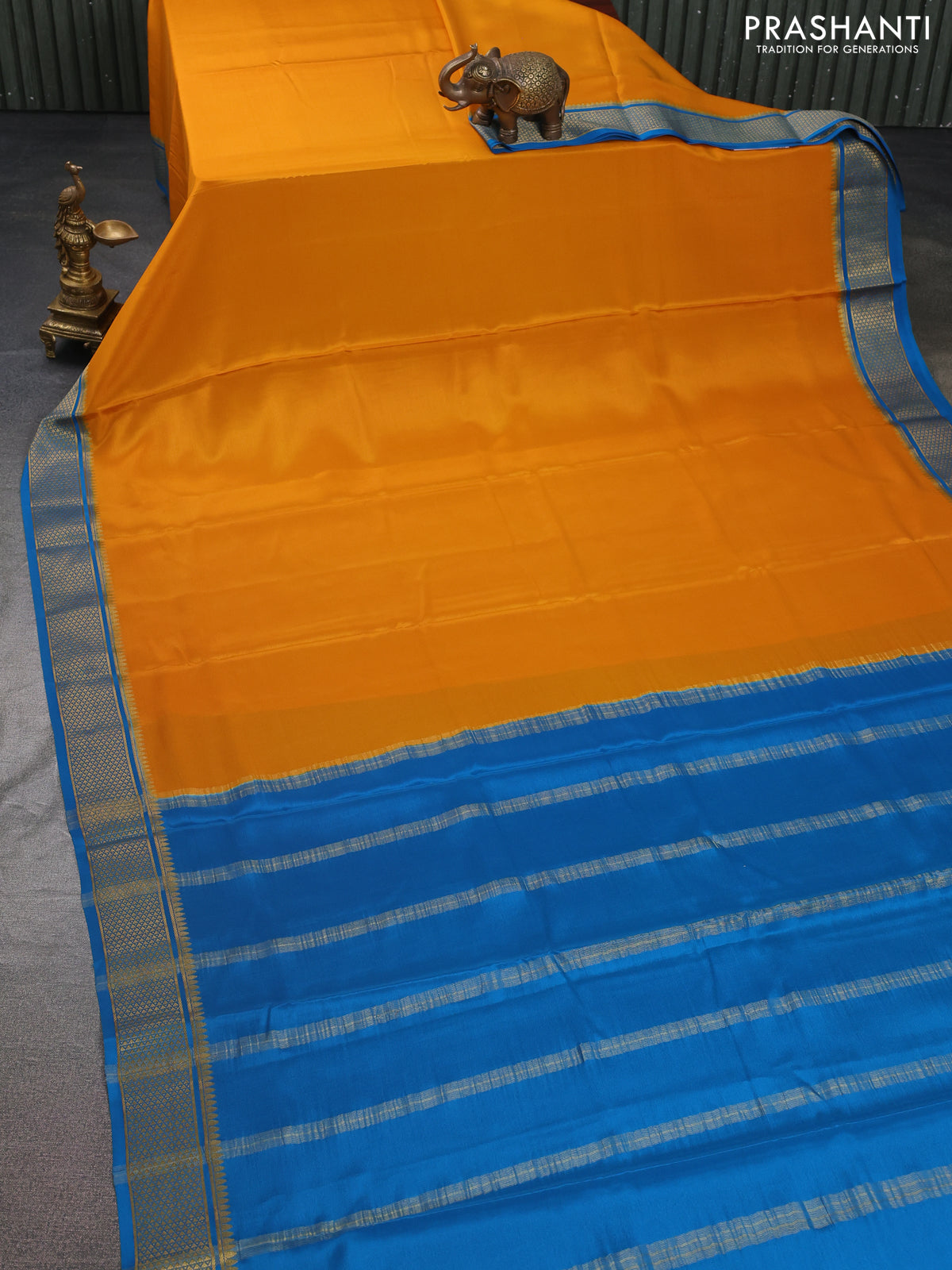 Pure mysore silk saree mustard yellow and cs blue with plain body and zari woven border
