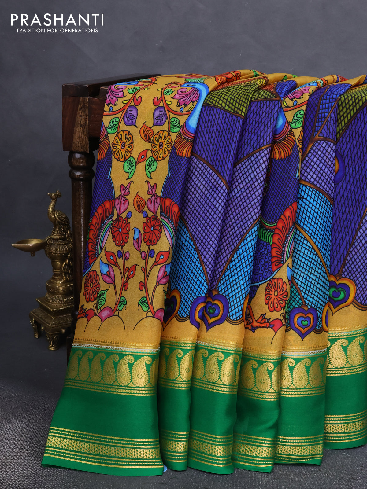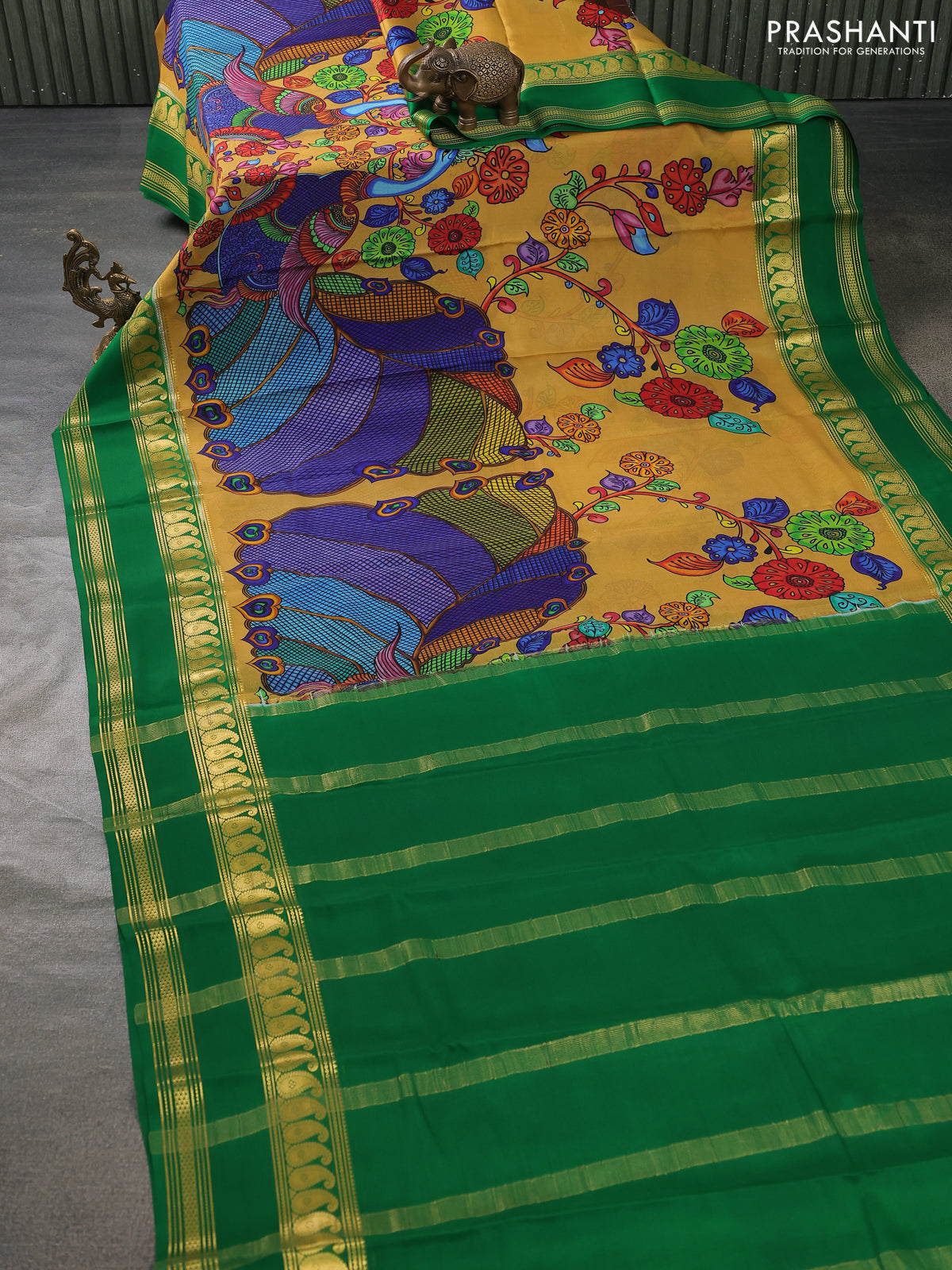 Pure mysore silk saree mustard yellow and green with allover digital prints and rettapet zari woven border