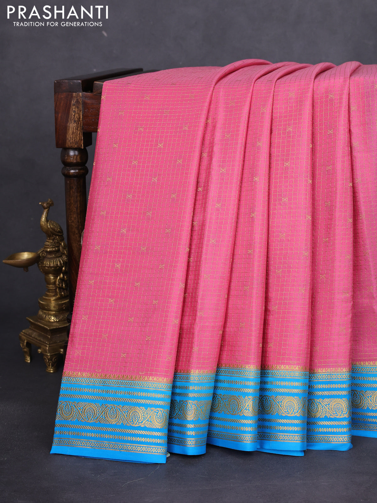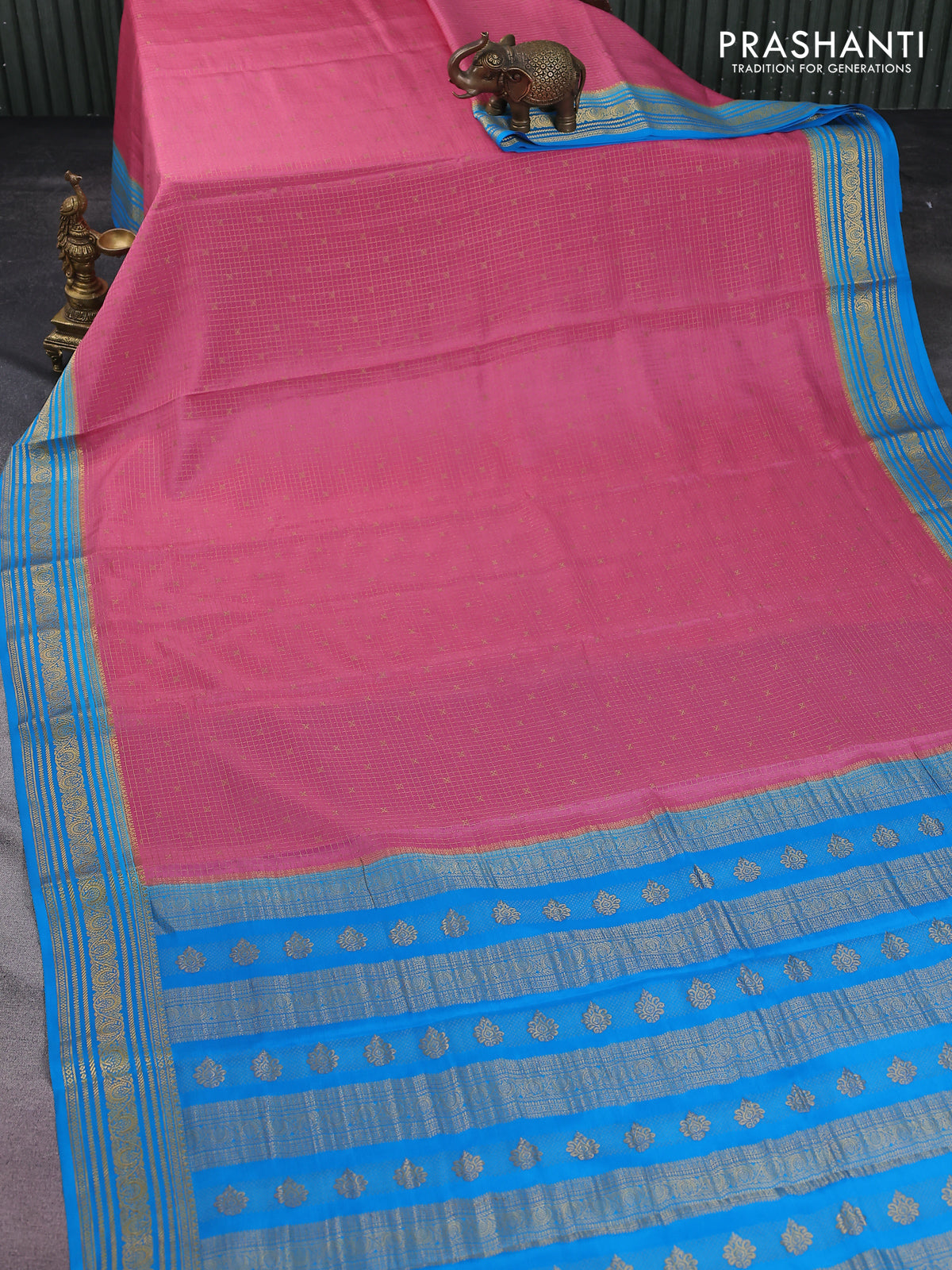 Pure mysore silk saree peach pink and cs blue with allover zari checks & buttas and zari woven border
