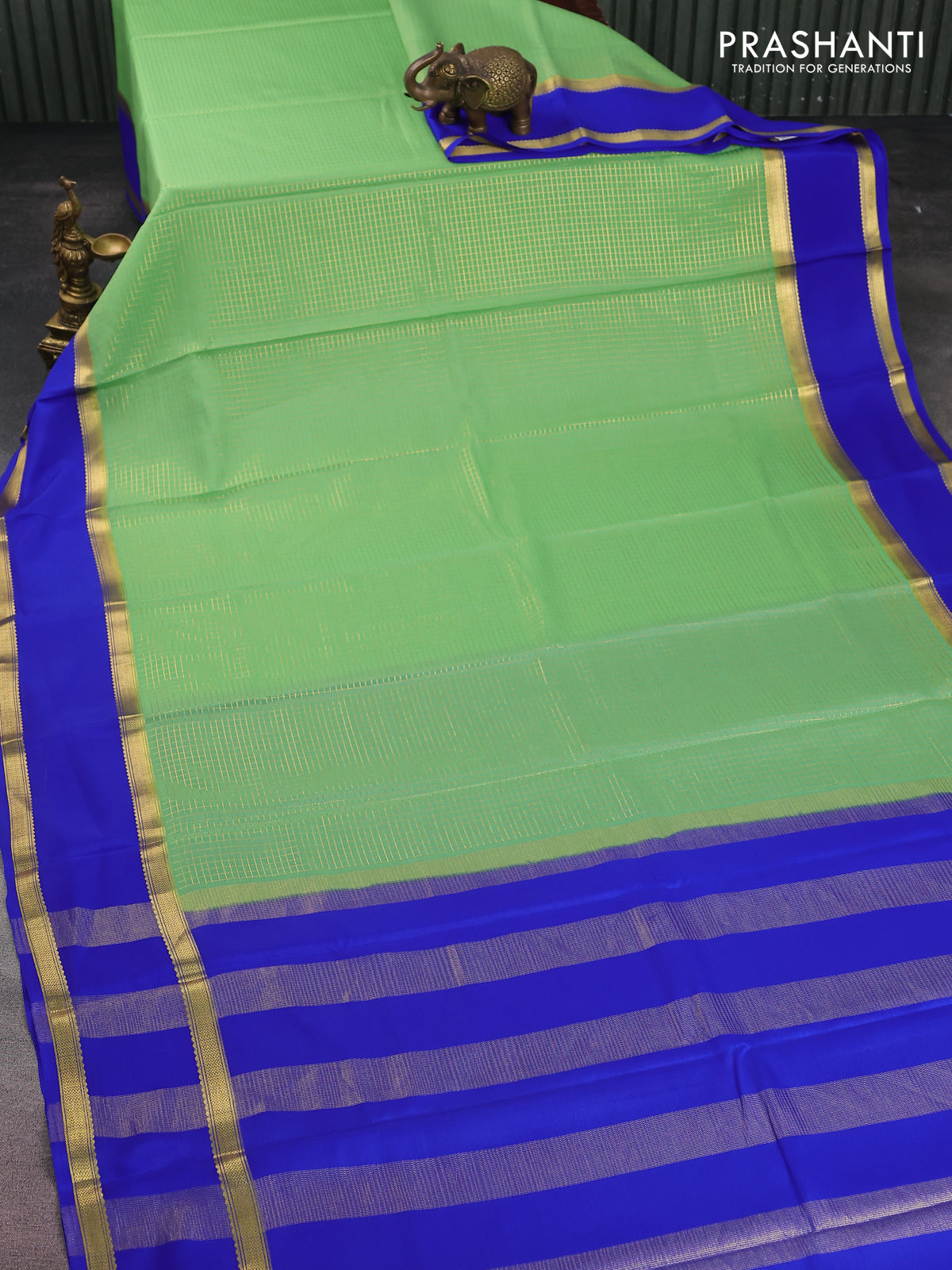 Pure mysore silk saree pista green and royal blue with allover small zari checked pattern and rettapet zari woven border