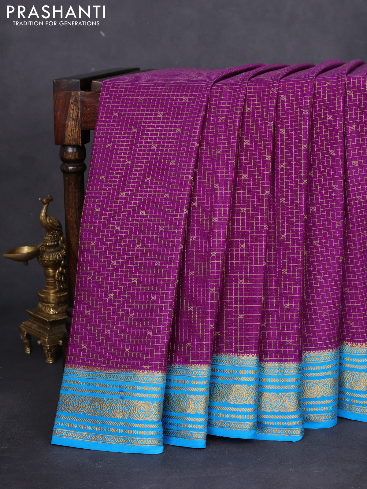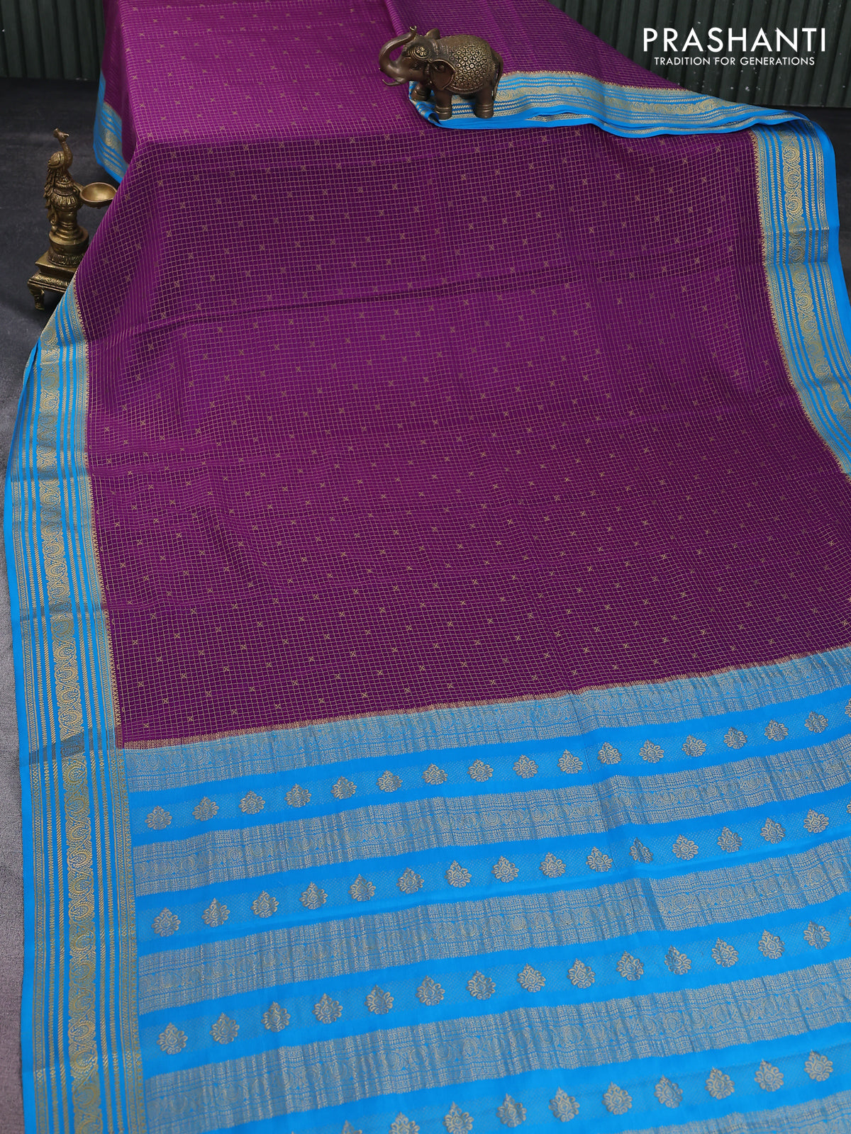 Pure mysore silk saree purple and cs blue with allover zari checks & buttas and zari woven border