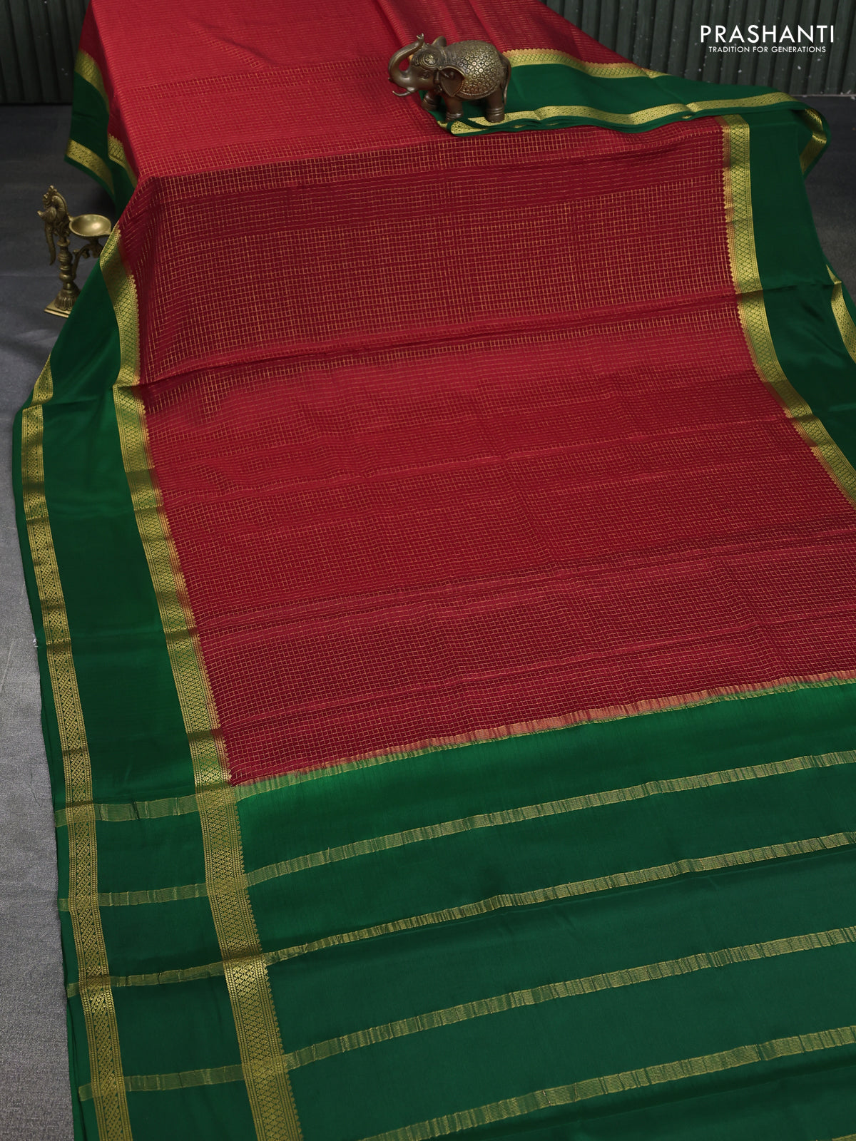 Pure mysore silk saree red and green with allover zari checked pattern and rettapet zari woven border