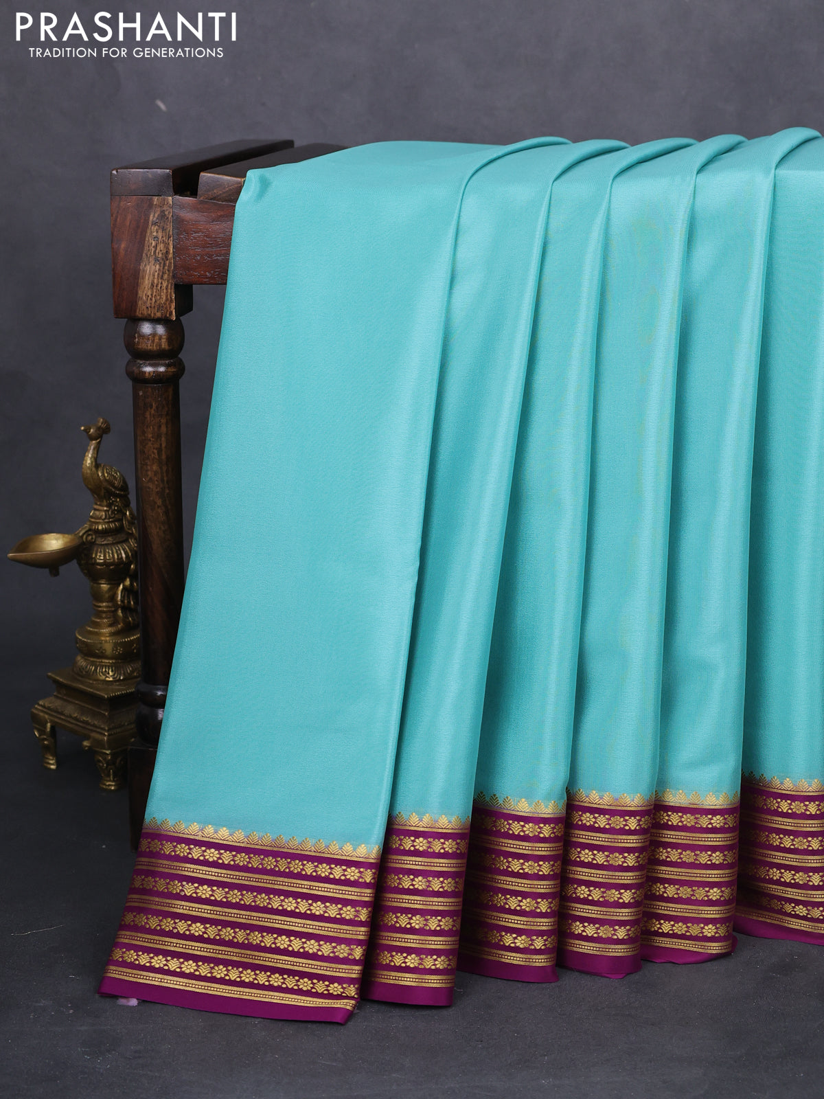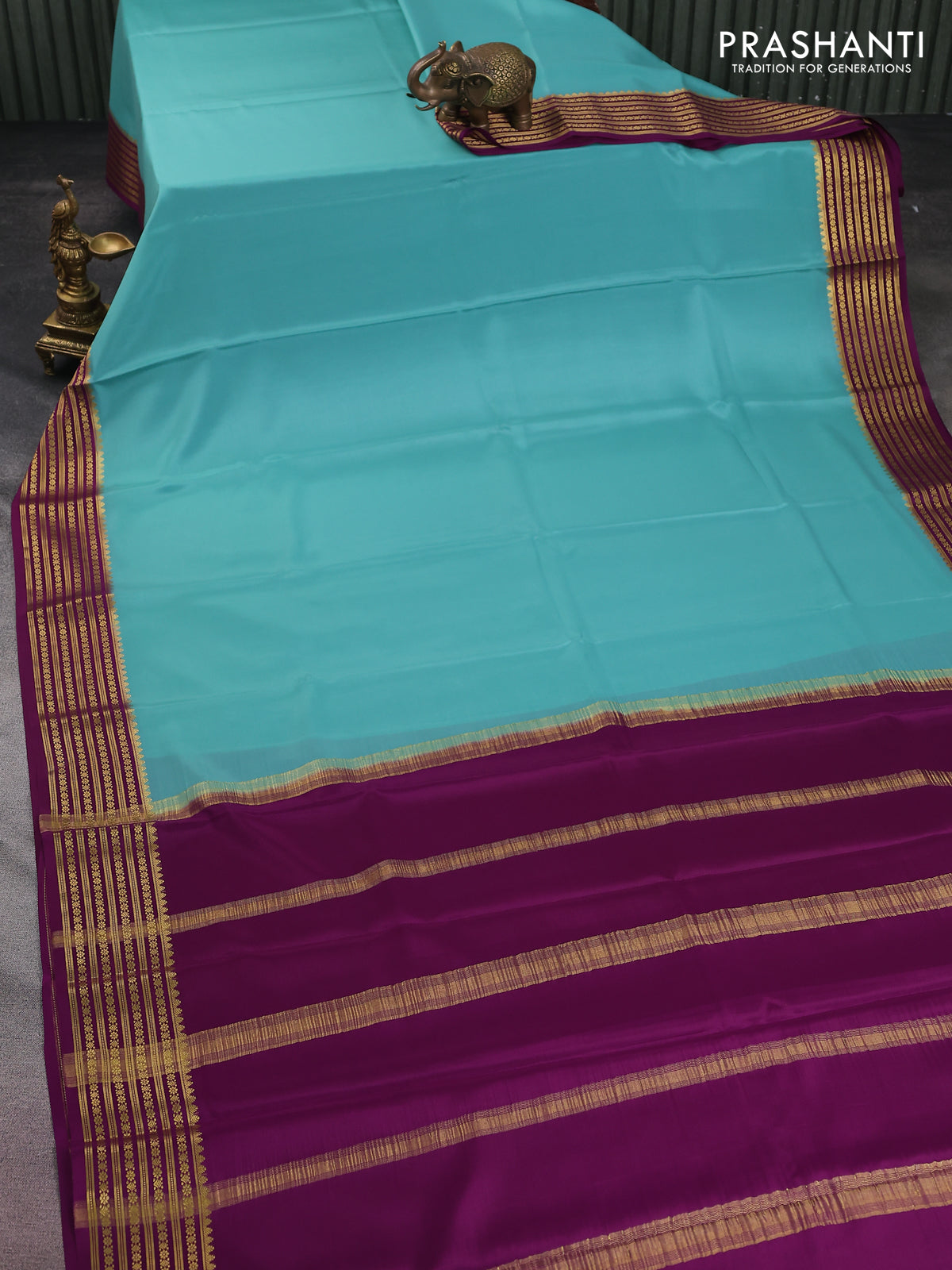 Pure mysore silk saree teal blue and purple with plain body and zari woven border