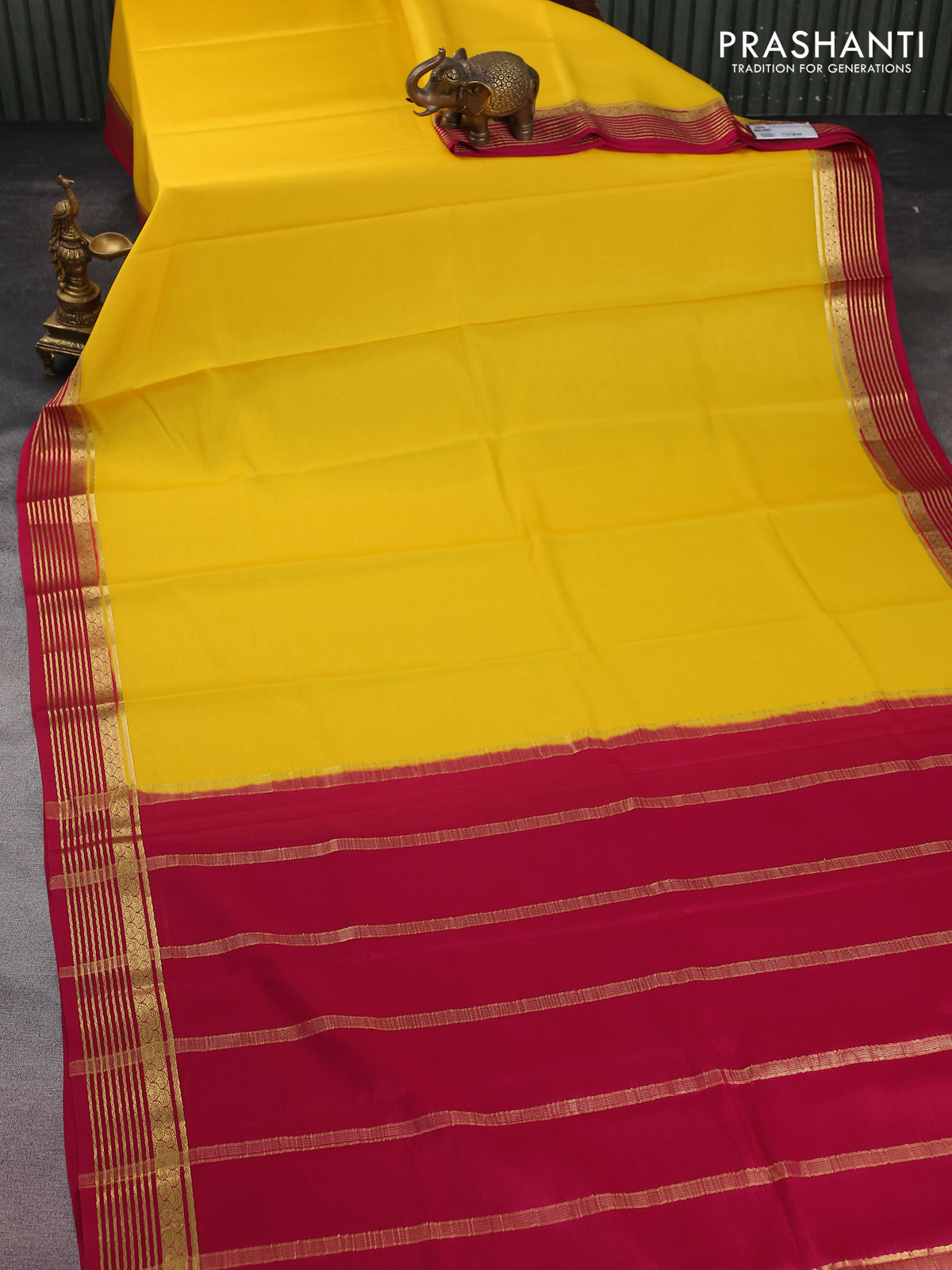 Pure mysore silk saree yellow and dark pink with plain body and zari woven border