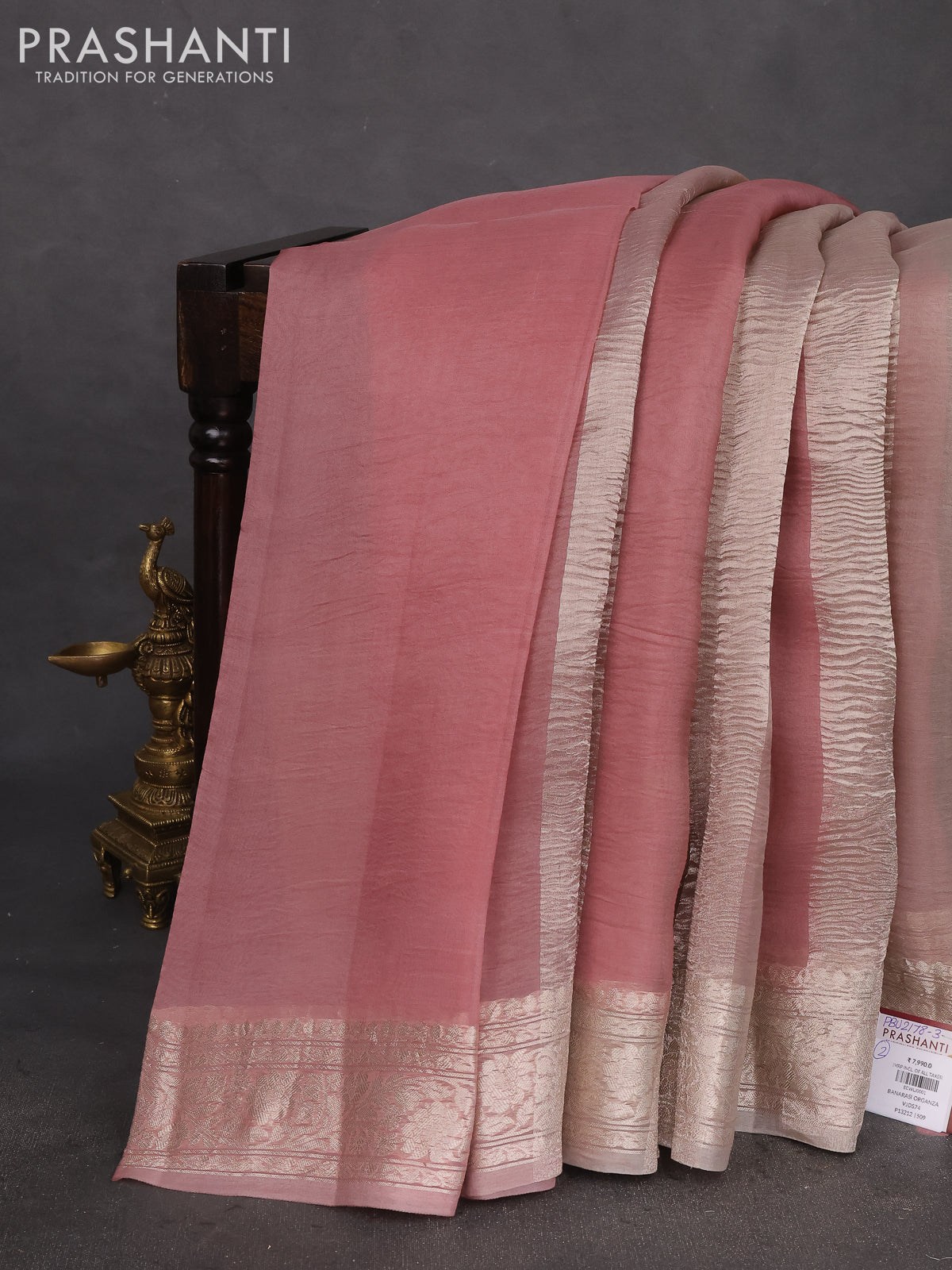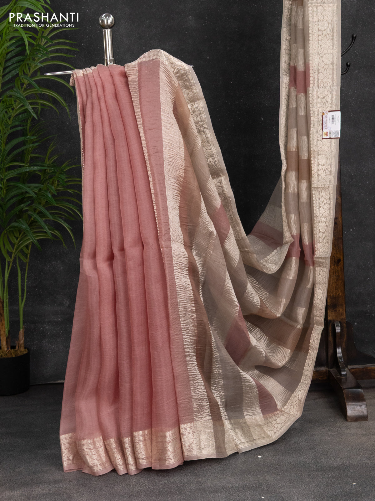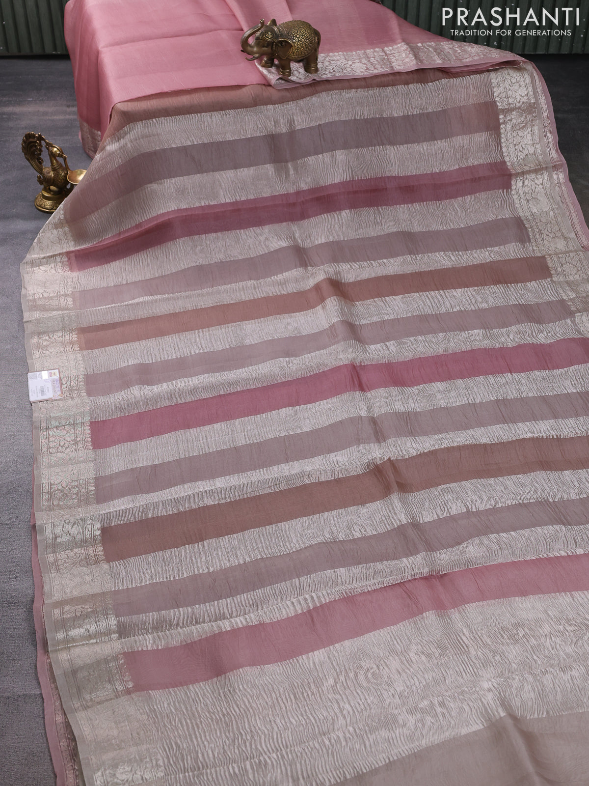 Pure organza partly silk saree pastel peach and grey shade with silver zari stripe pattern and silver zari woven border