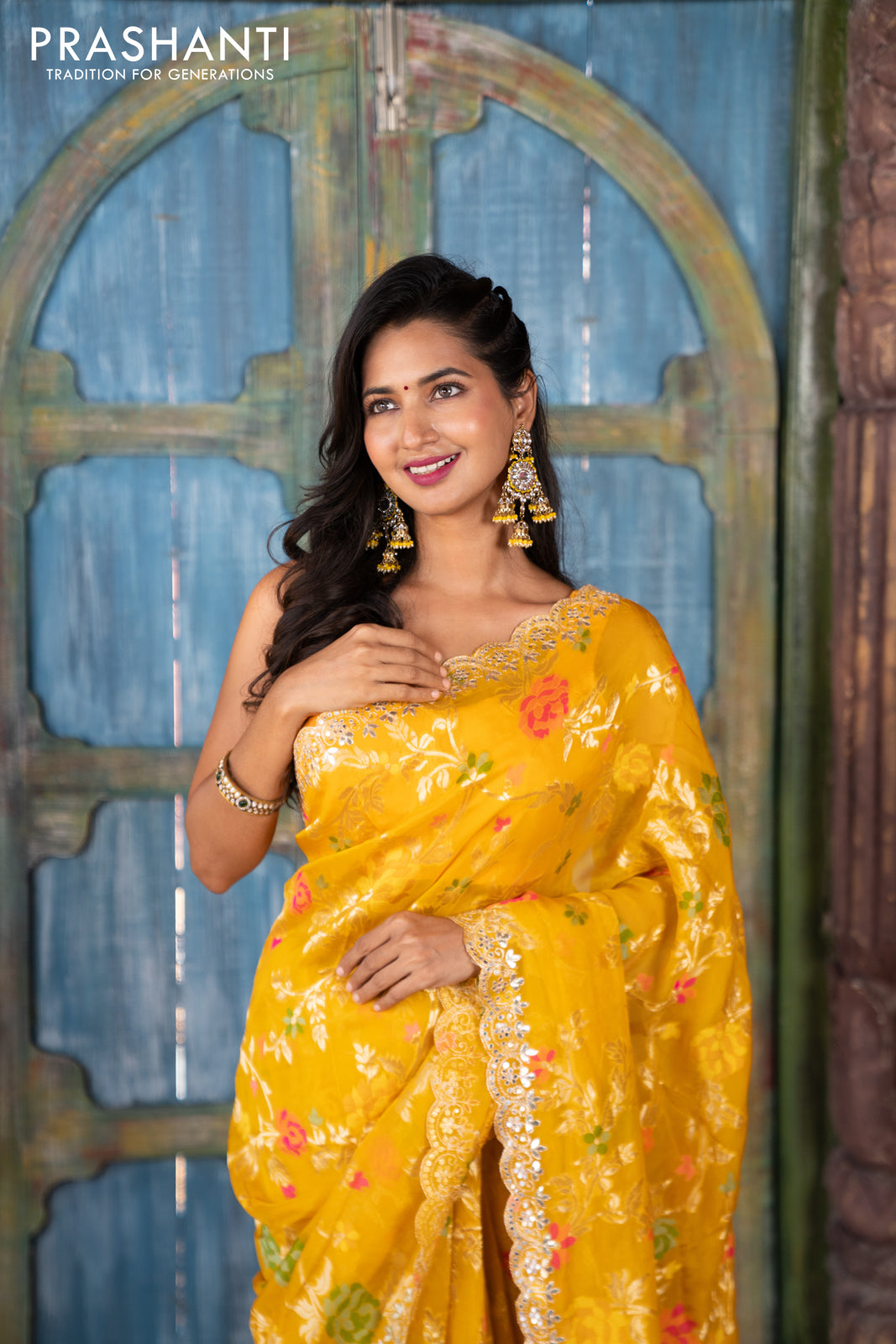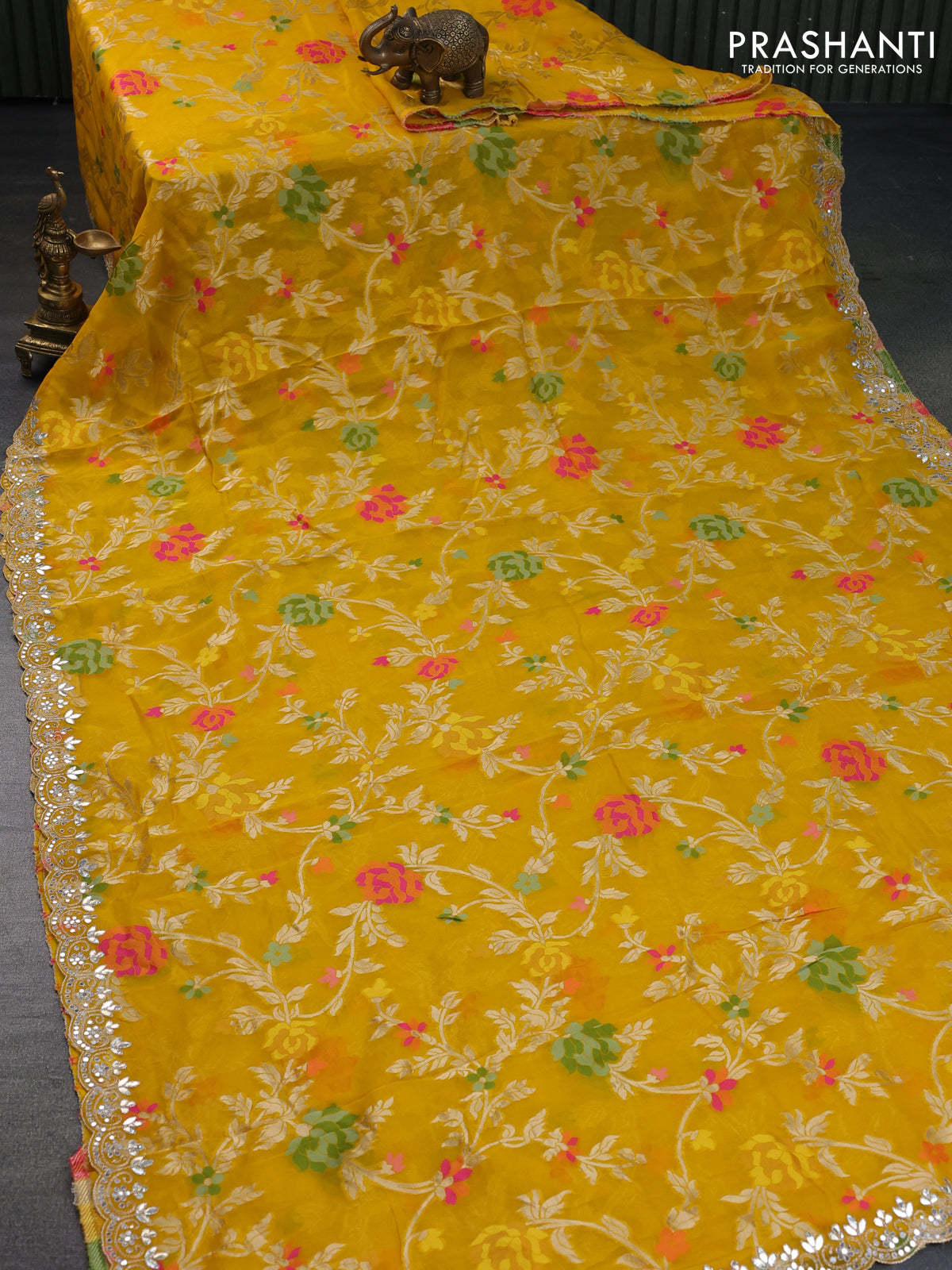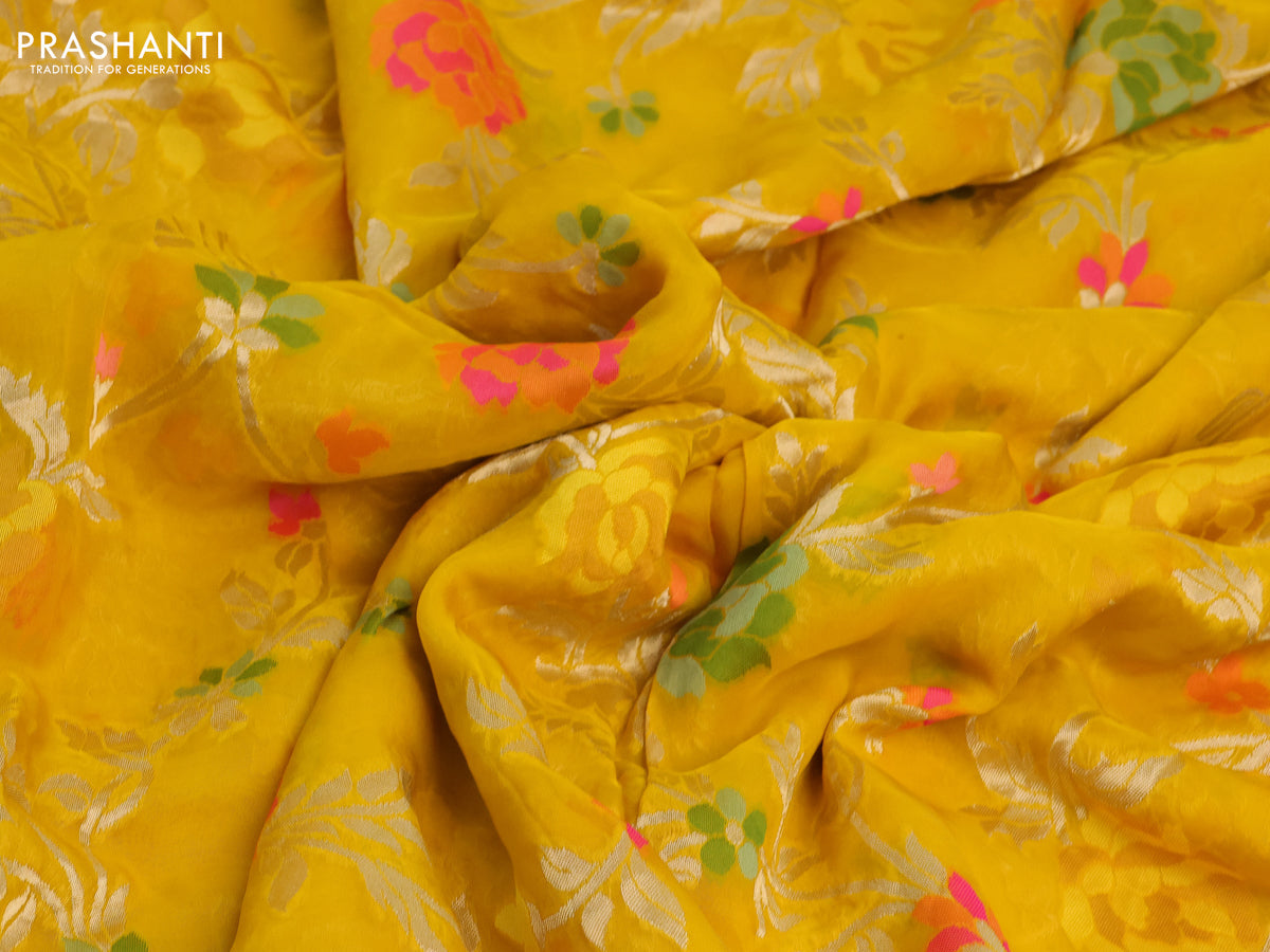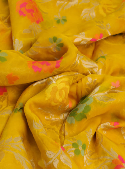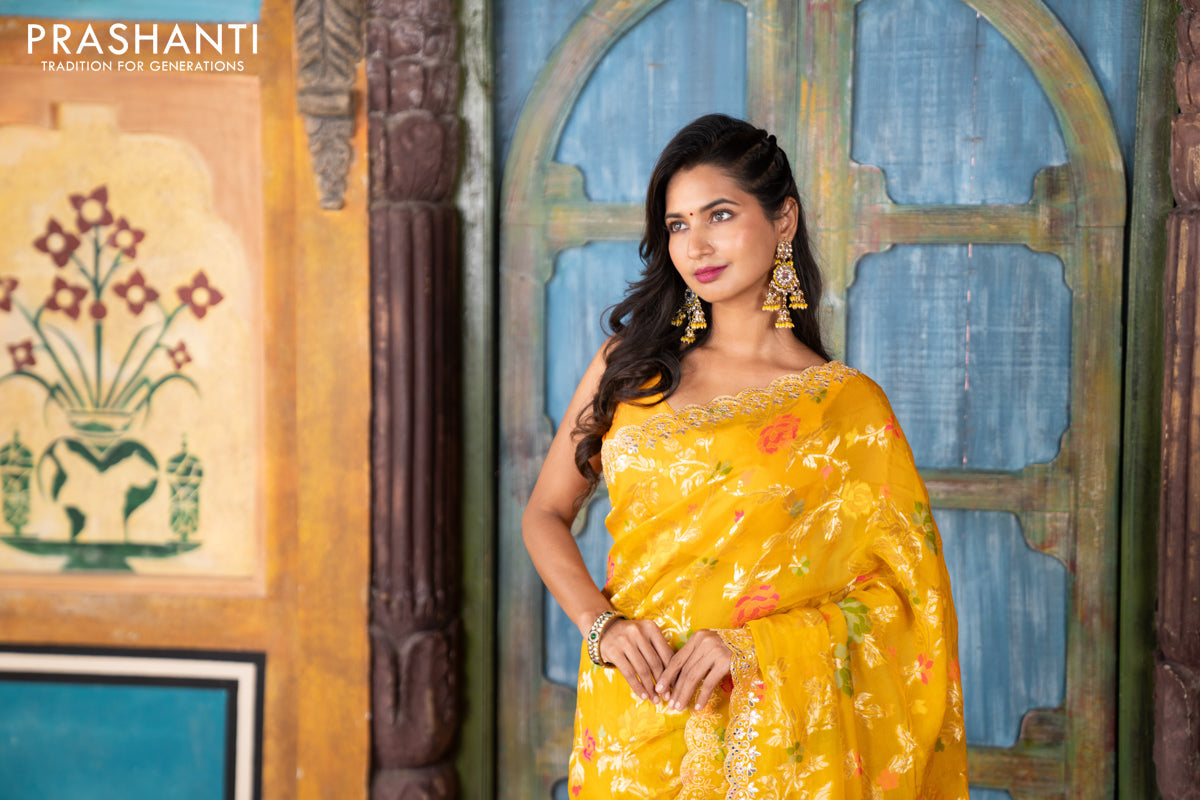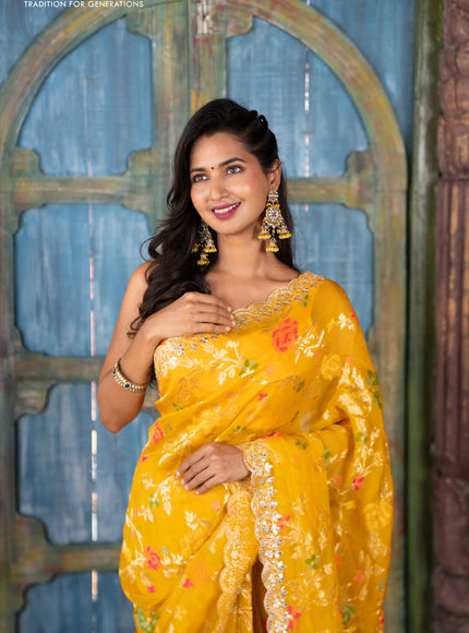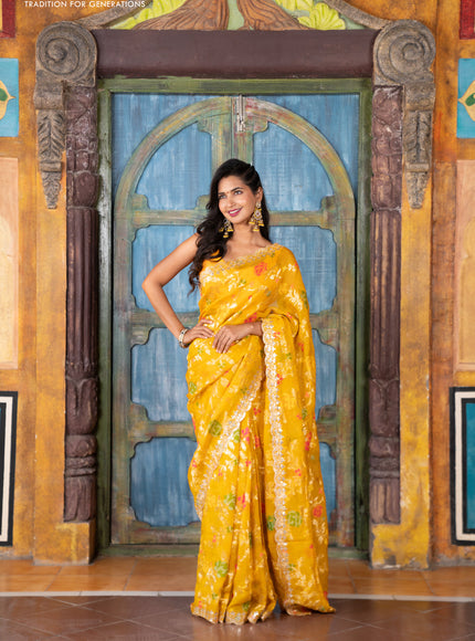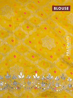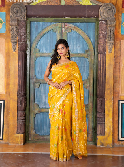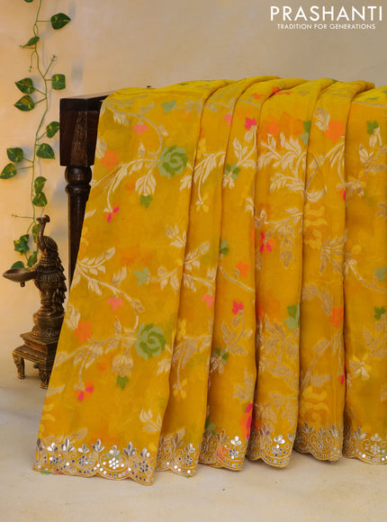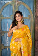 Pure organza silk saree mustard yellow with allover thread & zari weaves and gottapatti lace & mirror work border