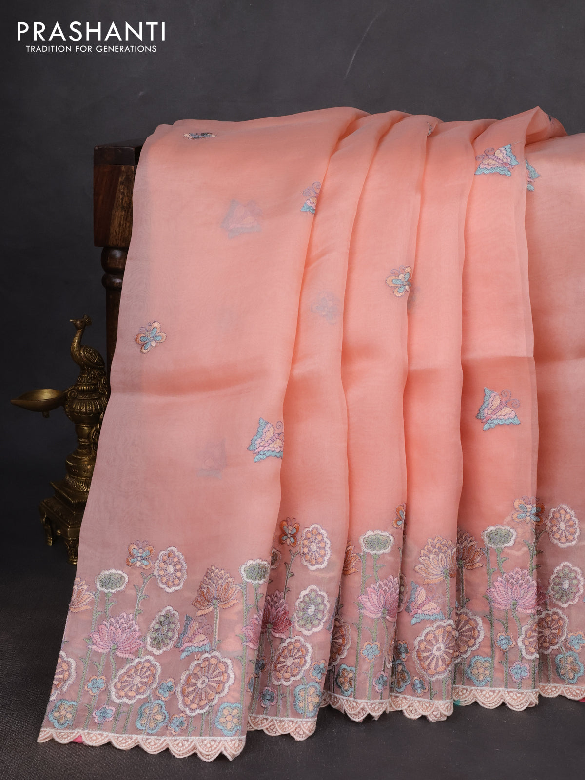 Pure organza silk saree peach shade with butterfly embroidery buttas and embroidery border