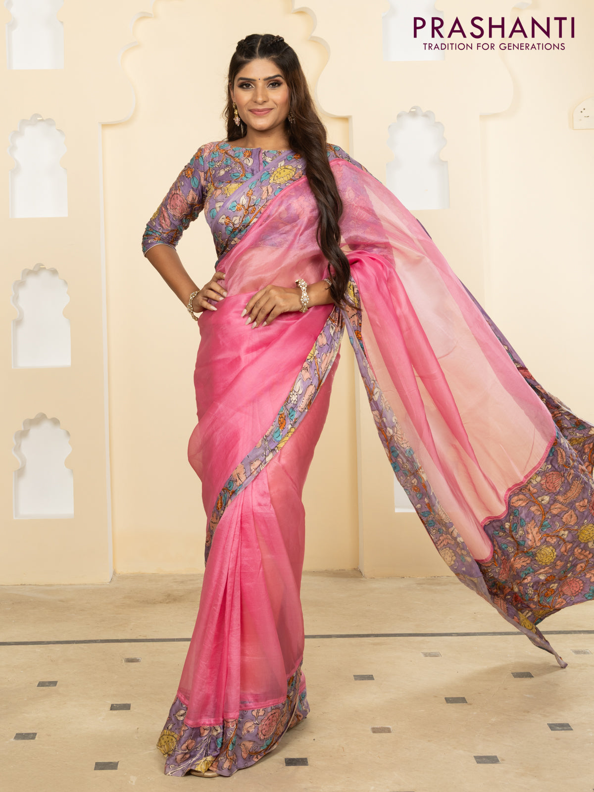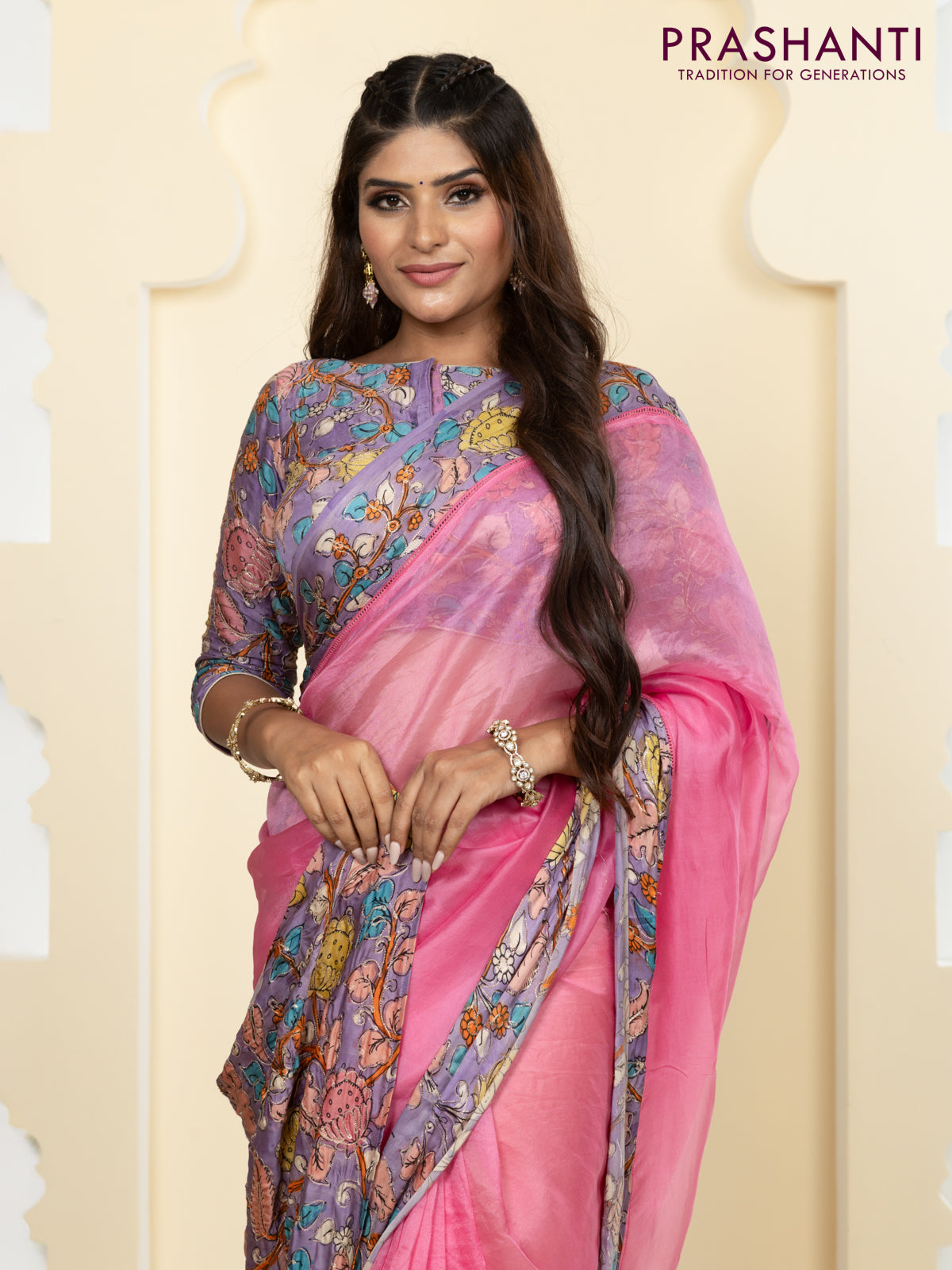 Pure organza silk saree pink and lavender with plain body and kalamkari printed pita work border