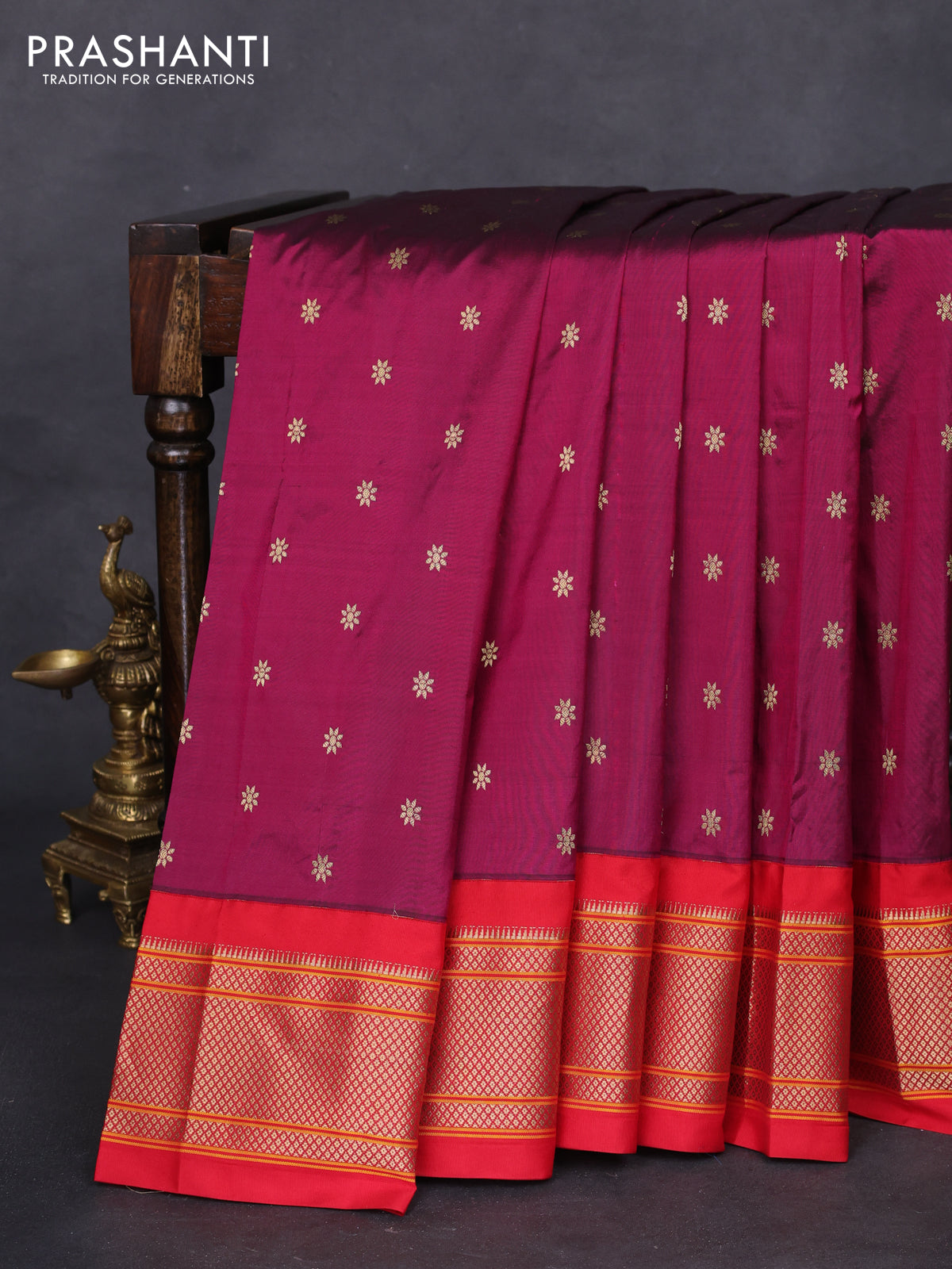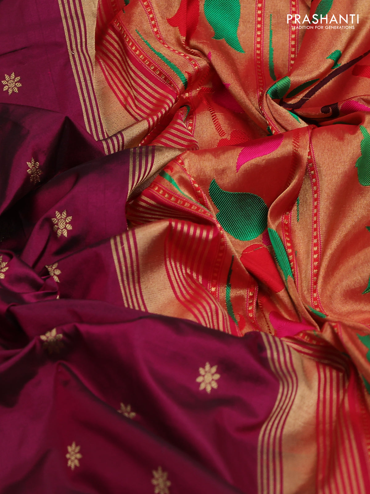Pure paithani silk saree dark magenta pink and red with allover zari woven buttas and paithani weaving pallu