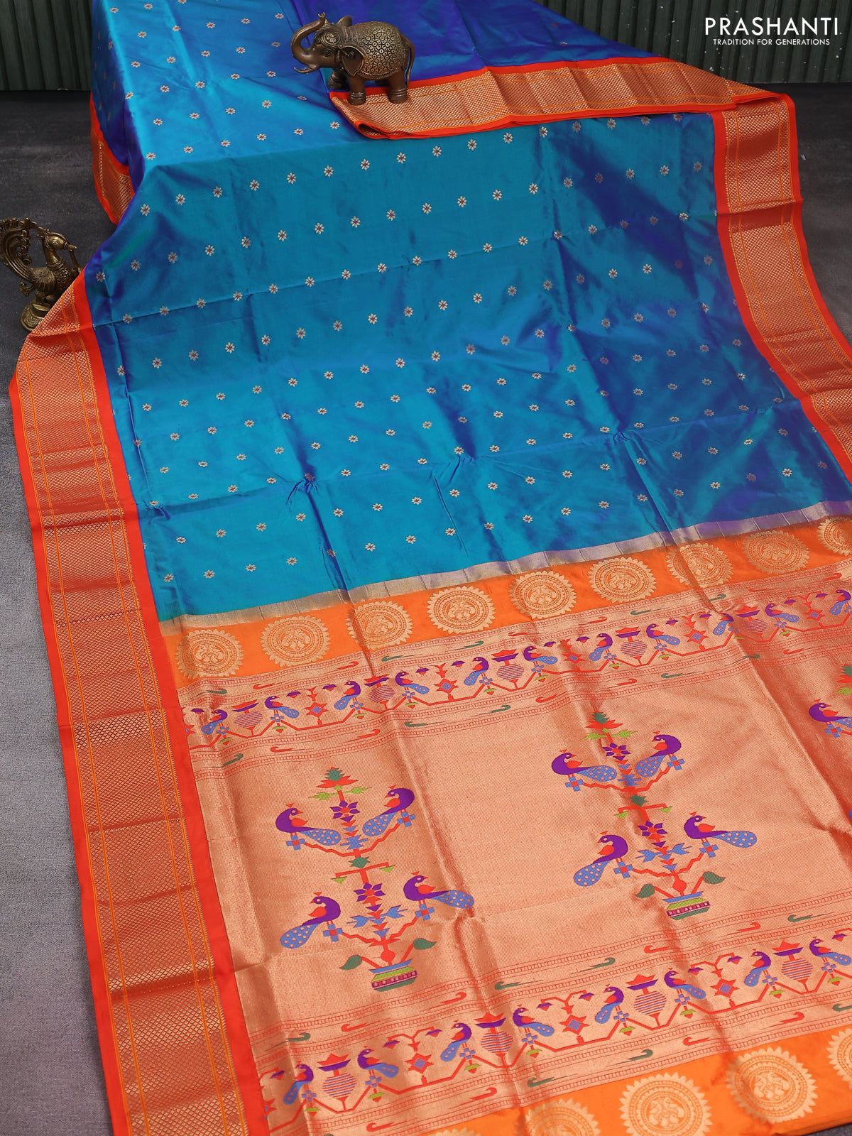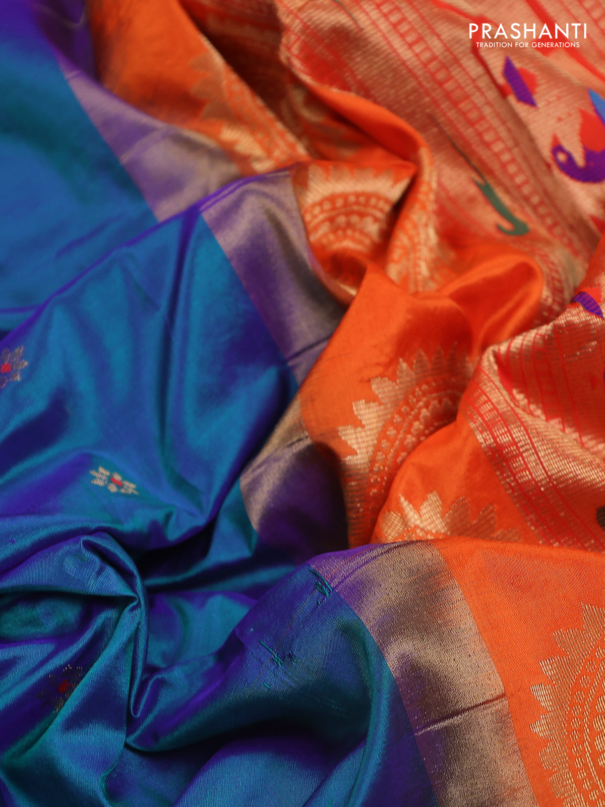 Pure paithani silk saree dual shade of bluish green and orange with allover zari woven floral buttas and paithani weaving pallu
