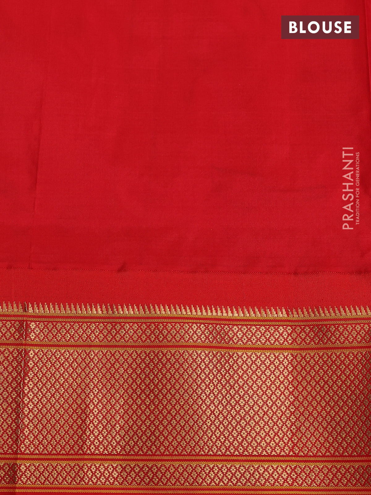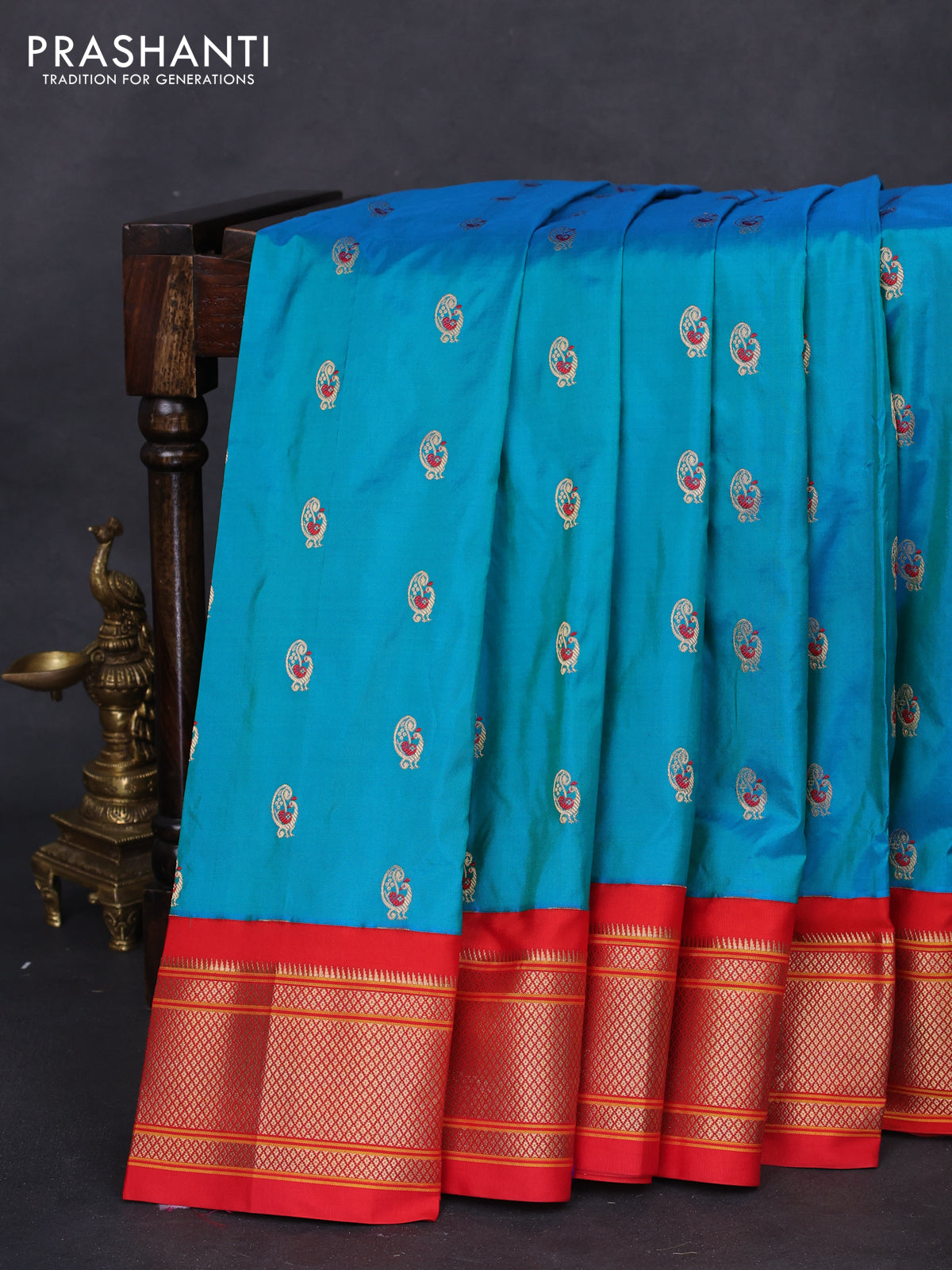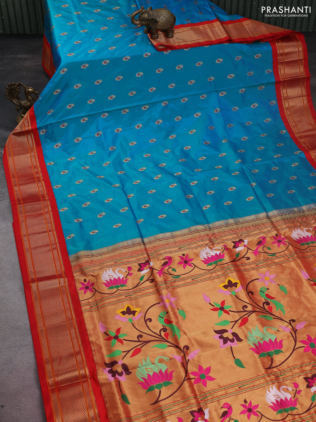 Pure paithani silk saree dual shade of teal blue and red with allover zari woven annam buttas and paithani weaving pallu