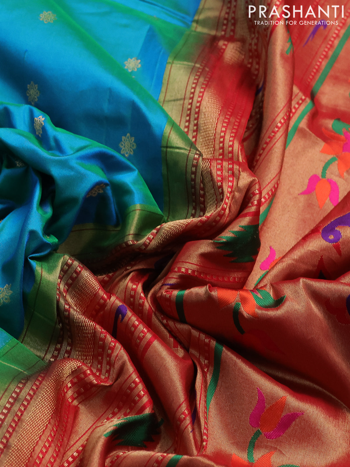 Pure paithani silk saree dual shade of teal bluish green and red with allover zari woven buttas and paithani weaving pallu