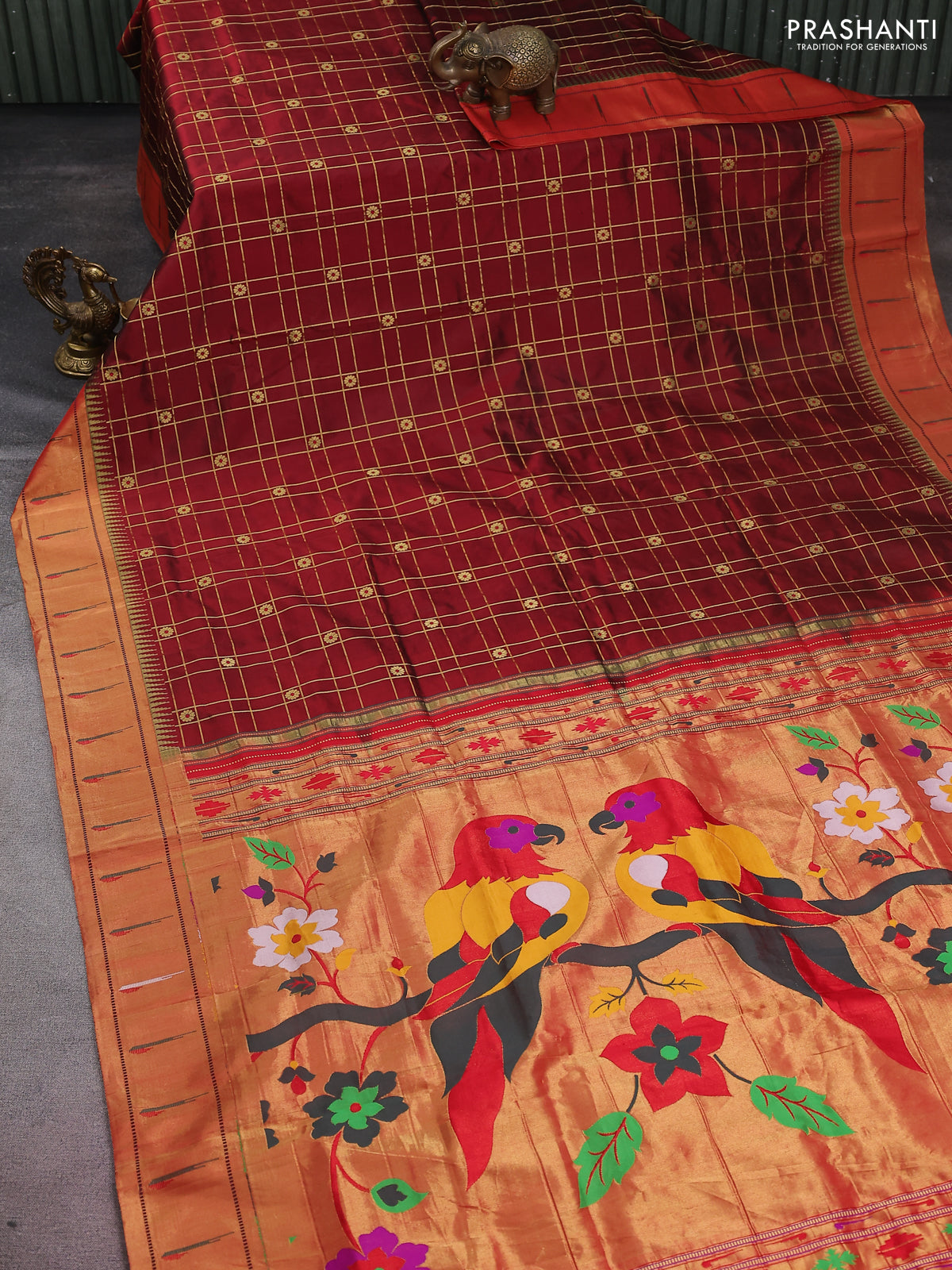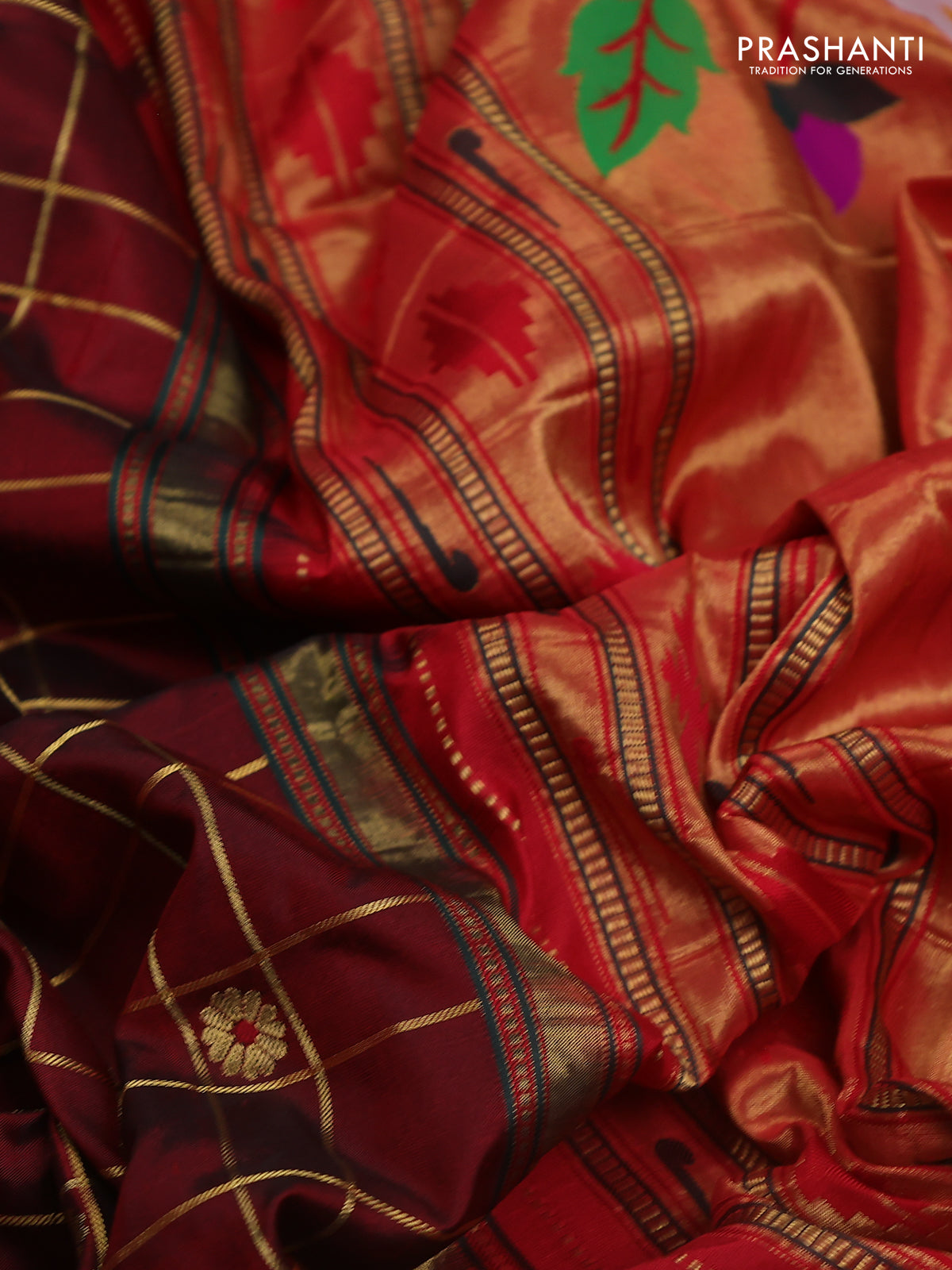 Pure paithani silk saree maroon and red with allover zari checks & buttas and paithani weaving pallu