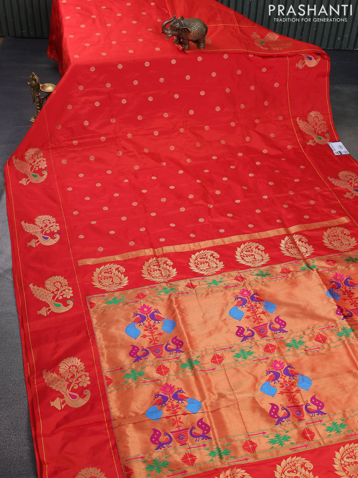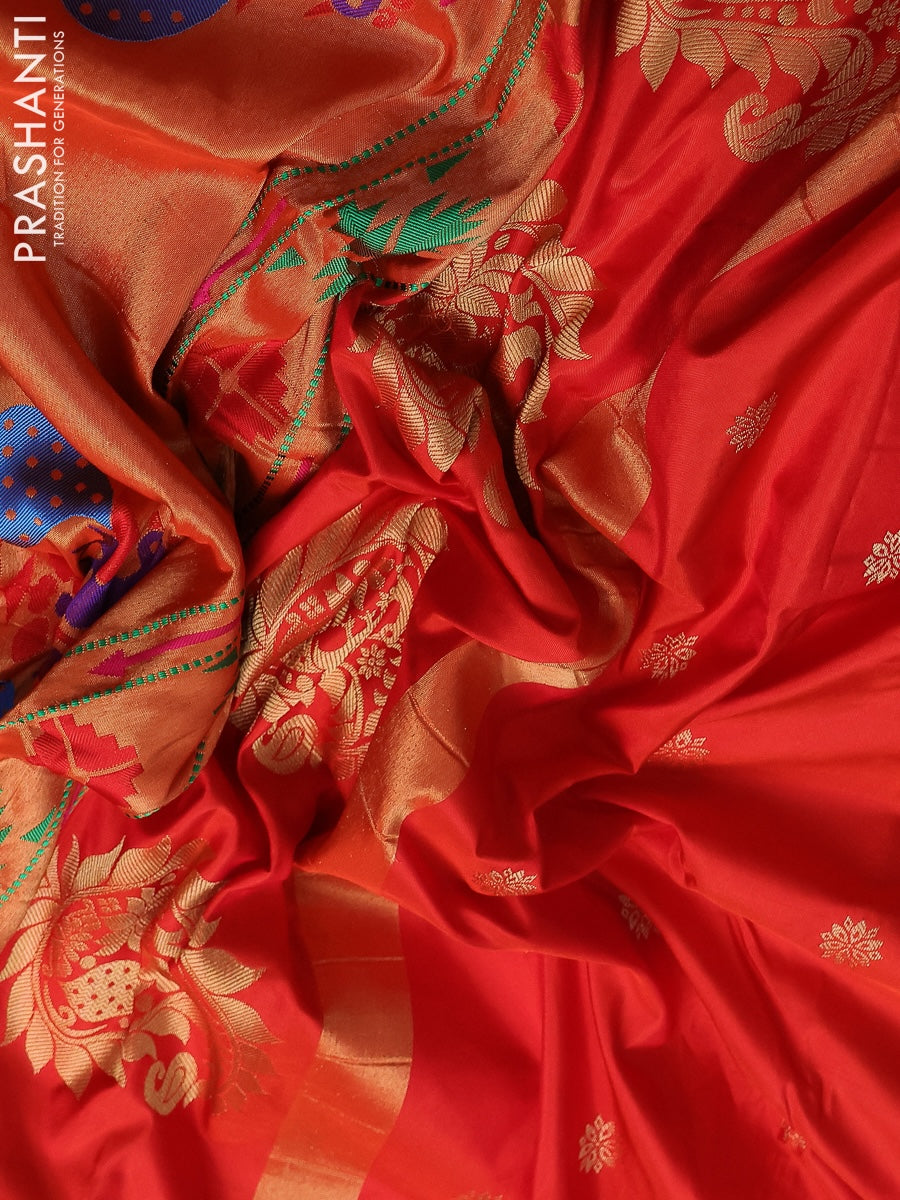 Pure paithani silk saree orange with allover zari woven floral buttas and paithani weaving pallu