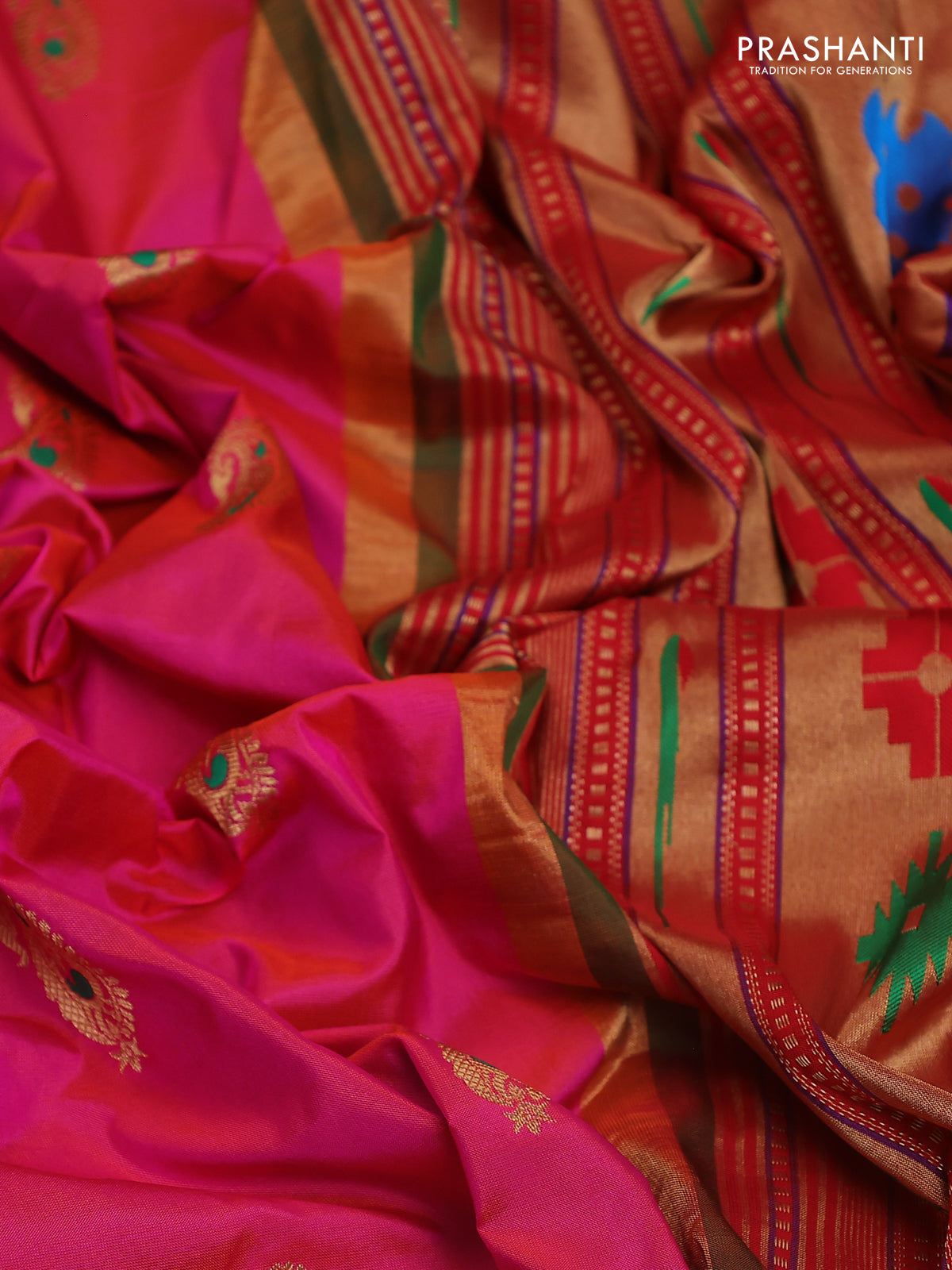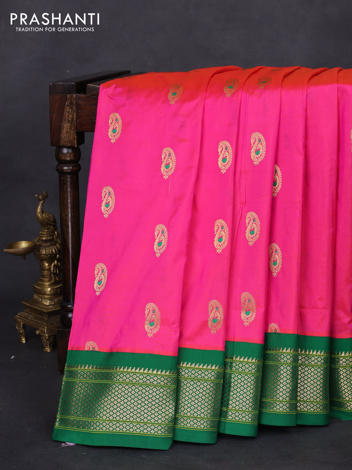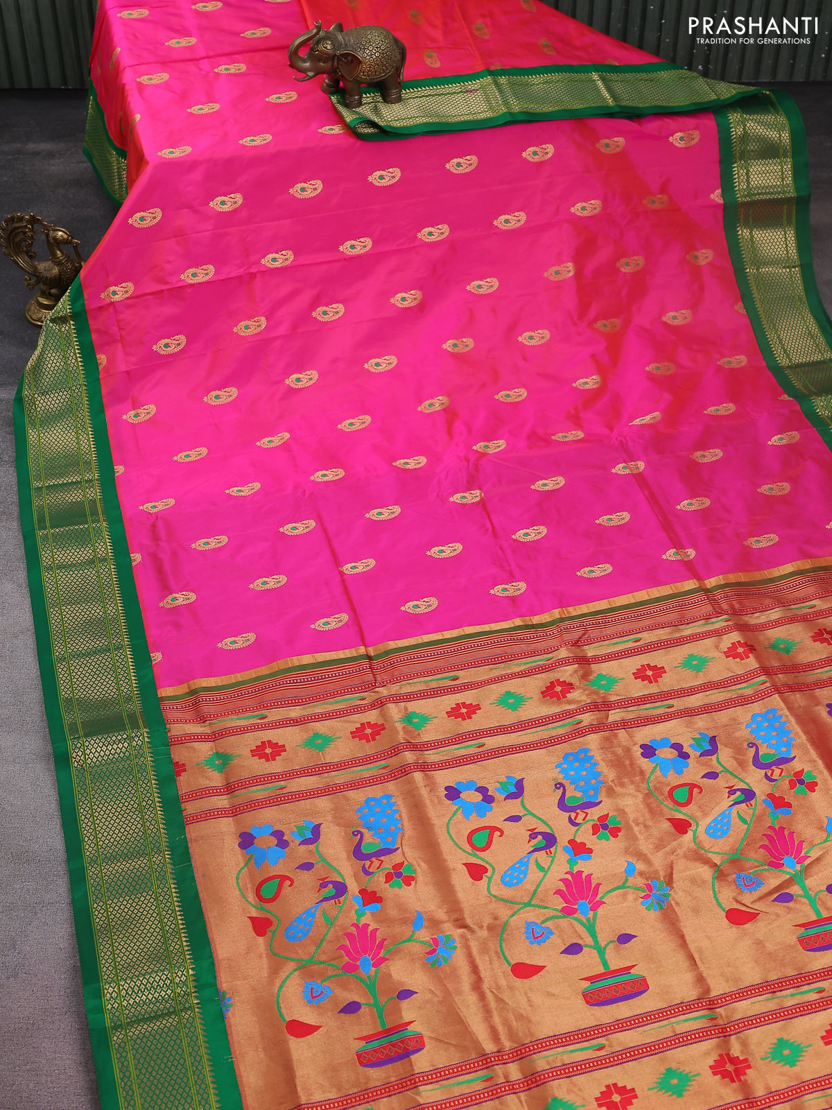 Pure paithani silk saree pink and green with allover zari woven paisley buttas and paithani weaving pallu