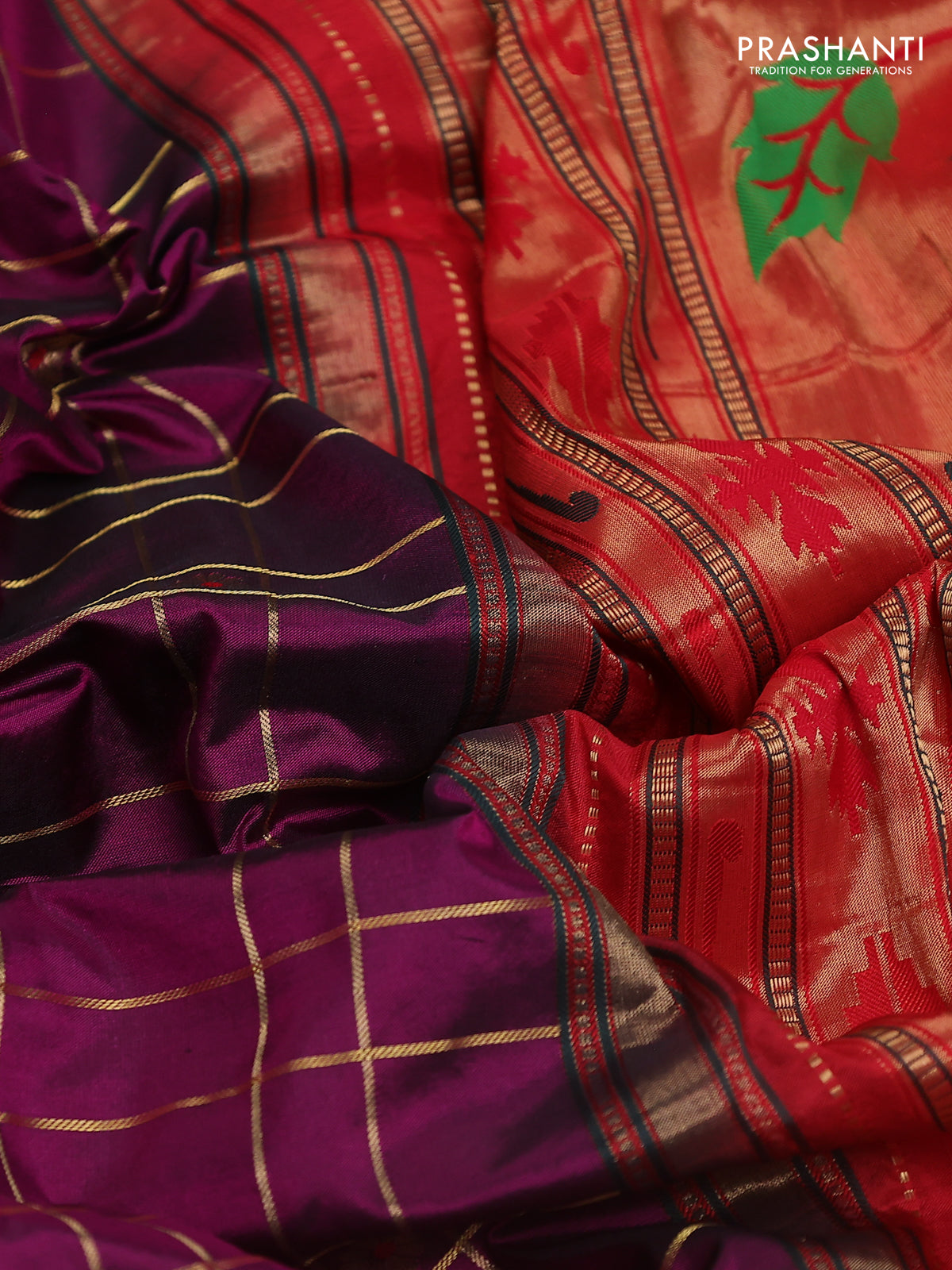 Pure paithani silk saree purple and red with allover zari checks & buttas and paithani weaving pallu