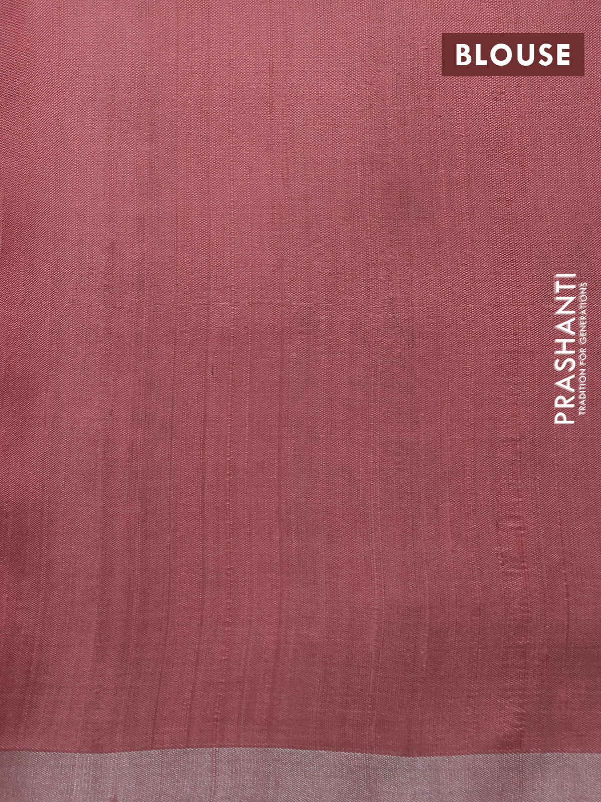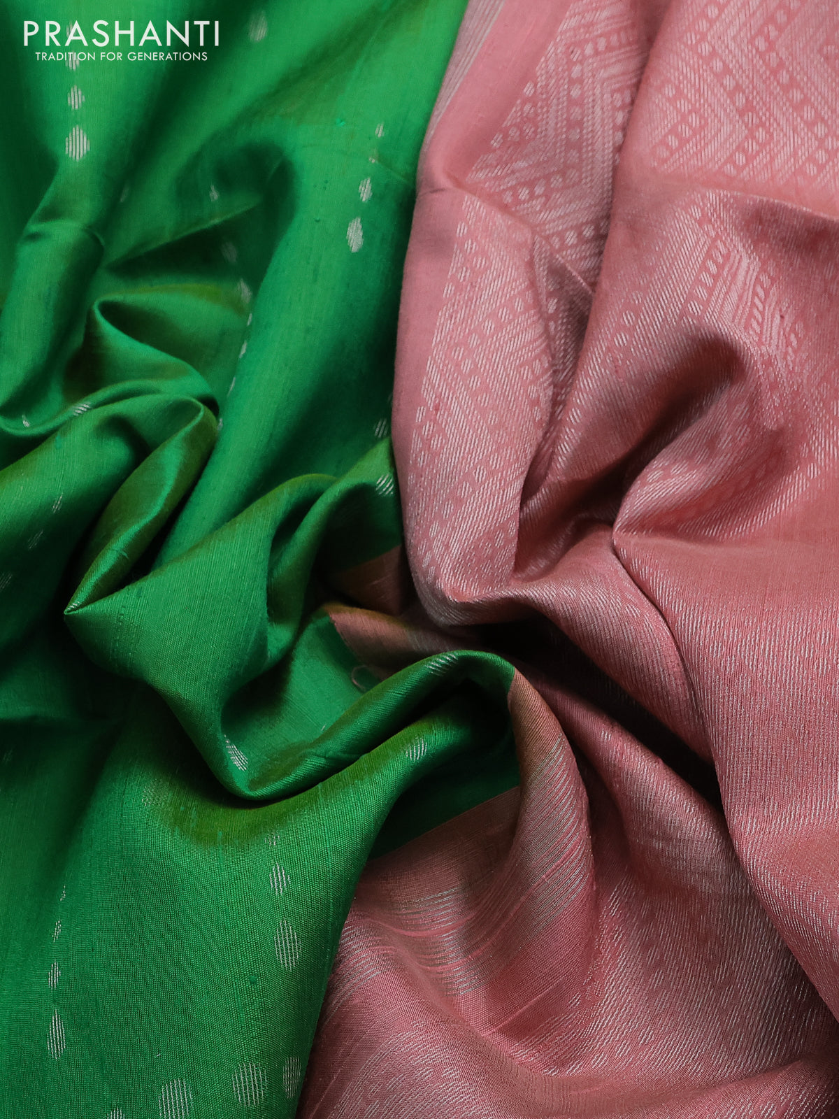 Pure raw silk saree green and pastel peach with allover silver zari woven buttas and silver zari woven border