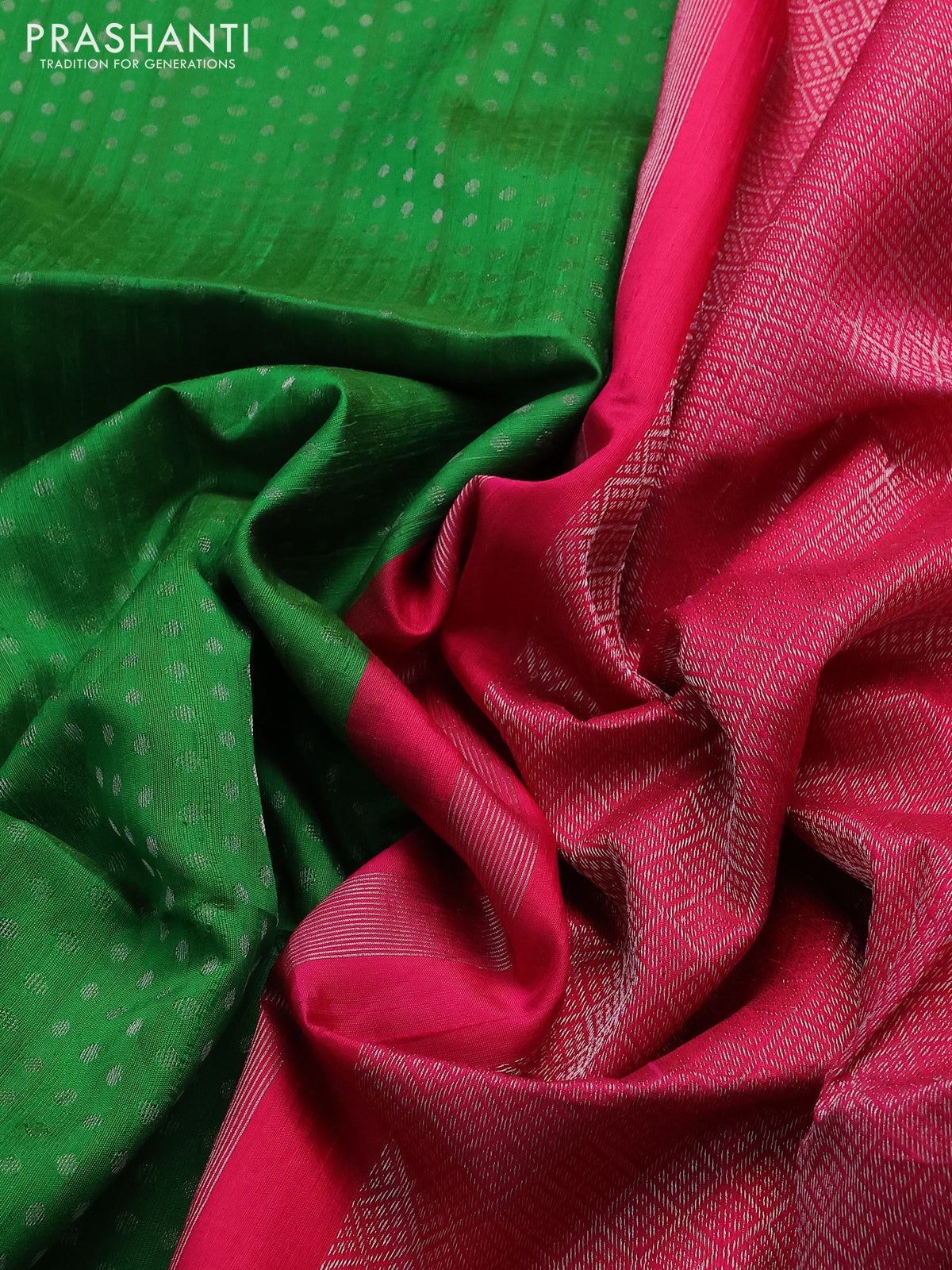 Pure raw silk saree green and pink with allover silver zari woevn 1000 buttas in borderless style