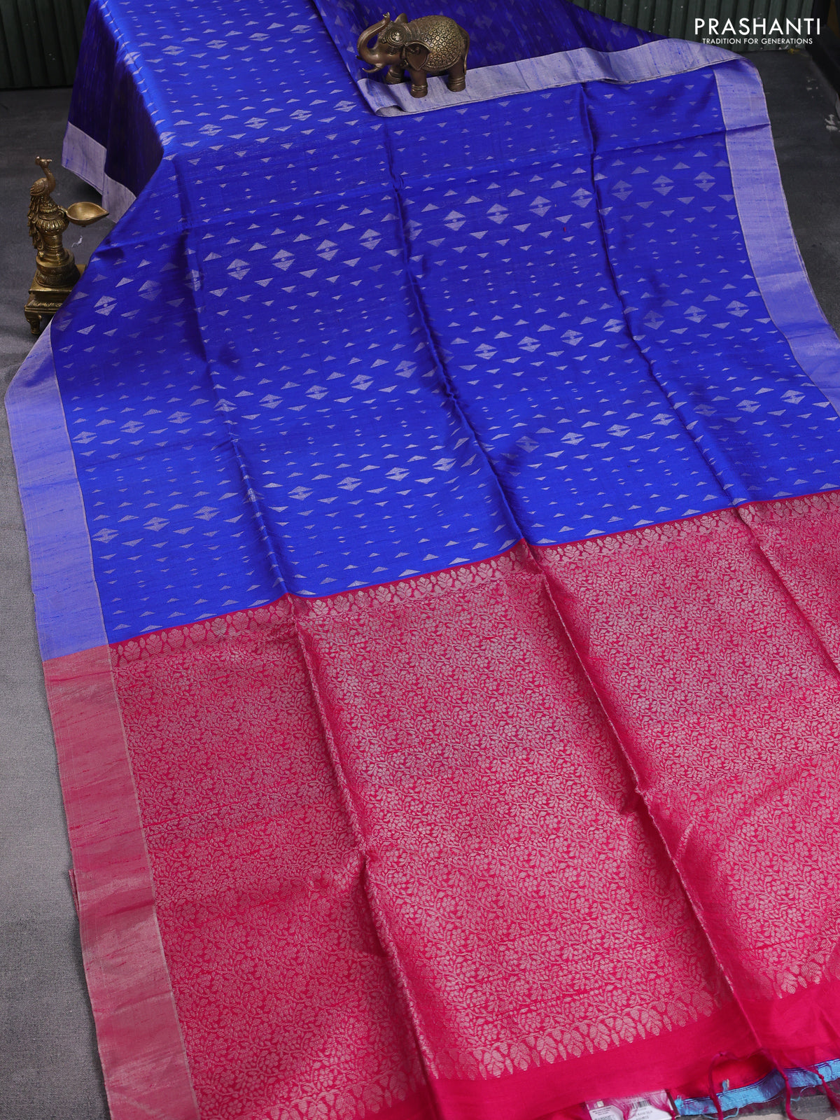 Pure raw silk saree royal blue and pink with allover silver zari woven geometric buttas and zari woven border
