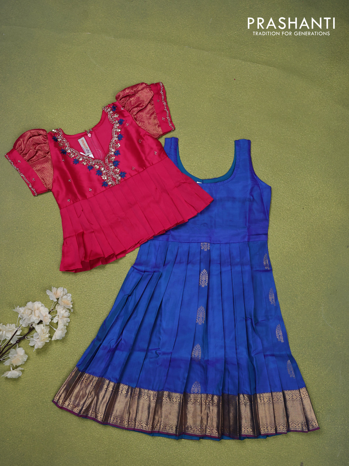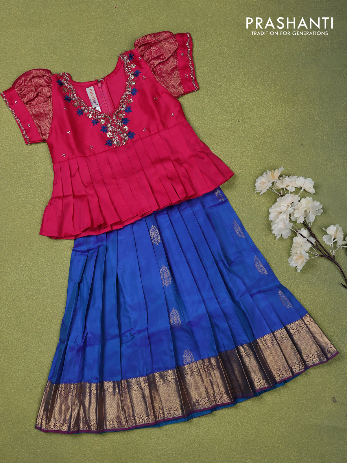 Pure silk kids lehenga pink and blue with embroidery beads work neck pattern & puff sleeve and zari woven border for 3 years