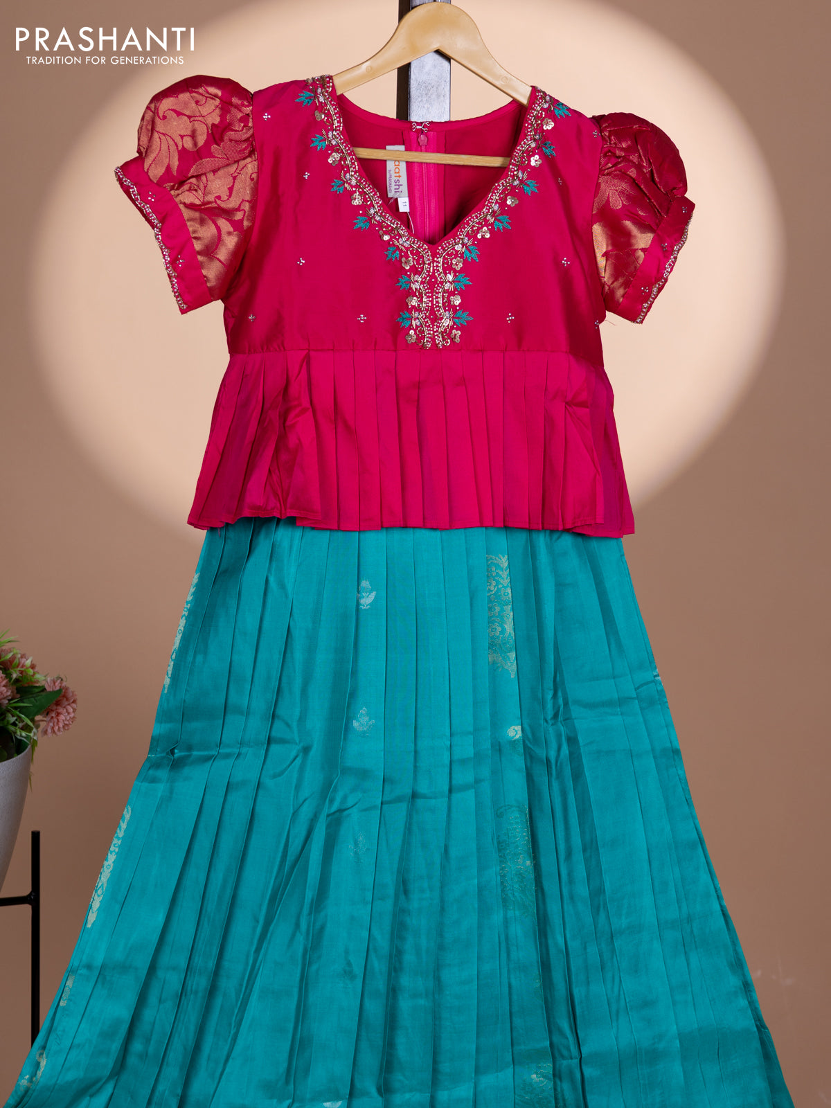 Pure silk kids lehenga pink and teal blue with embroidery beads work neck pattern & puff sleeve and zari woven border for 11 years