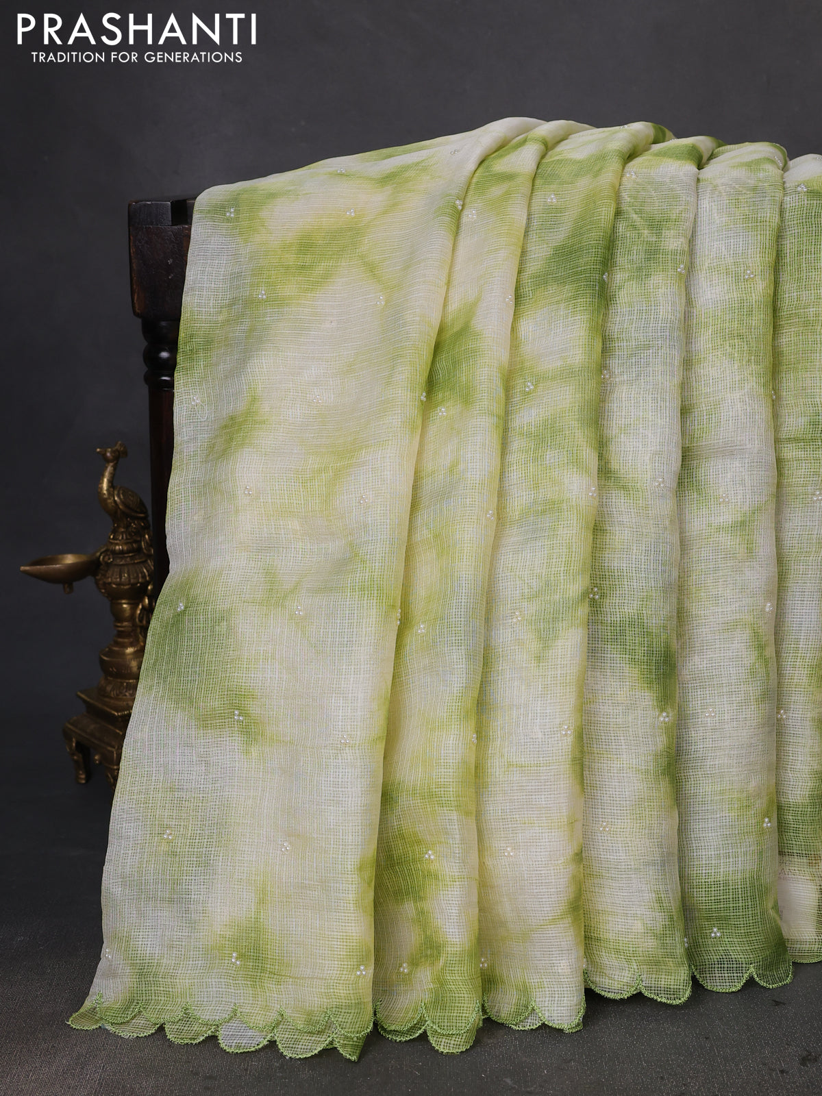 Pure silk kota saree cream and light green with tie & dye beads work and embroidery scallop border Embroidery blouse