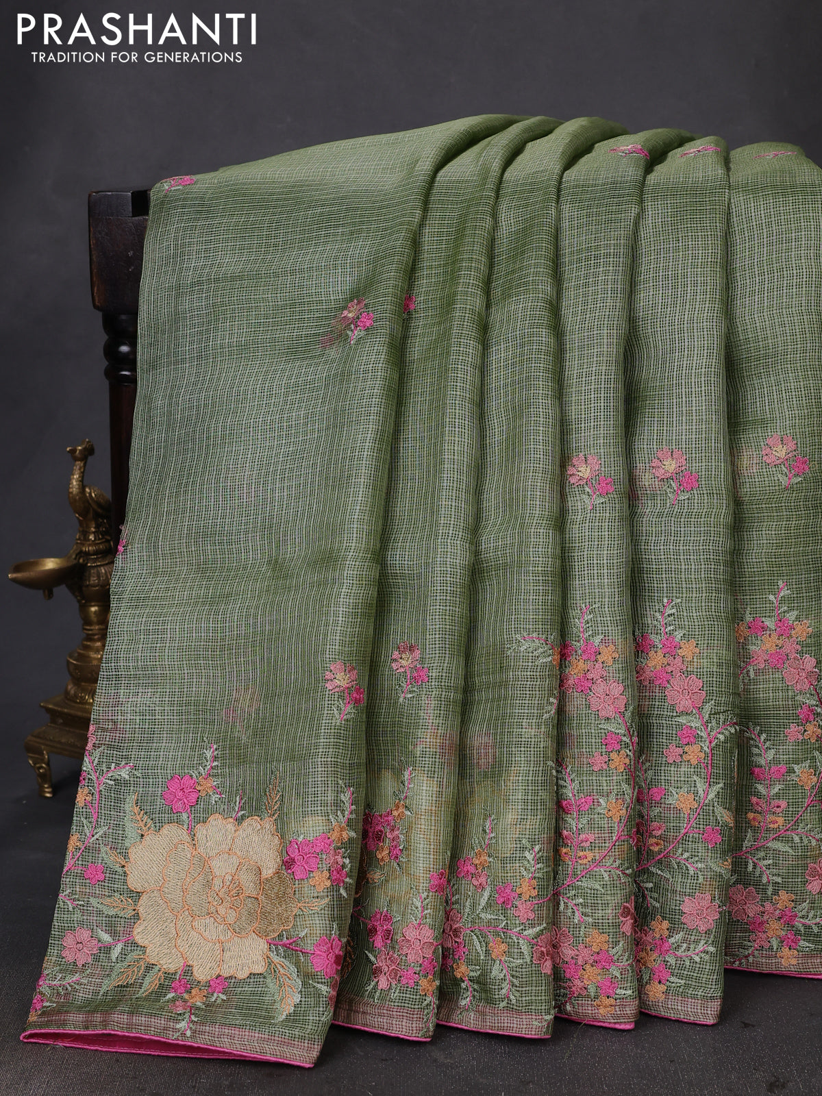 Pure silk kota saree pastel green and light pink with embroidery buttas and floral design embroidery border